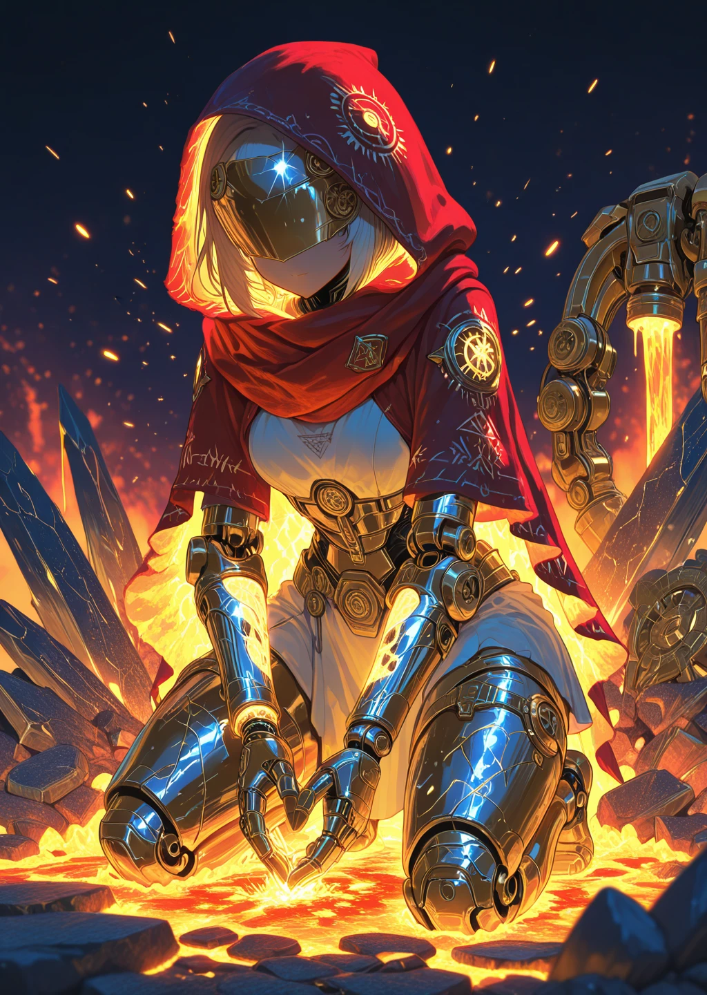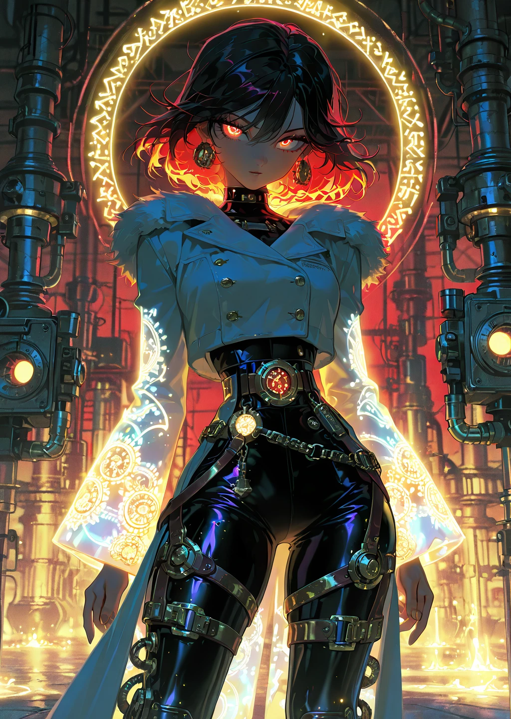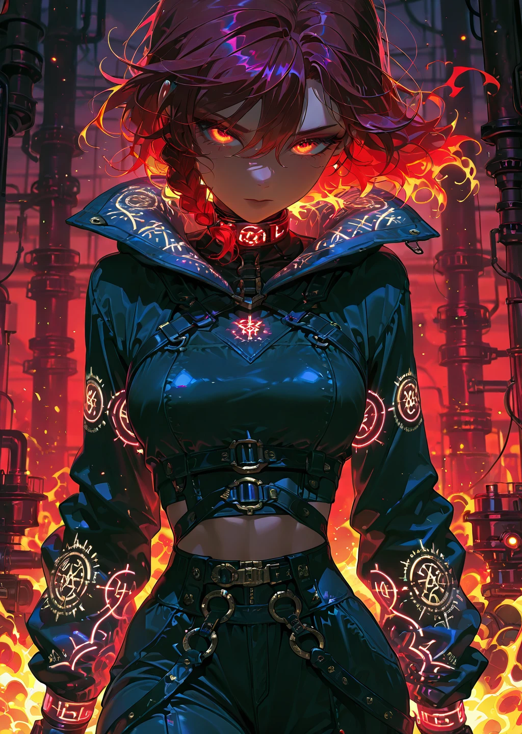 crimson_style,red accents,fiery glow,arcane runes,mechanical detailing,seductive,industrial workshopDescription: This style features deep crimson tones with arcane glowing accents in red. The clothing is form-fitting and seductive, with leather straps, mechanical accessories, and glowing runes etched into the fabric.