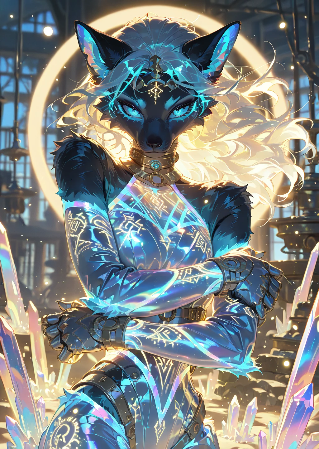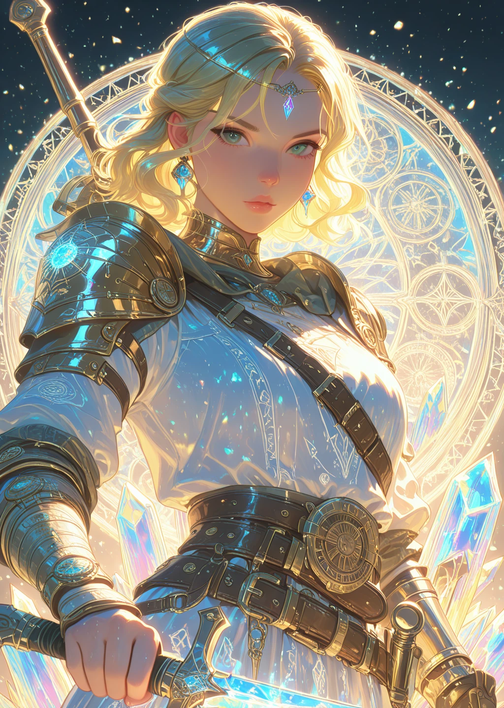 crystal_style,prismatic light,ethereal glow,crystalline attire,arcane symbols,shimmering,magical lightDescription: The crystal style is ethereal, with crystalline fabrics that reflect light and create shimmering magical effects. The outfit has prismatic accents, with arcane symbols glowing softly and magical particles floating around.