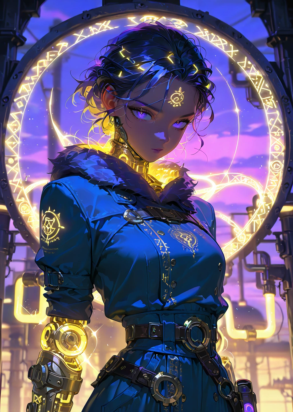 purple_and_yellow_style,gold accents,arcane glow,magical symbols,vibrant tones,futuristic attire,soft lightDescription: A luxurious combination of purple and yellow that gives the outfit a regal and mystical feel. The arcane runes glow in yellow, while the fabric has rich purple tones.