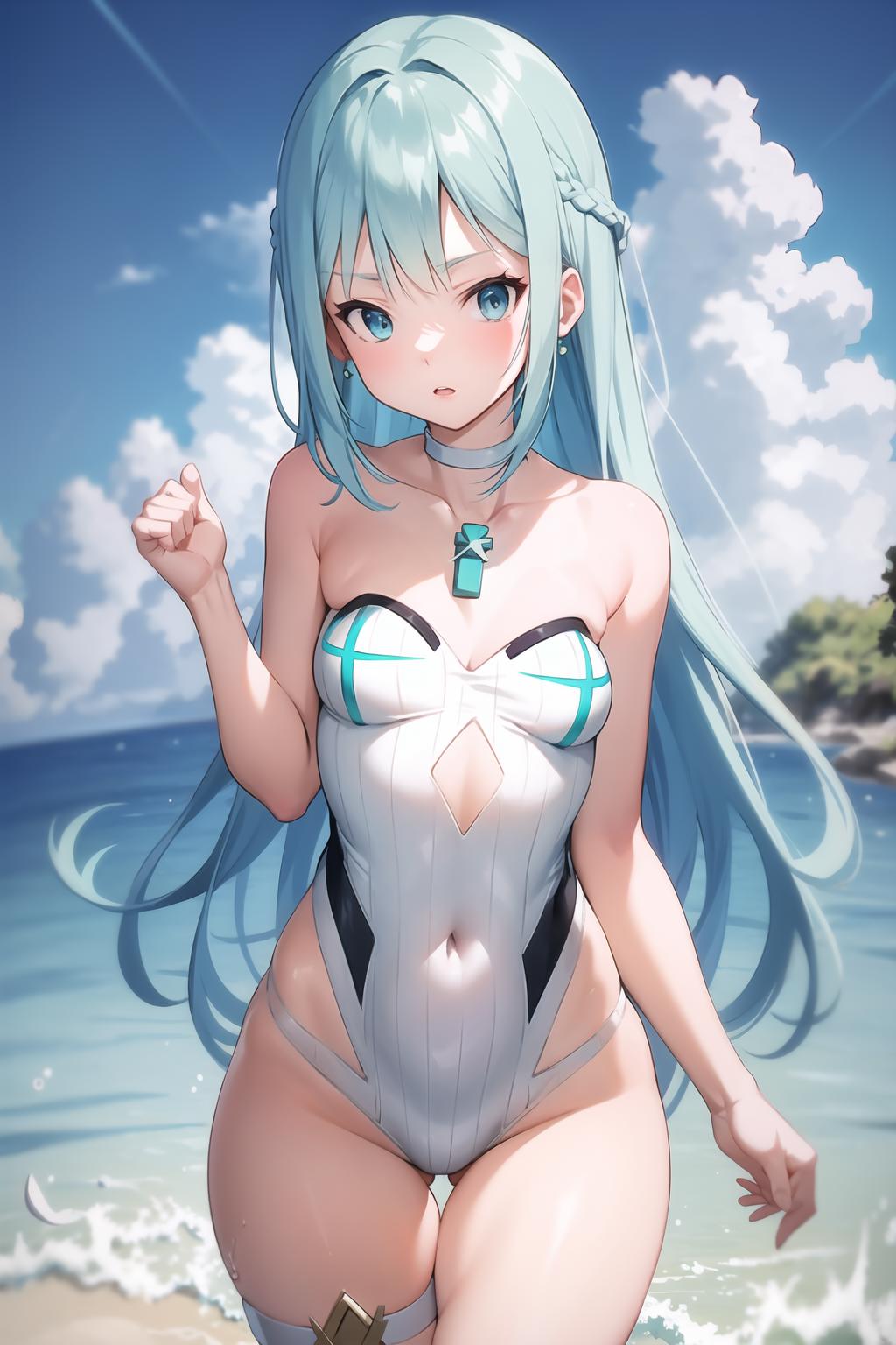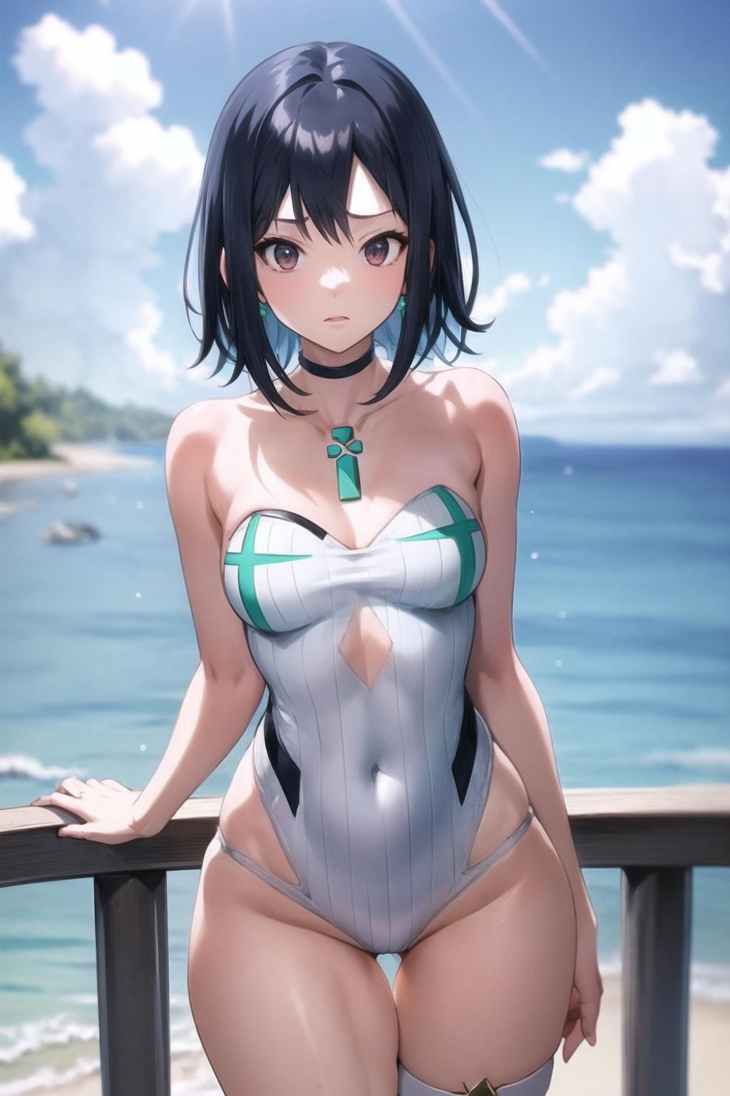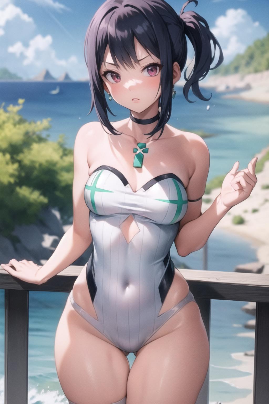 striped one-piece swimsuit, clothing cutout, choker, thigh strap, chest gem, jewelry, strapless