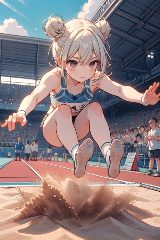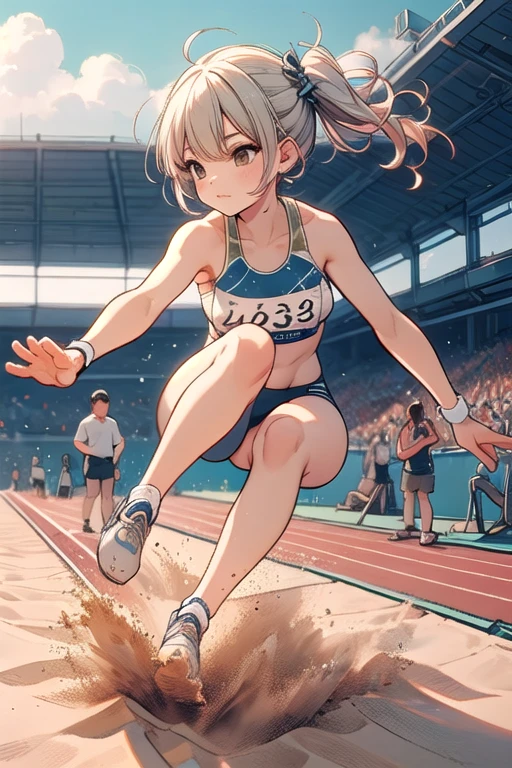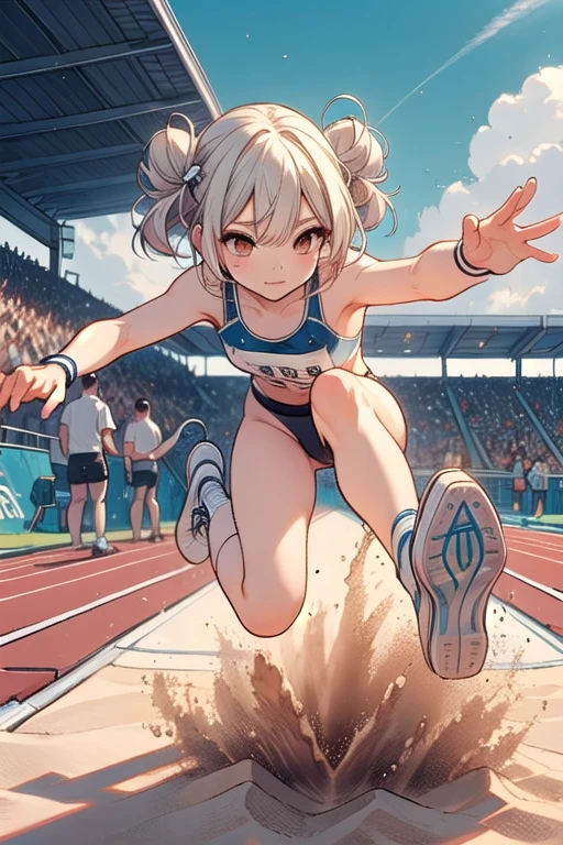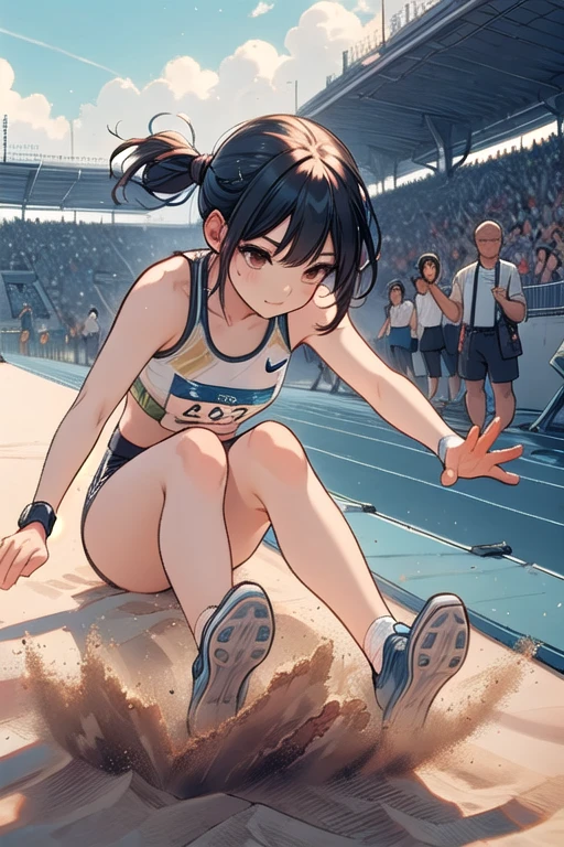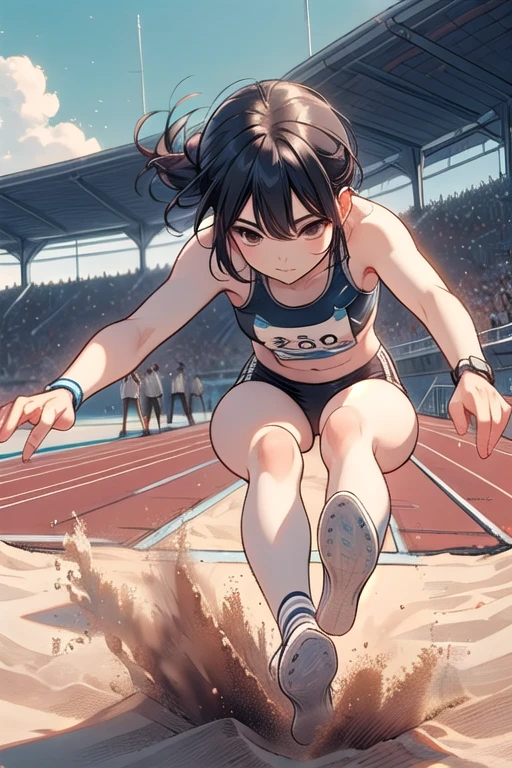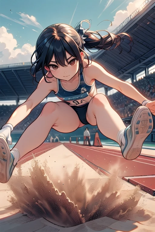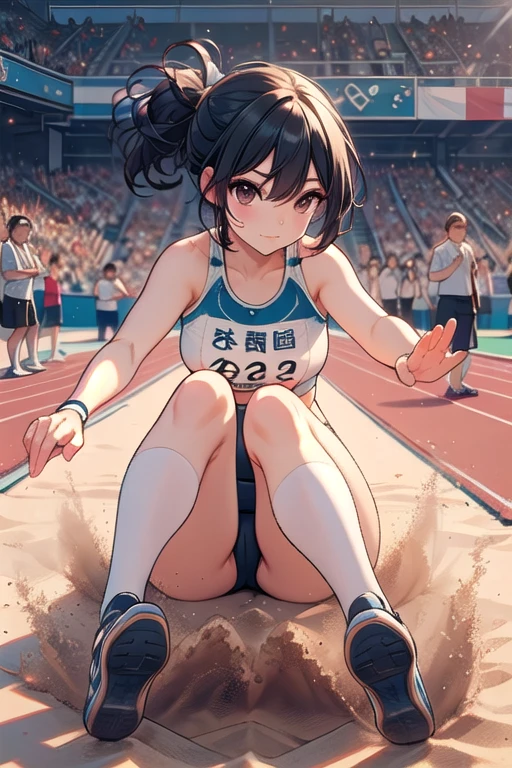 ((long jump)), ((sand pit)), ((dust)), landing, running, floating in air, athletes uniforms, sports shorts, crotch, thighs, wind, crowd in stands, 1girl, big ,