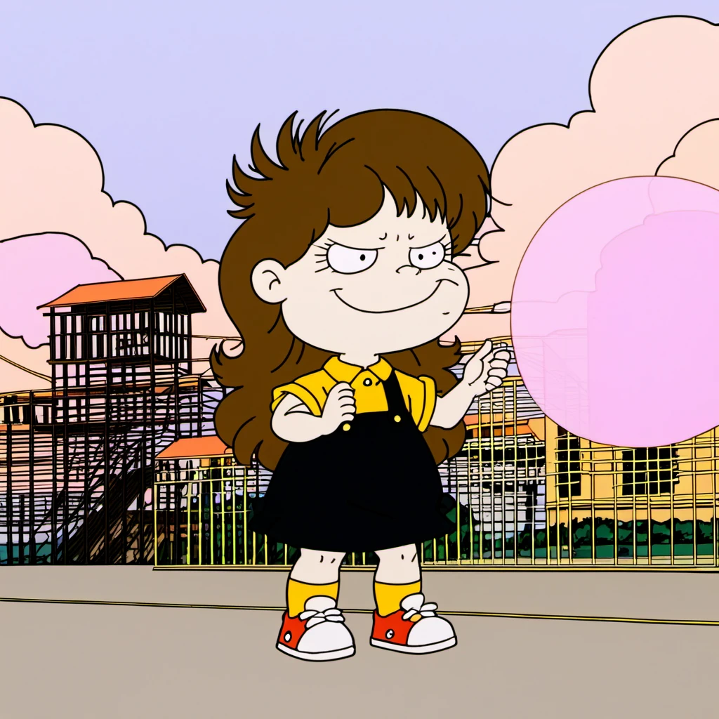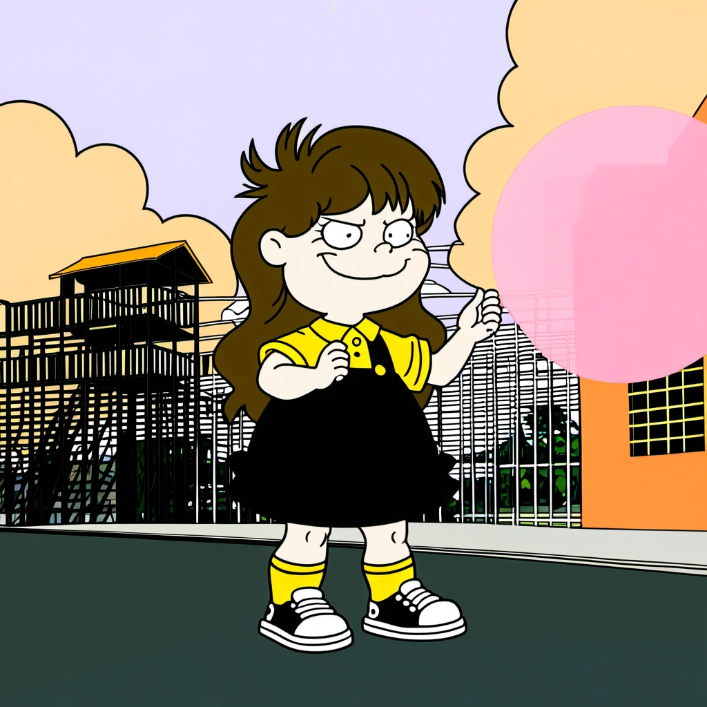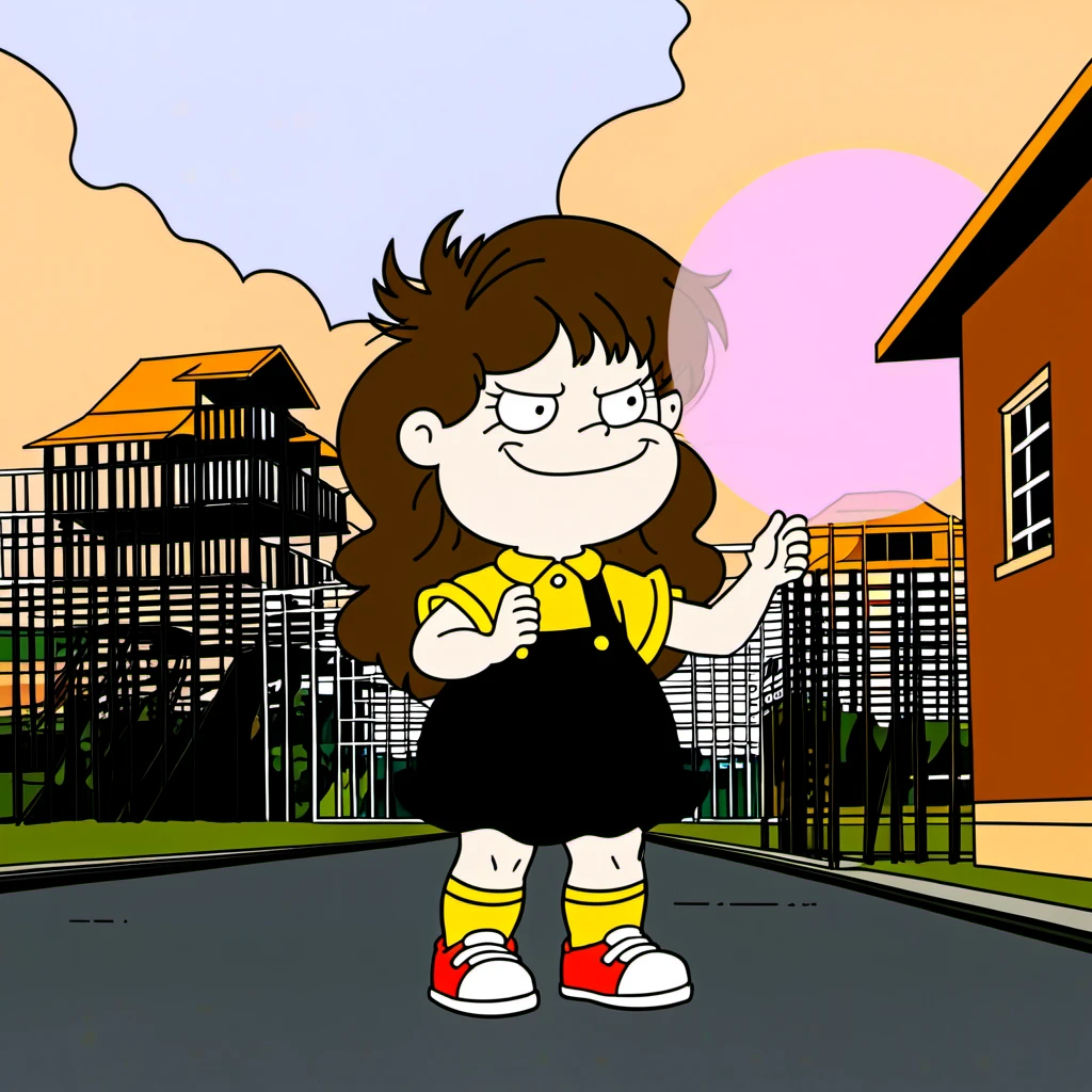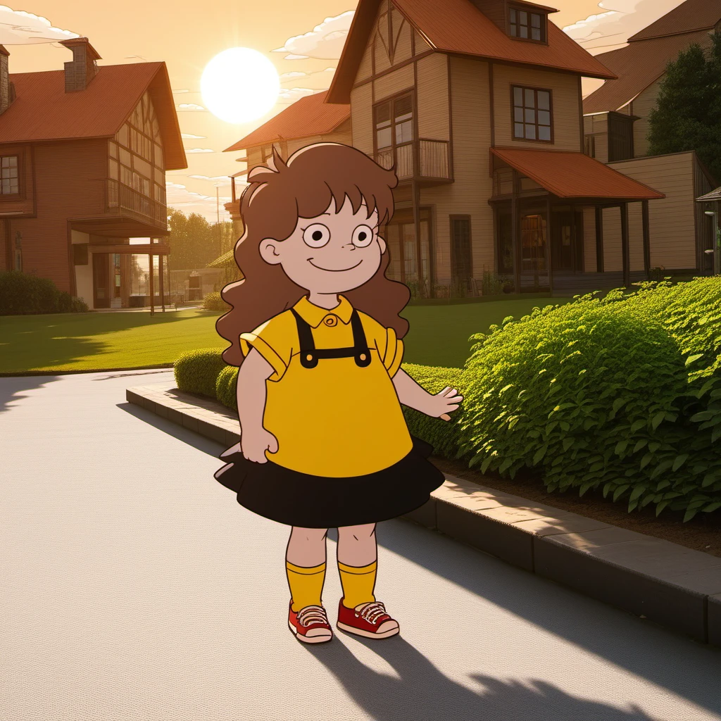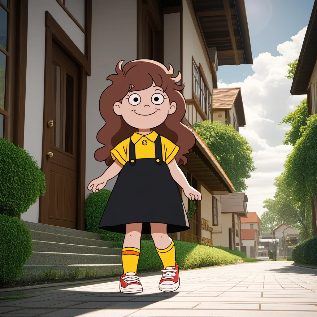 Black Overall Dress with Yellow Short Sleeve Collar-Shirt Underneath, Yellow Socks, Red and White Sneakers