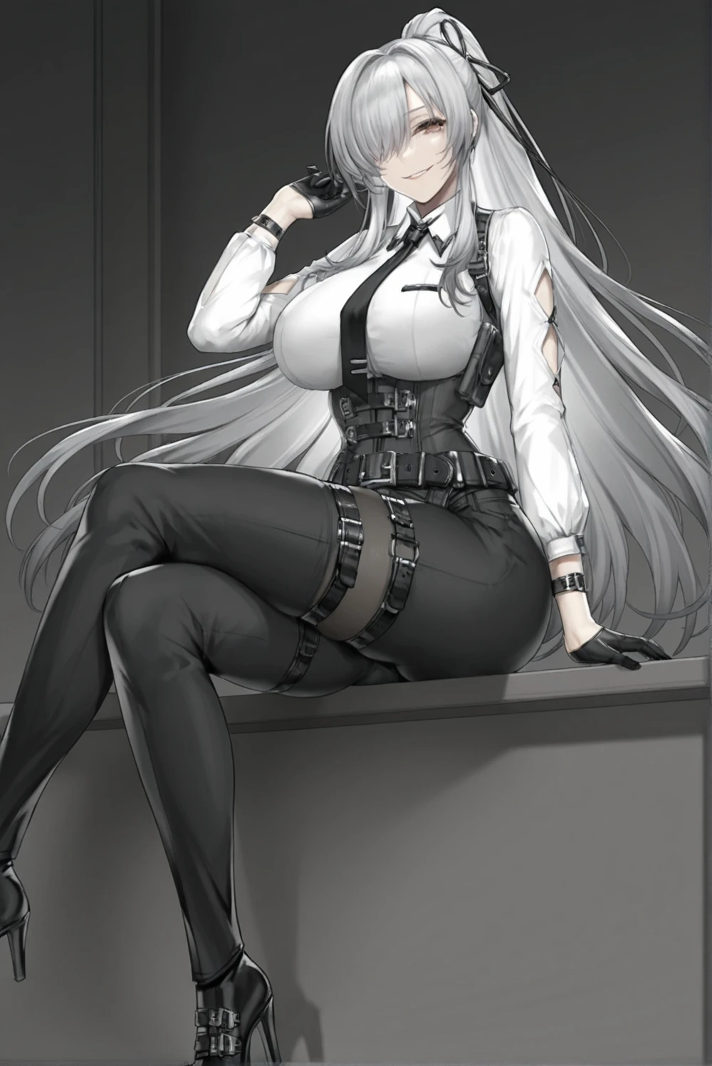 long hair breasts , bangs, large breasts .,white shirt, gloves long sleeves , ribbon ,brown eyes, very long hair , hair ribbon, ponytail ,grey hair sidelocks ,necktie ,black gloves, collared shirt belt pants, hair over one eye , black ribbon ,thigh strap ,black pants ,black neckties half gloves, black stocking in pants,,