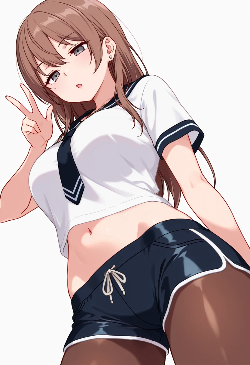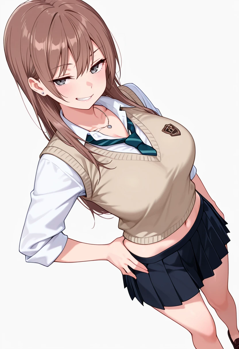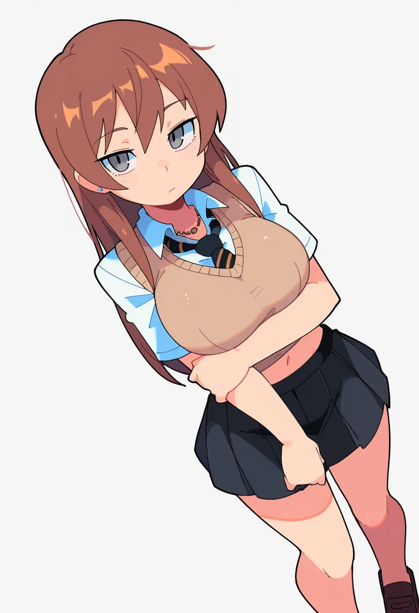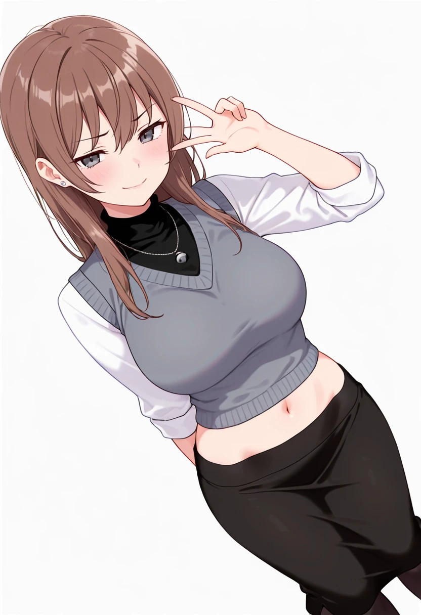 chiaki_cnr, 1girl,brown hair, long hair,large breasts, navel,grey eyes,stud earrings, necklace,