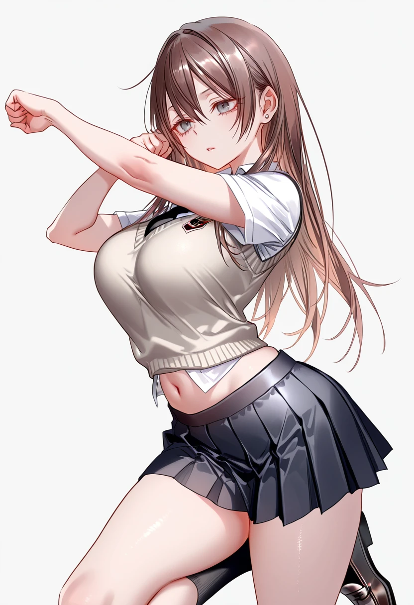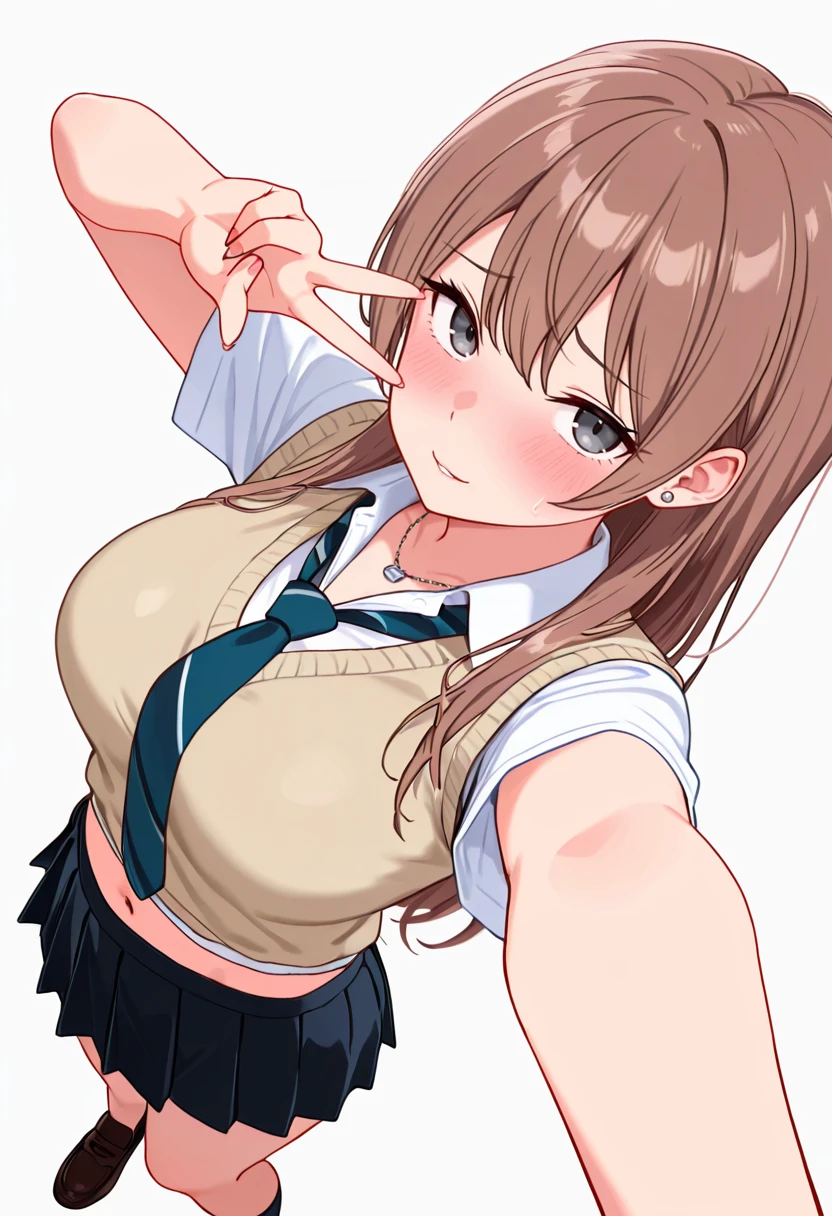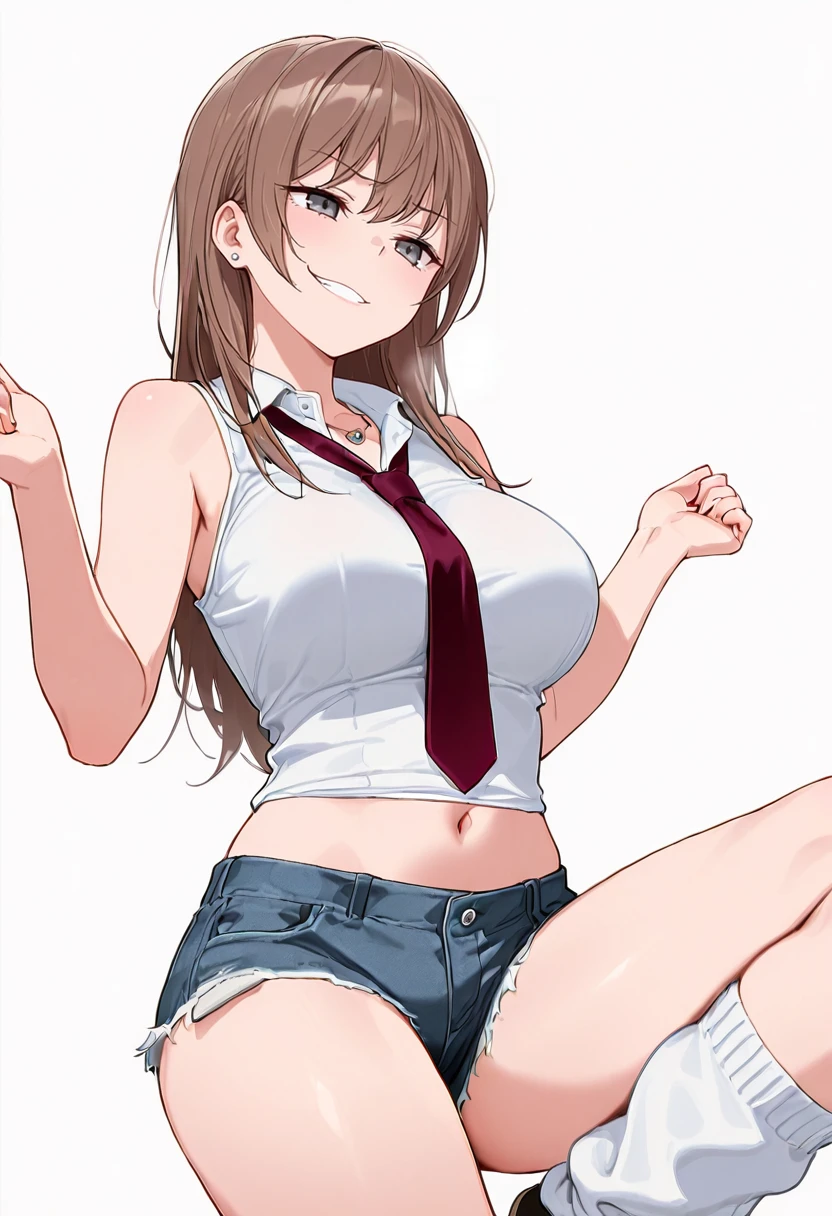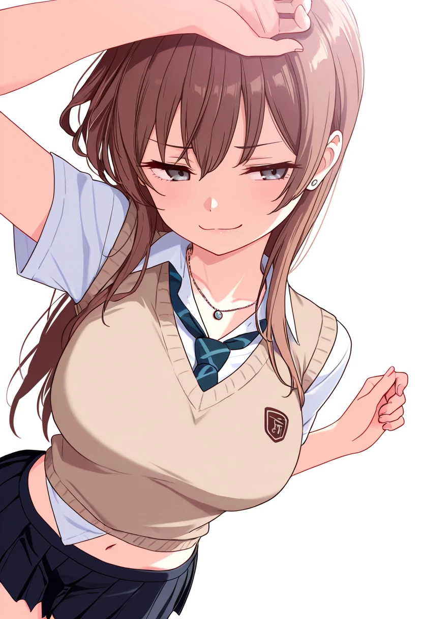 chiaki_cnr, 1girl,brown hair, long hair,large breasts, navel,grey eyes,stud earrings, necklace,