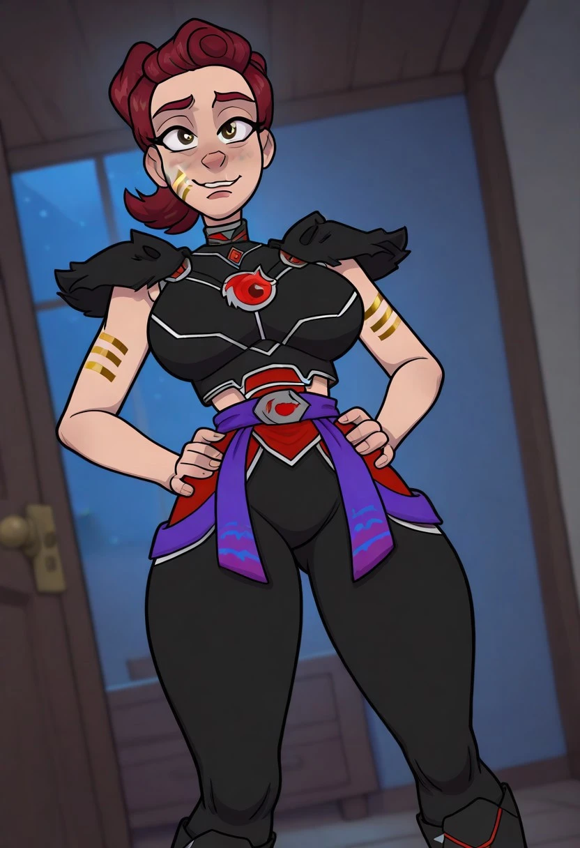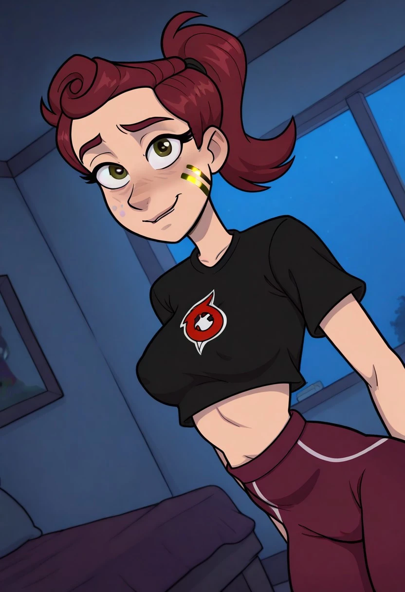 Jordana, brown eyes, red hair, ponytail, gold tattoo on cheek, light-skinned, light-skinned female, solo,