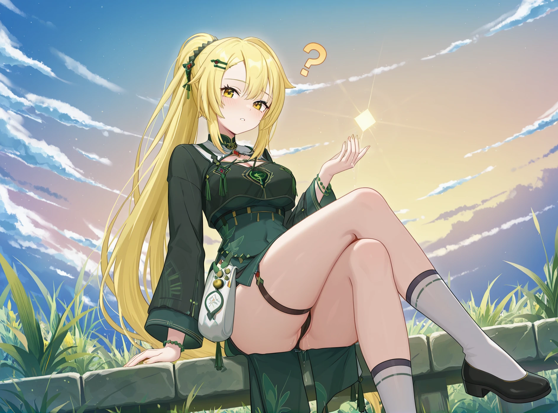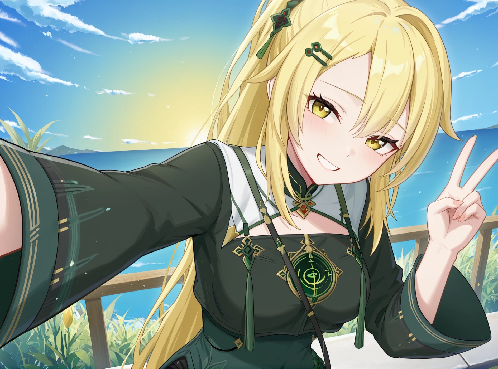 PGVZ_Qiushengyu,blonde hair, long hair, very long hair, bangs, ponytail, hairclip, hair ornament, yellow eyes,