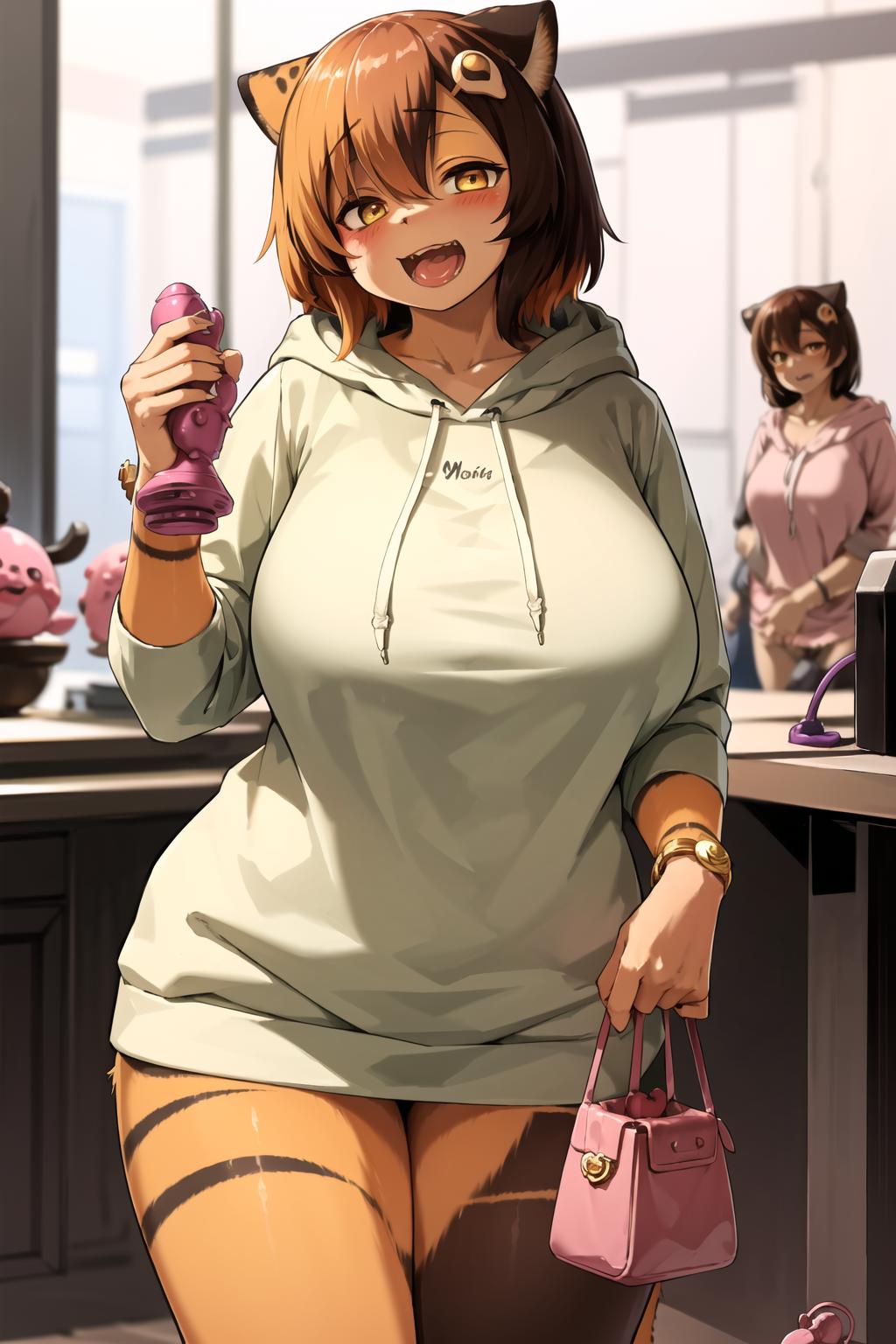 large breasts, furry, ????, furry female, fangs, animal ears, tiger girl, orange fur, multicolored hair, yellow fur, egg hair ornament, yellow eyes, piebald, feline, female anthro, mottled, multicolored body, multicolored fur
