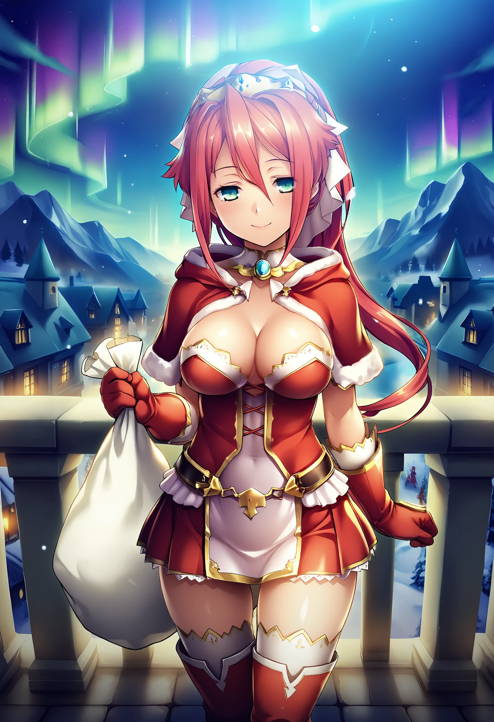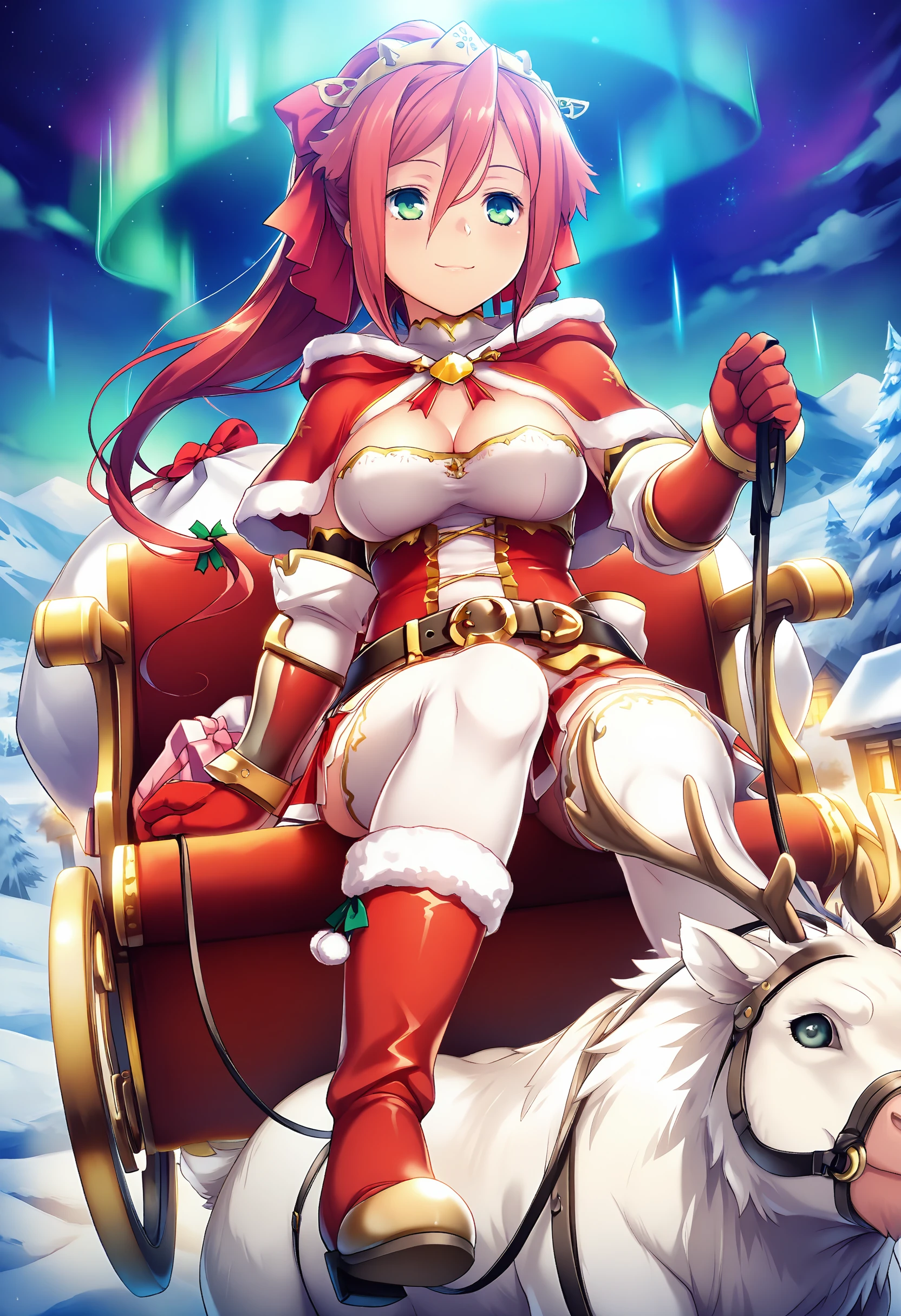 Recommend Prompts (Chara) : Krdia,1girl,solo,medium breasts,bare shoulders, navel,green eyes,ponytail, hair between eyes, ribbon, crown, detached collar, hair bow,