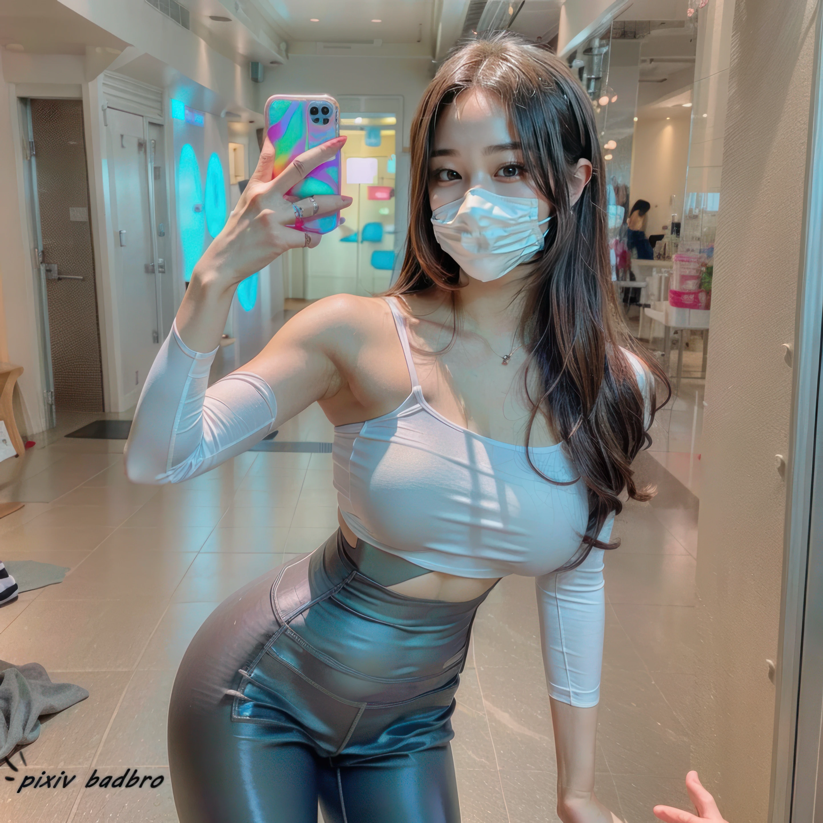 tag : selfie, leggings, holding phone, full body, running shoes, mask,