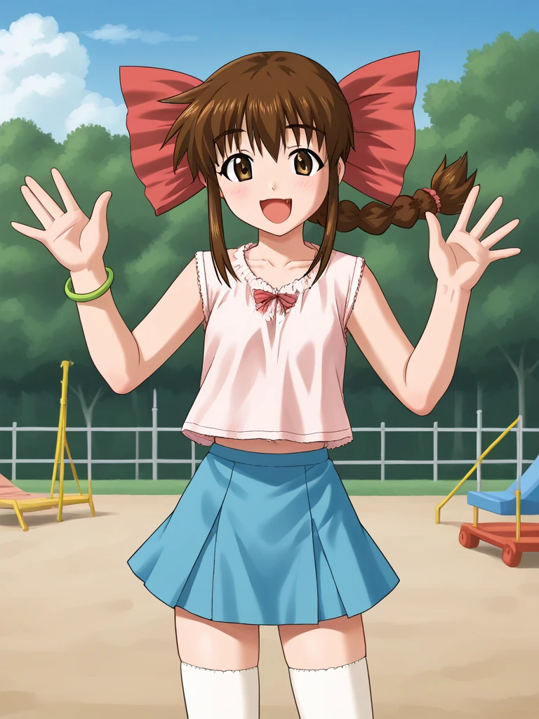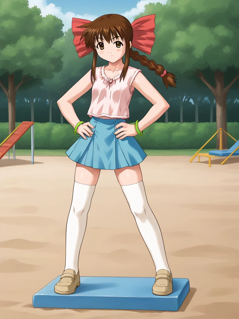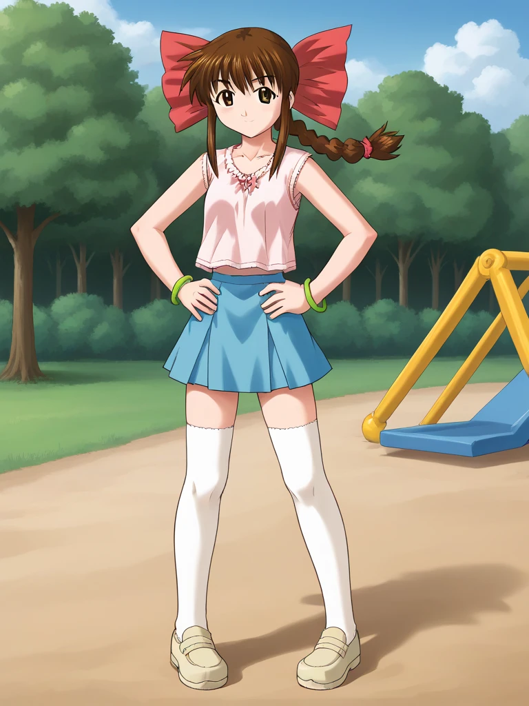 V.G. Rebirth - tamaovgrebirth, brown hair, braided ponytail, sidelocks, pink bow, hair bow, brown eyes, shirt, sleeveless, green bracelet, blue skirt, white thighhighs, beige shoes,