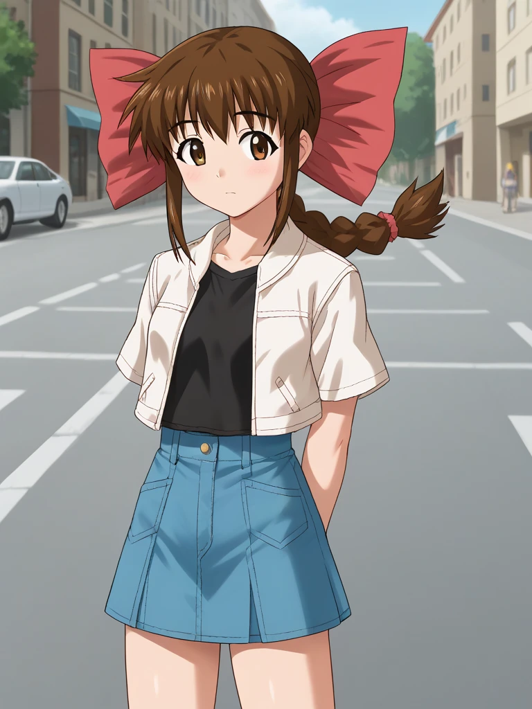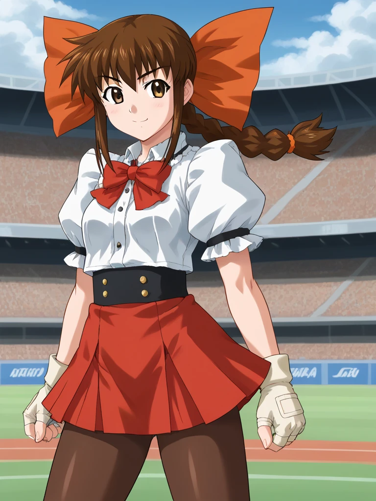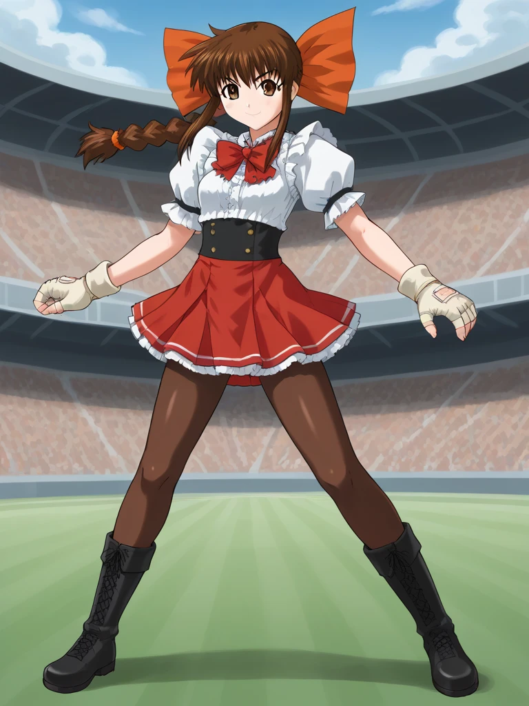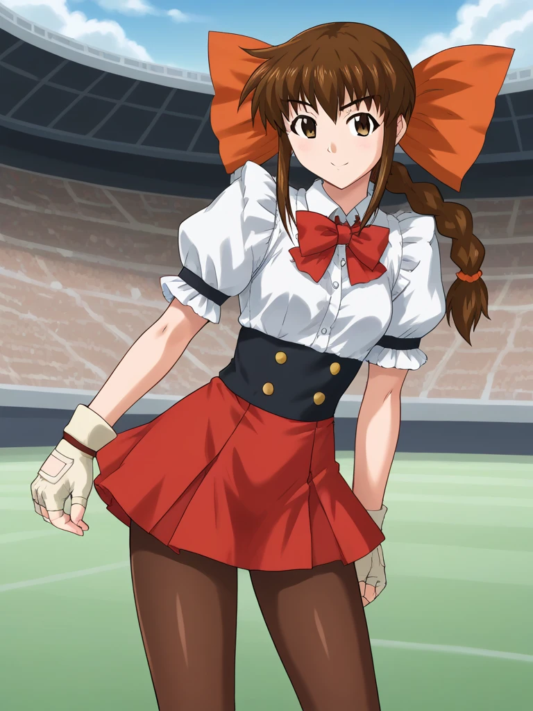 Variable Geo Outfit - tamaovgrebirth, tamaoog, brown hair, braided ponytail, sidelocks, orange bow, hair bow, brown eyes, waitress, red bowtie, puffy short sleeve, frills, fingerless gloves, red skirt, brown pantyhose, boots, (put waist apron on negative, also, this outfit isn't that accurate, but close enough.)