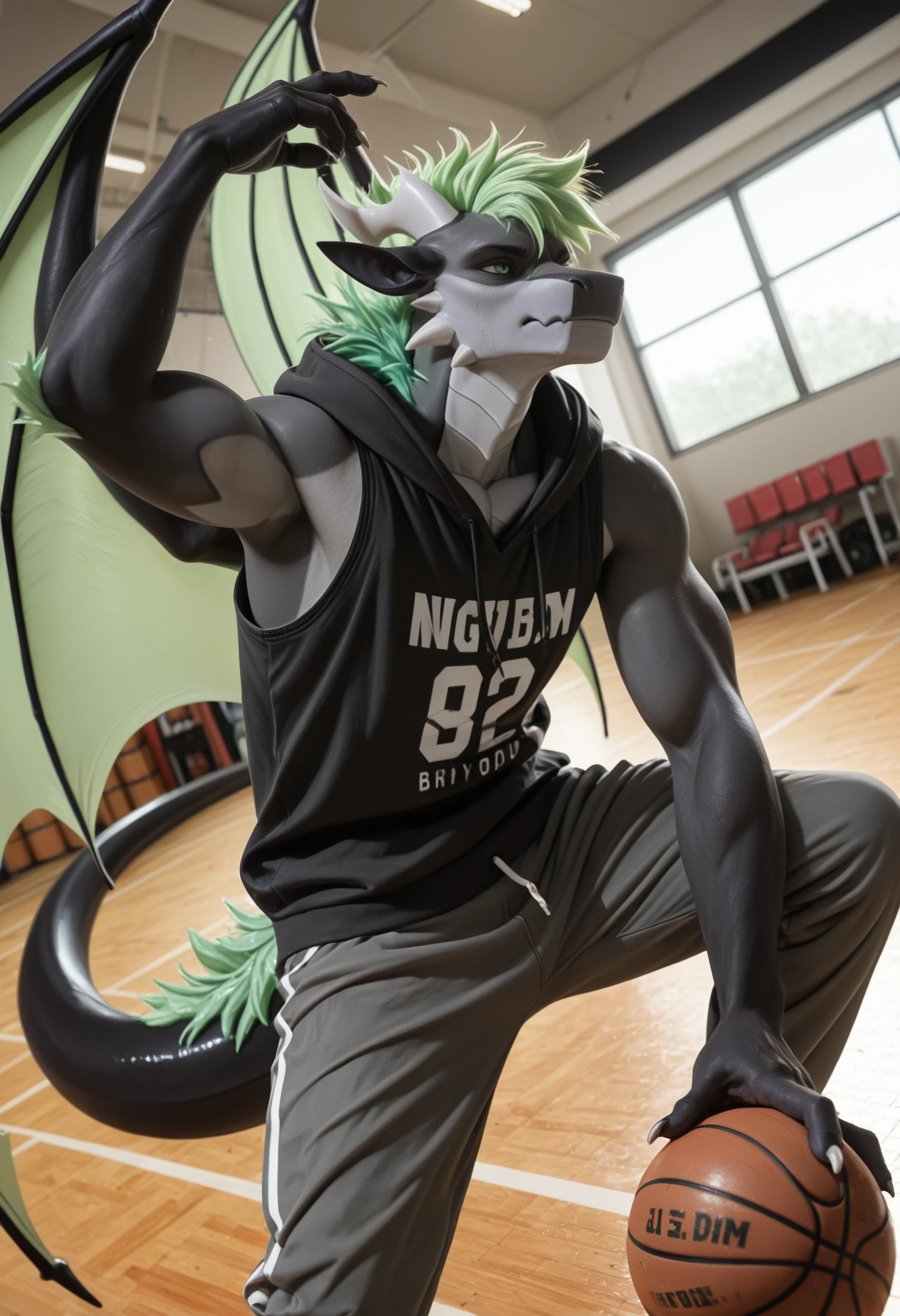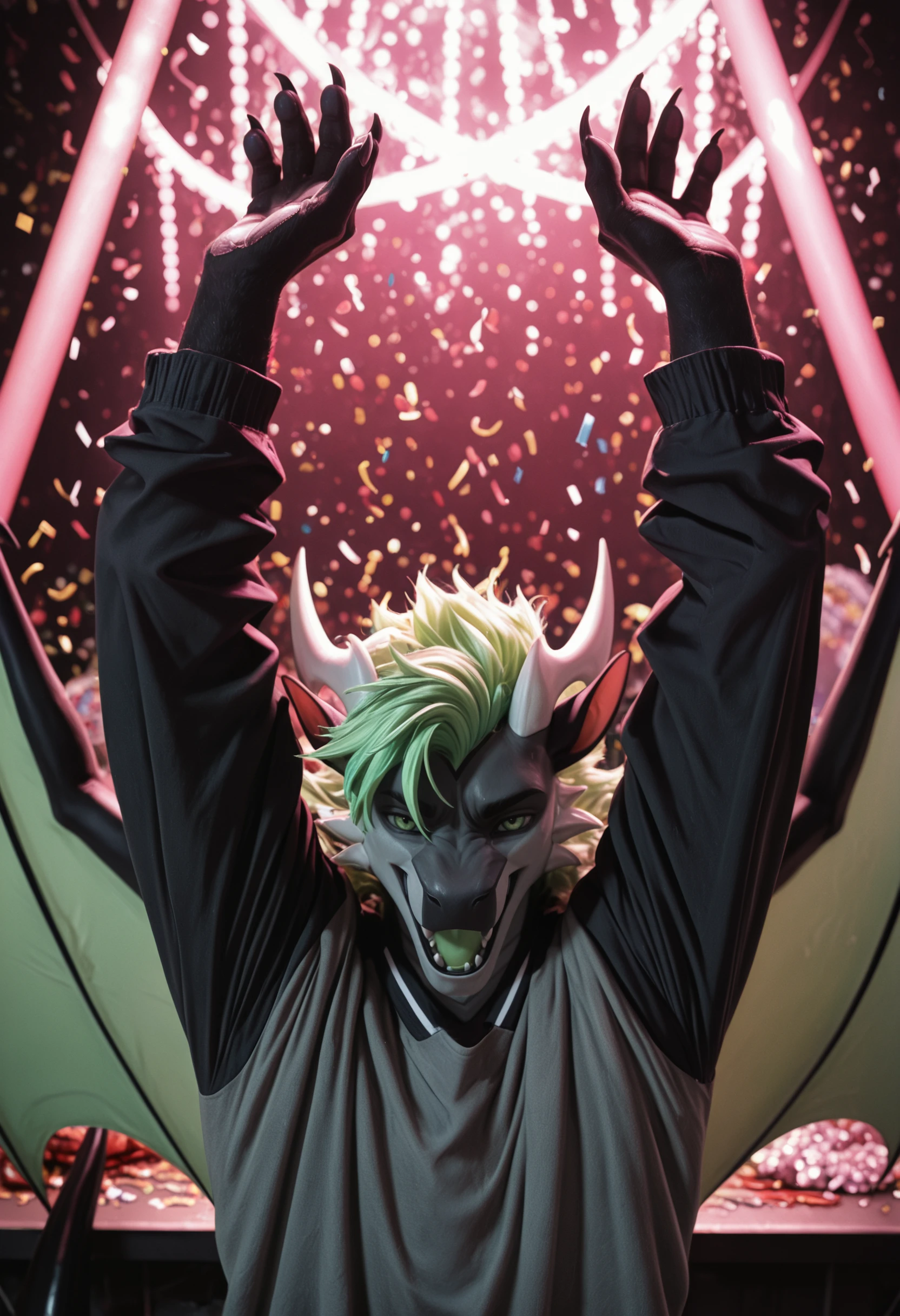 📝 Jason — оригинальный дракон-персонаж от Demonium, с высоким атлетичным телосложением, тёмно-серым телом, яркими неоново-мятными волосами и похожими акцентами по телу, большими крыльями и изогнутыми рогами.