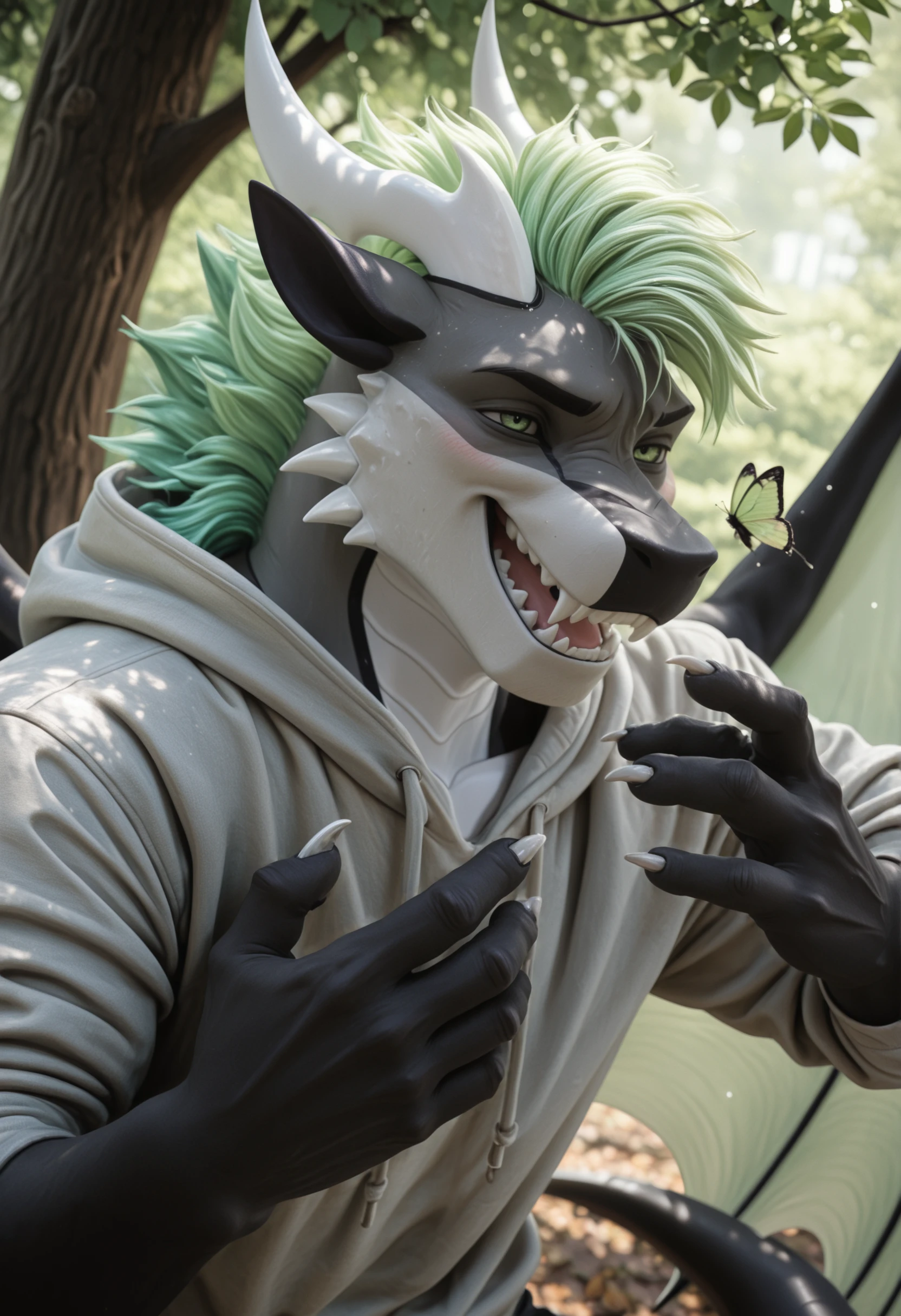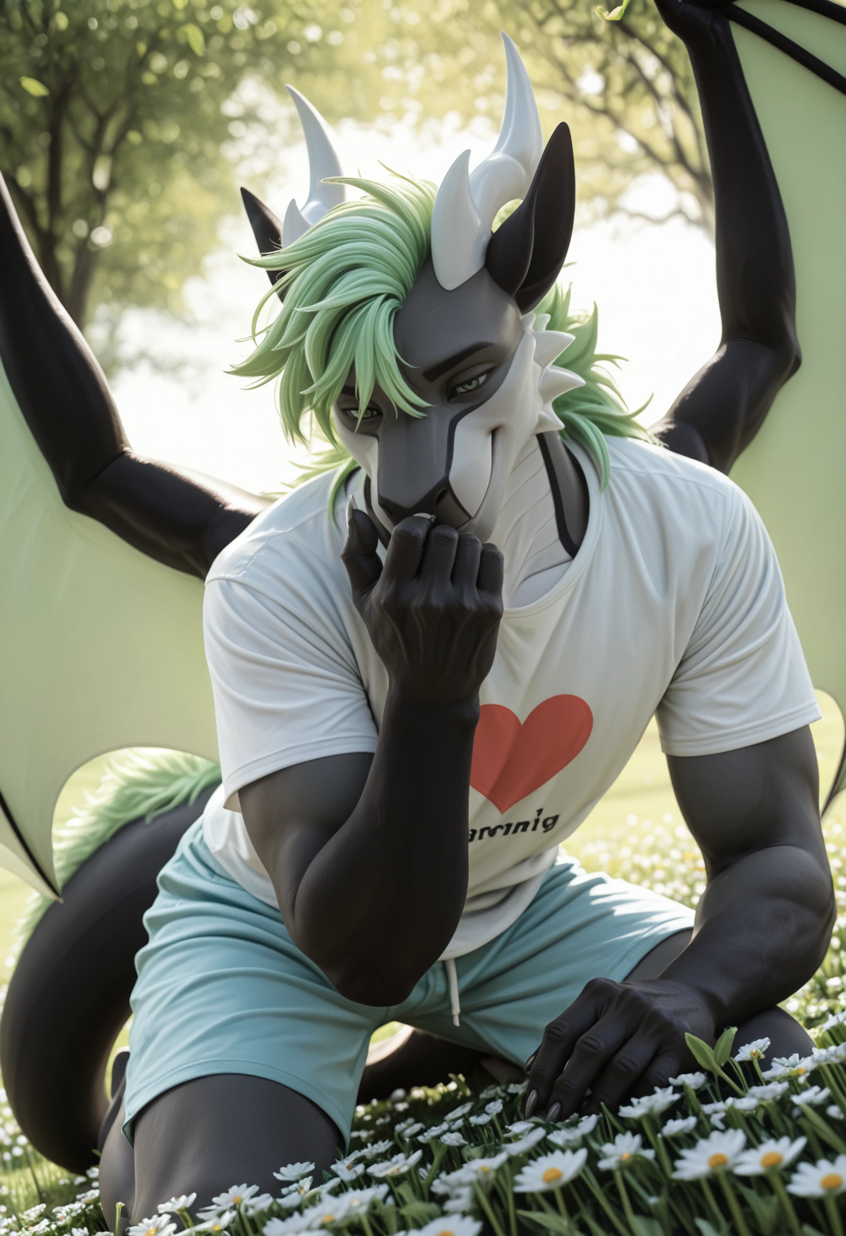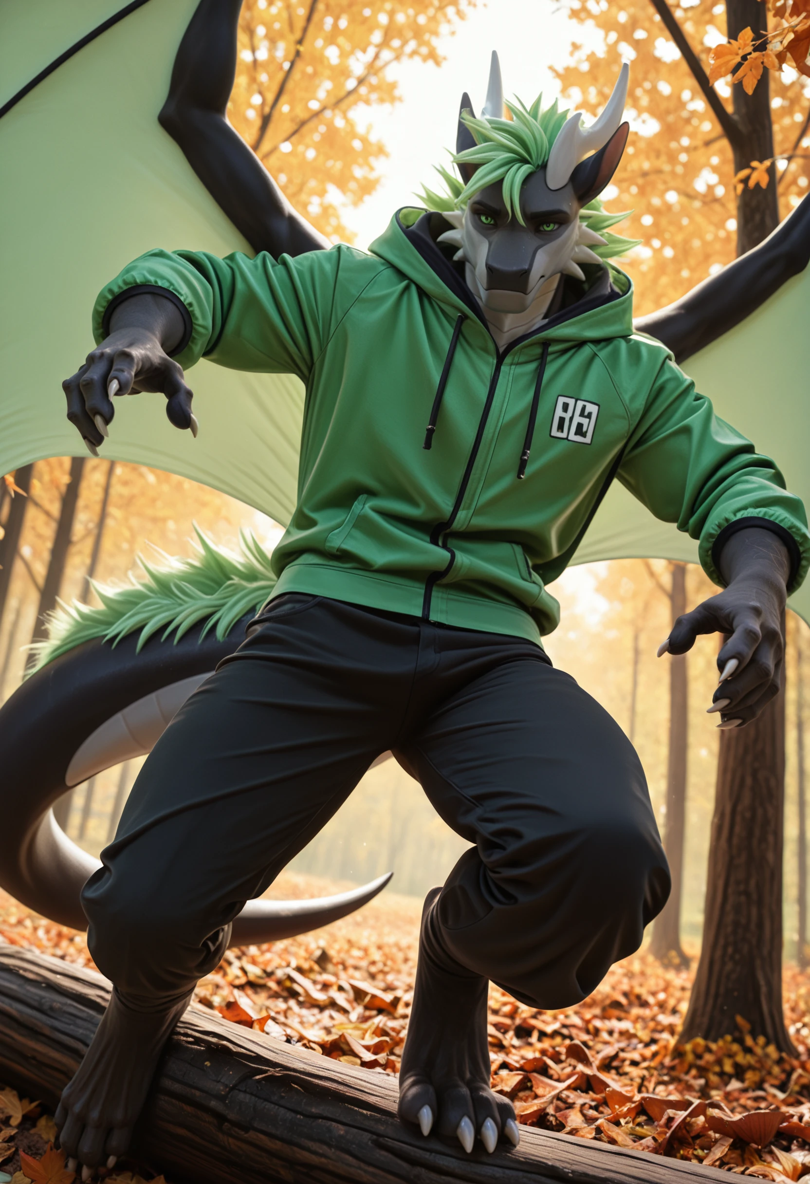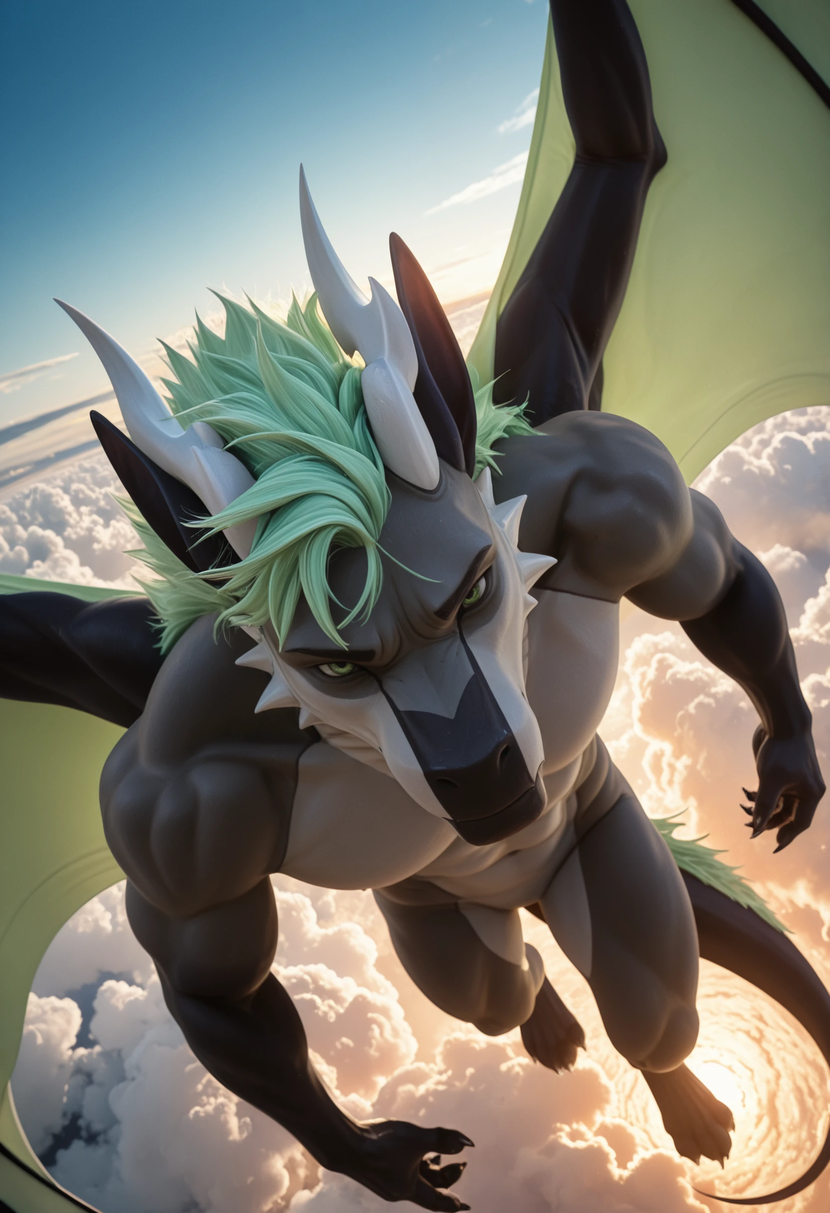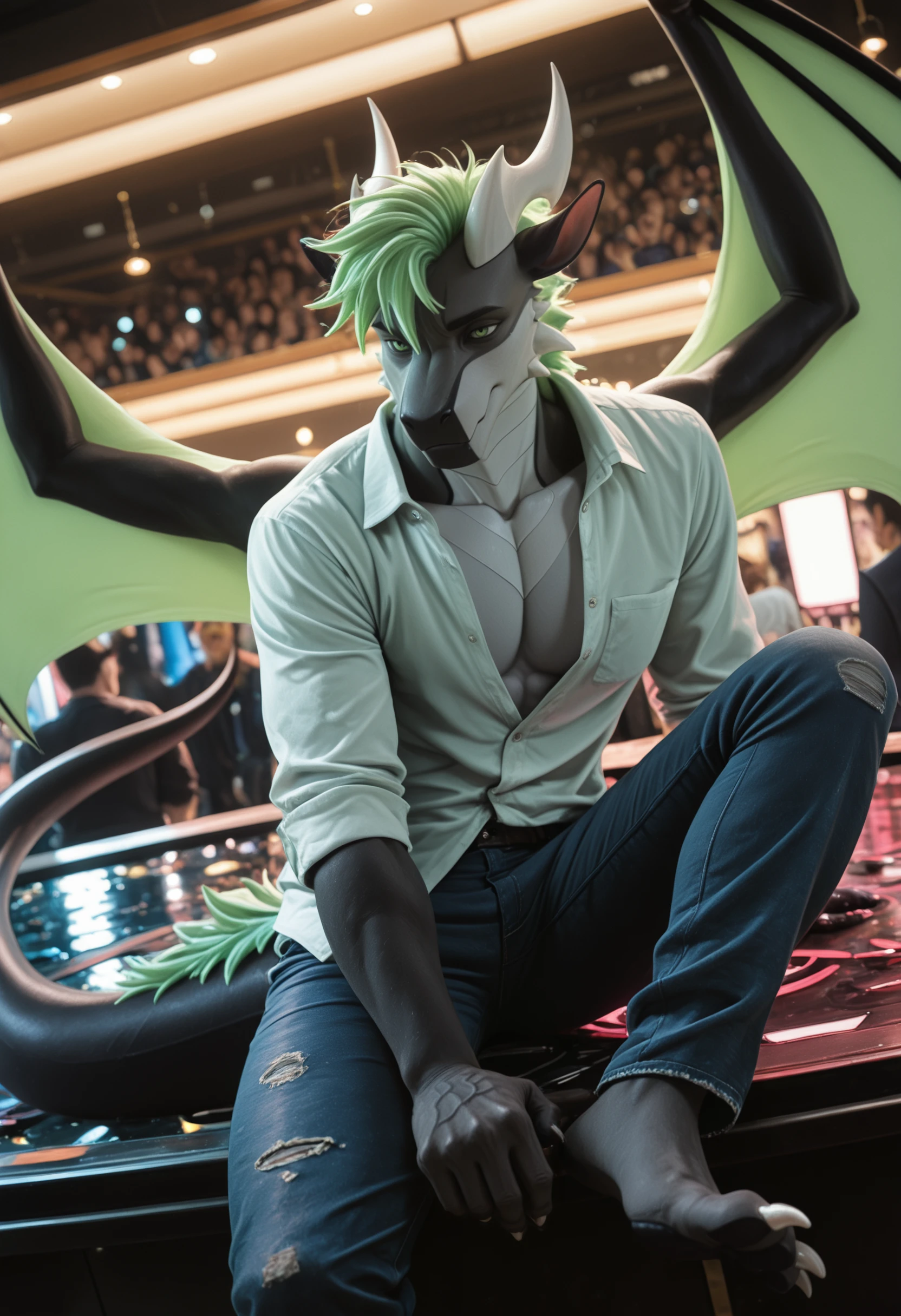 jas0n_dem0nium, anthro, furry, male, furry male, male focus, dragon, horns, 1boy, solo, tail, green hair, dragon boy, wings, bara, green eyes, claws, animal ears