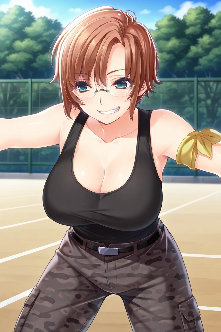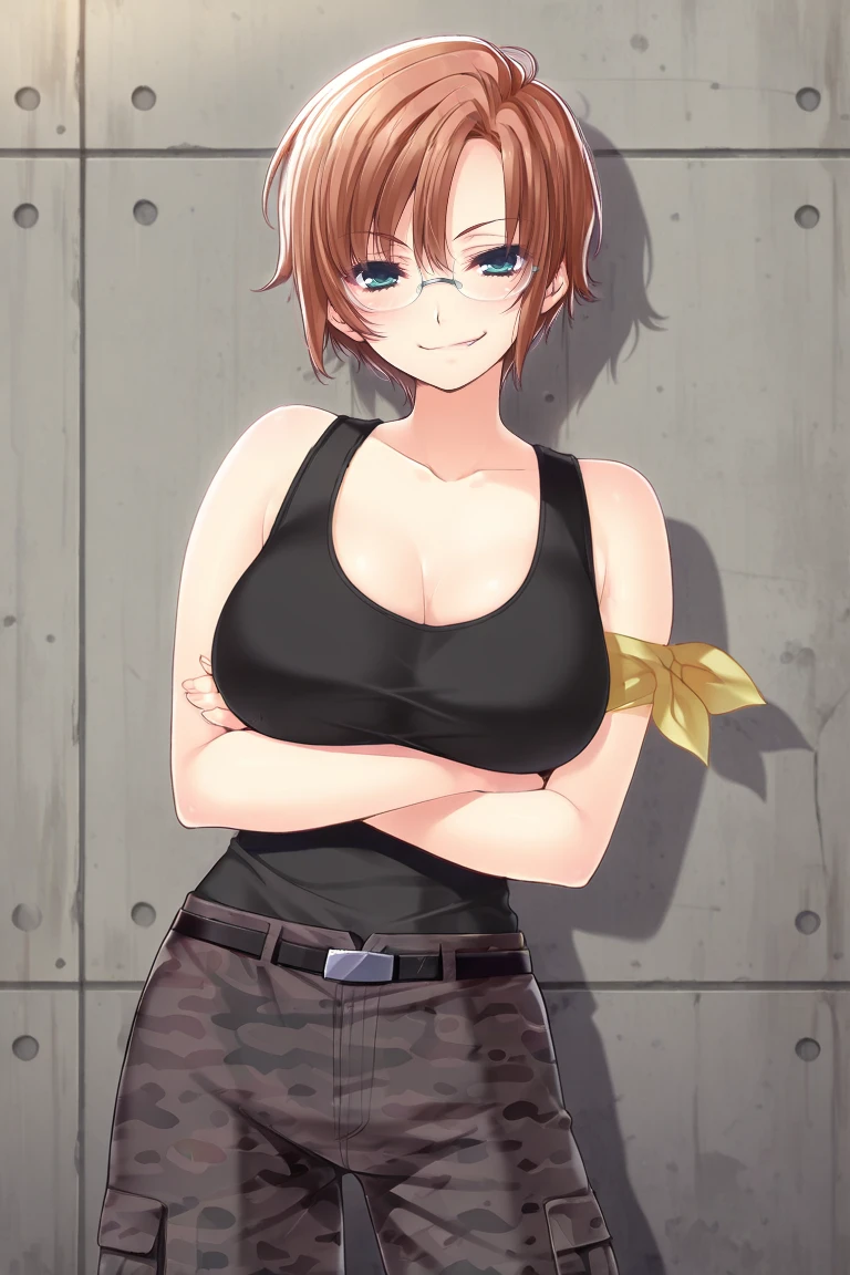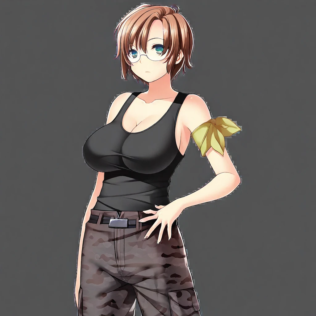 tamaki-casual, black tank top, arm band, cleavage, camo pants, belt,