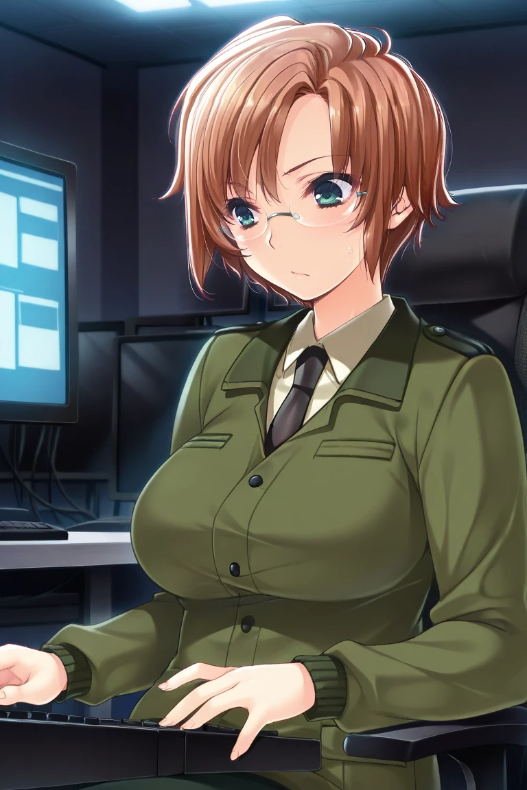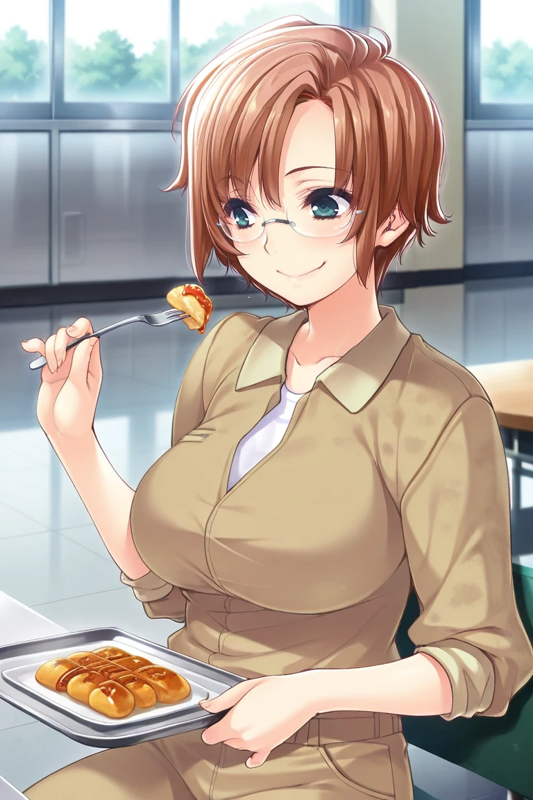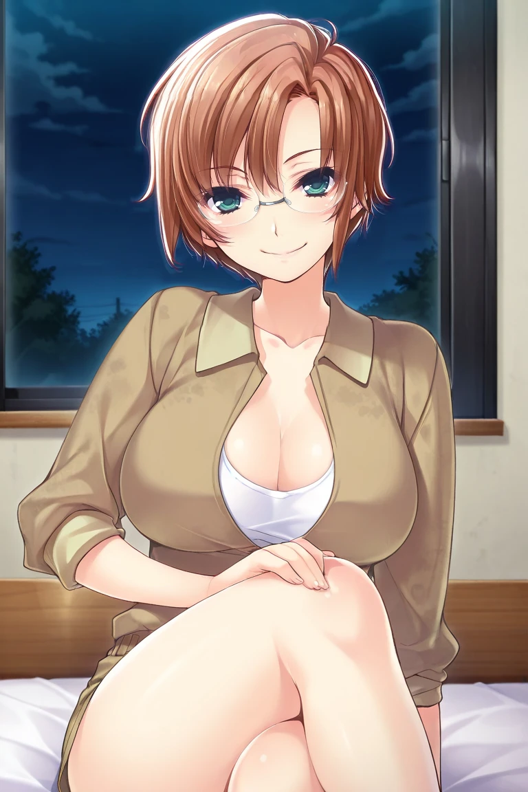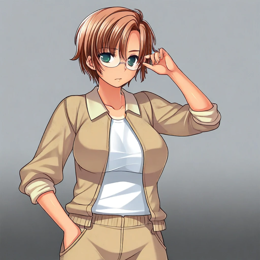 brown hair, short hair, parted bangs, hair between eyes, green eyes, , glasses,