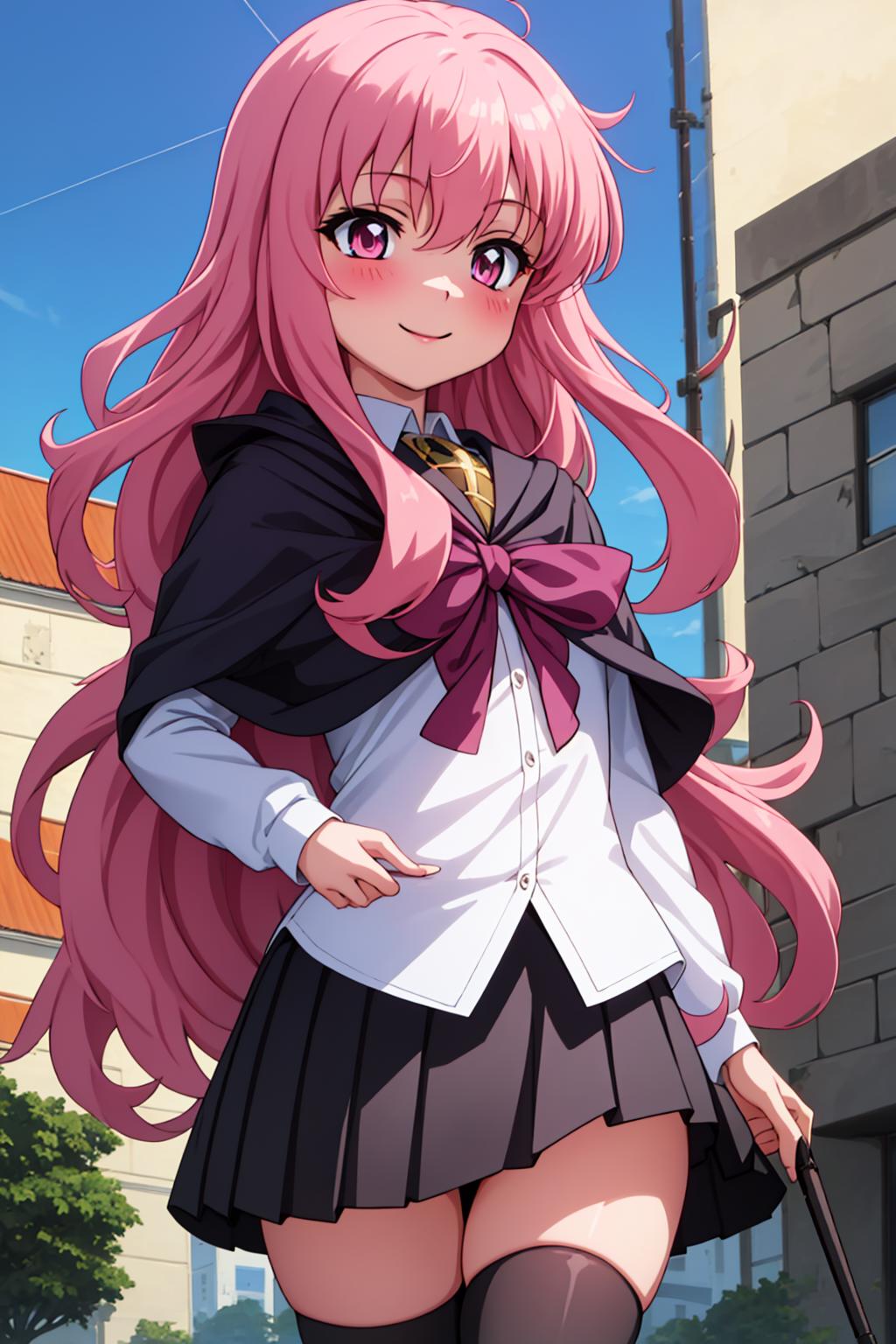 black skirt,wand,pleated skirt, school uniform,cape,black thighhighs,pentacle,thigh boots,skirt,wand,, pentacle,zettai ryouiki, stockings,short_skirt,