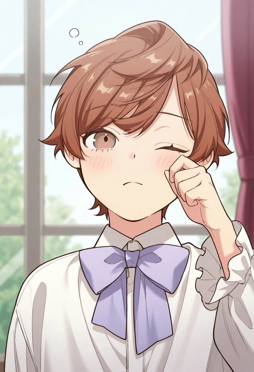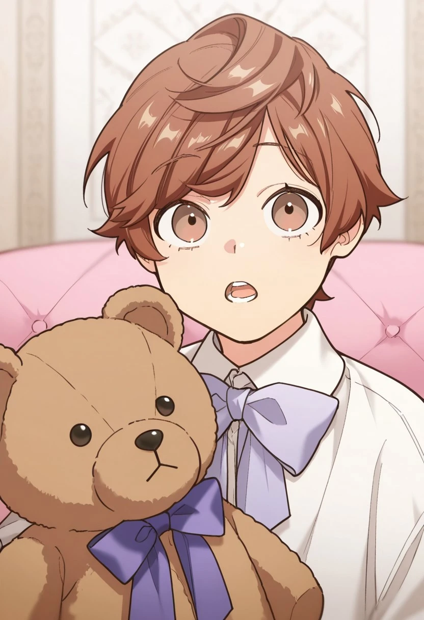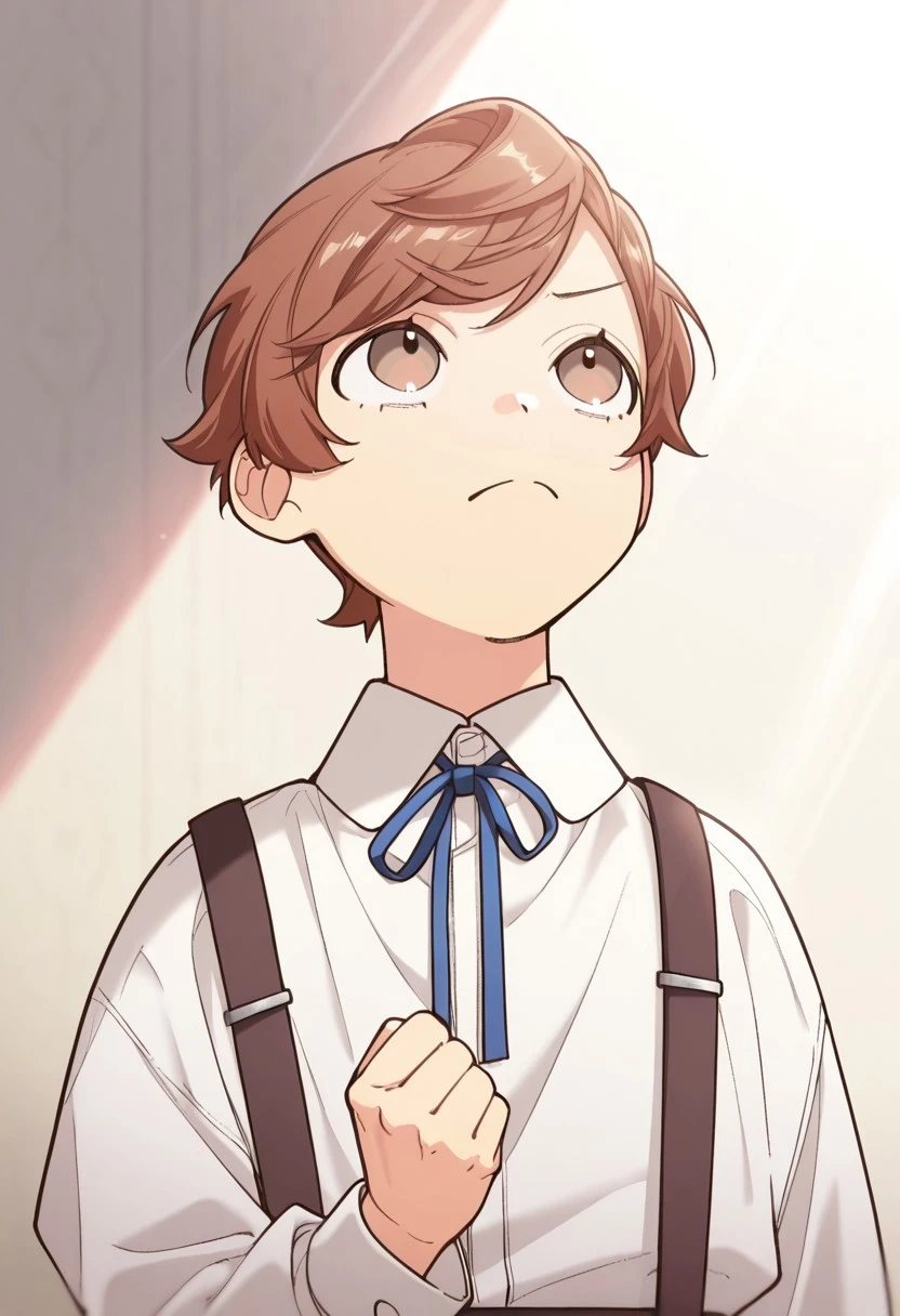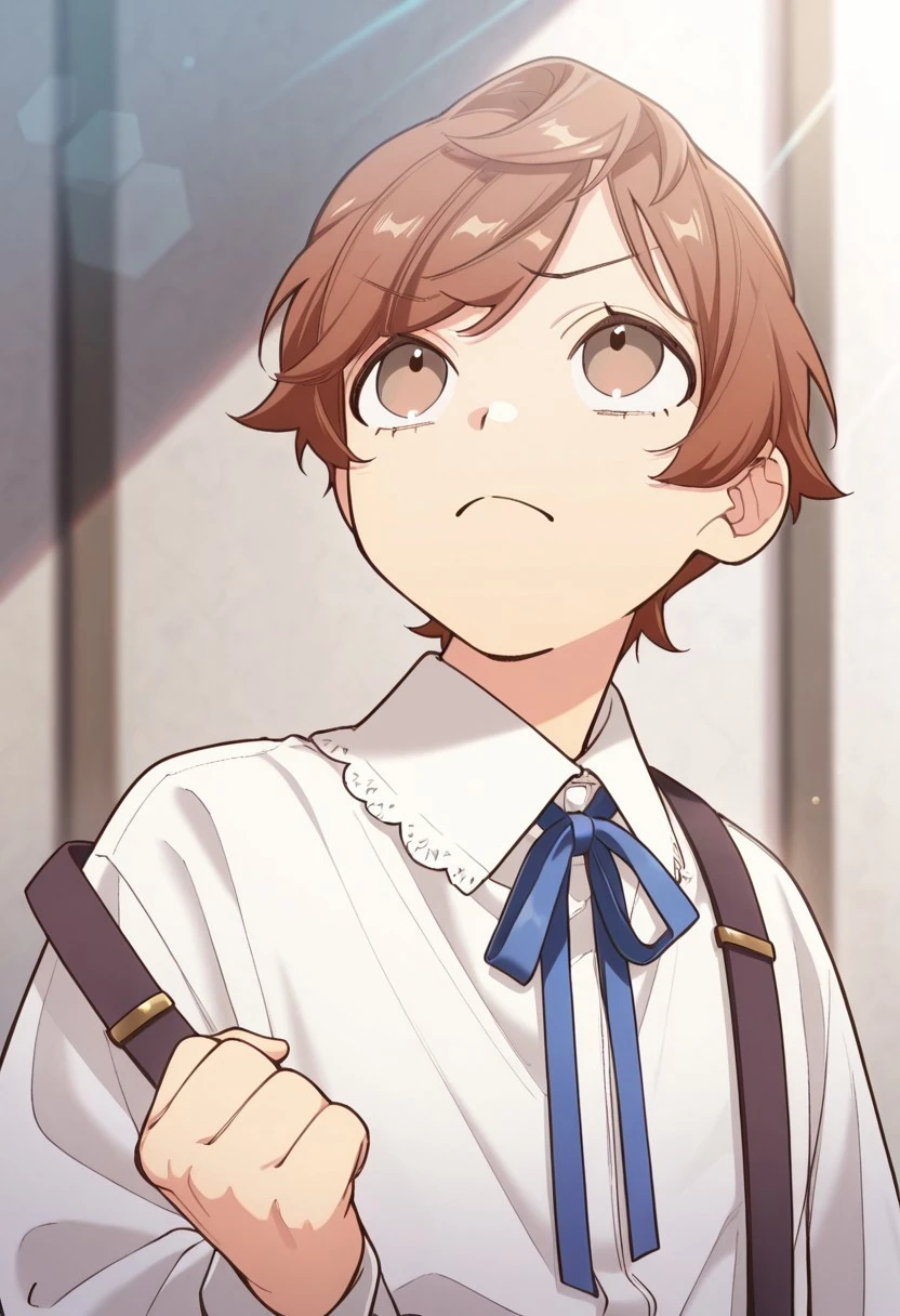 1boy, male focus, solo, brown eyes, brown hair, short hair, swept bangs, white shirt, collared shirt, neck ribbon, black ribbon, suspenders, black shorts,