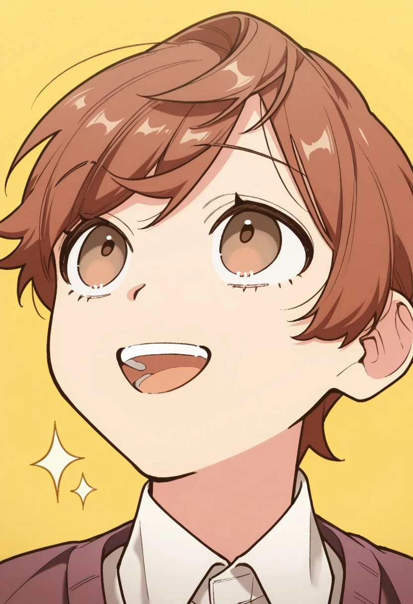 1boy, male focus, solo, brown eyes, brown hair, short hair, swept bangs, white shirt, collared shirt, brown sweater, shorts,