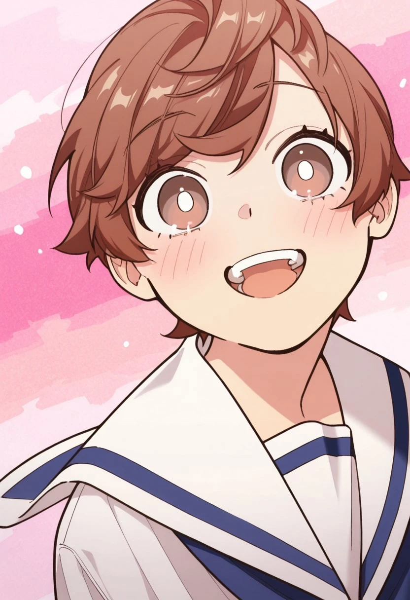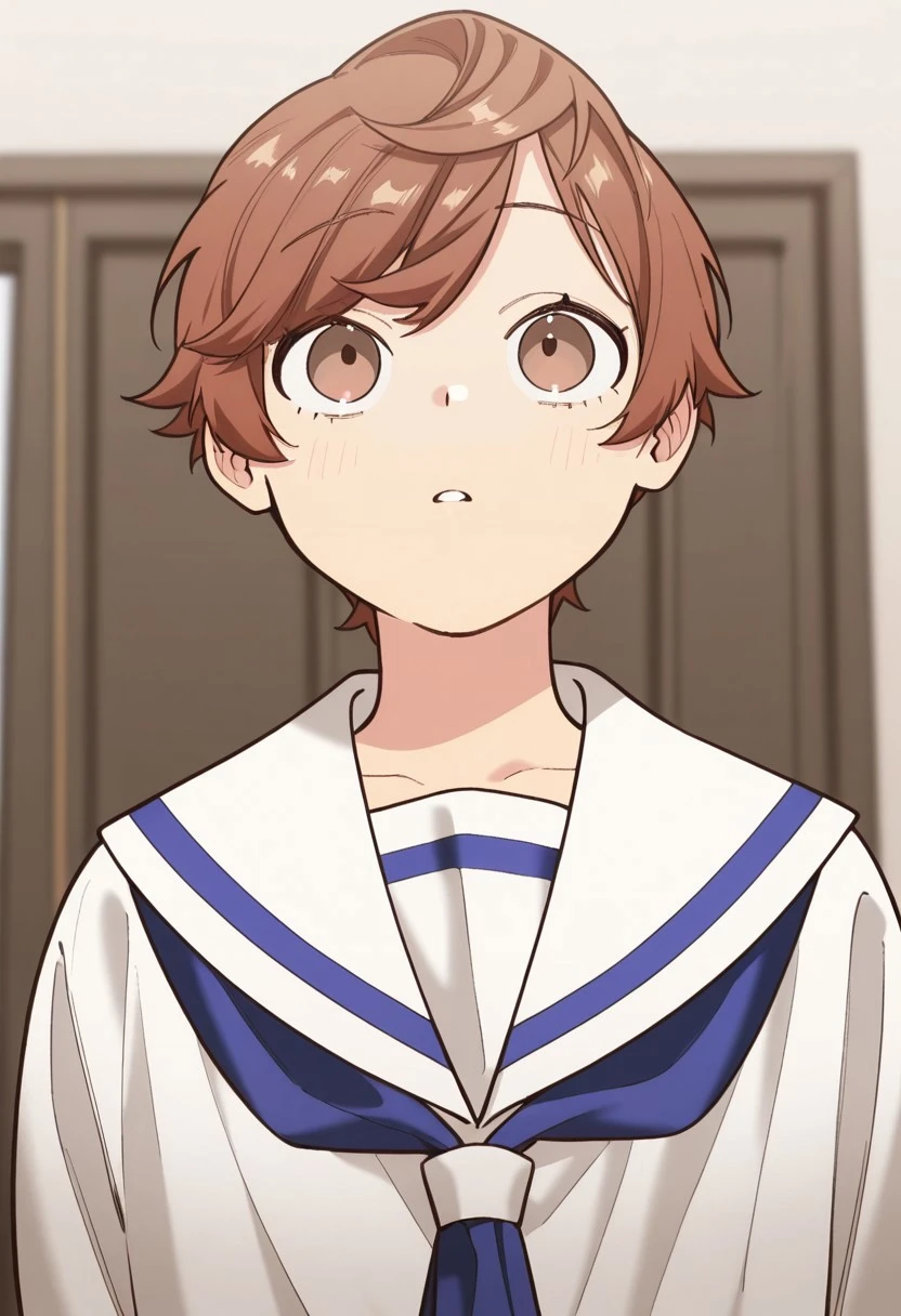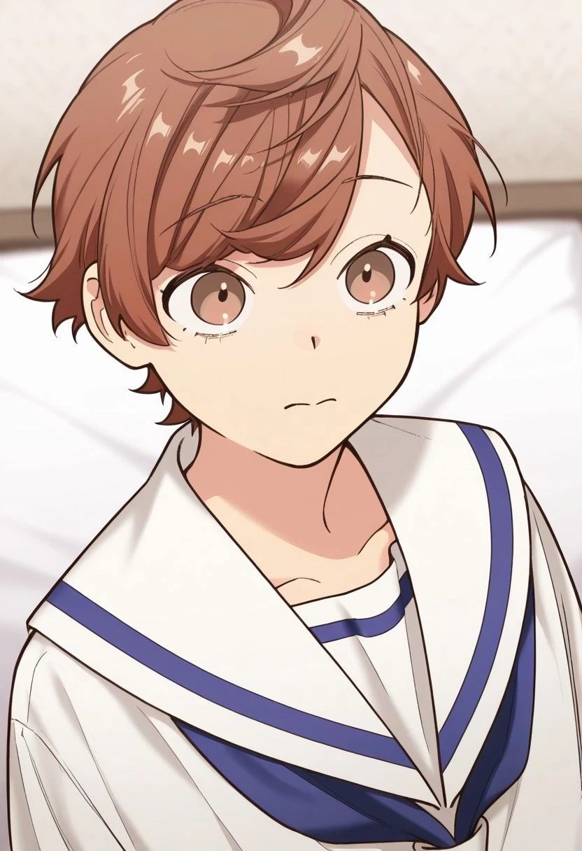 1boy, male focus, solo, brown eyes, brown hair, short hair, swept bangs, white shirt, sailor collar, blue neckerchief, white shorts,