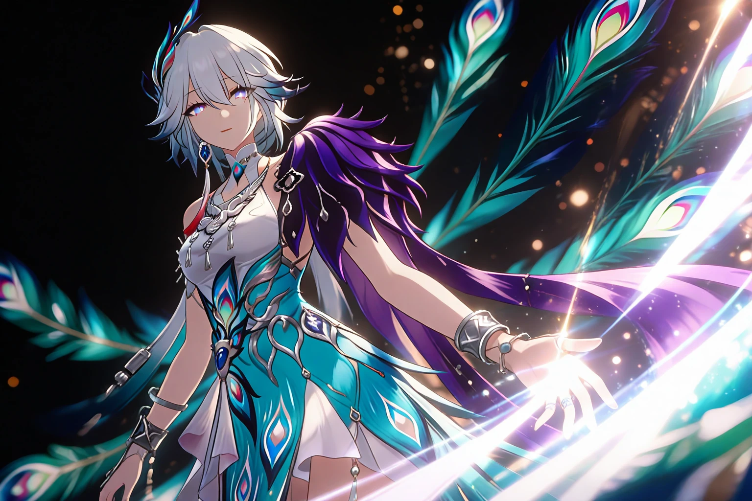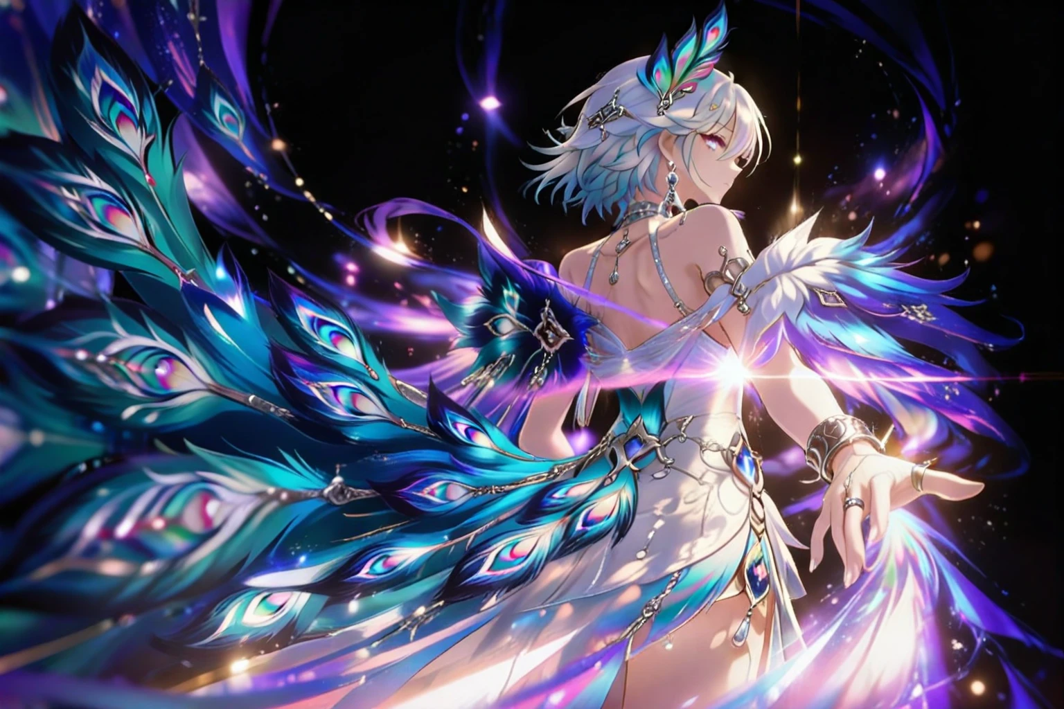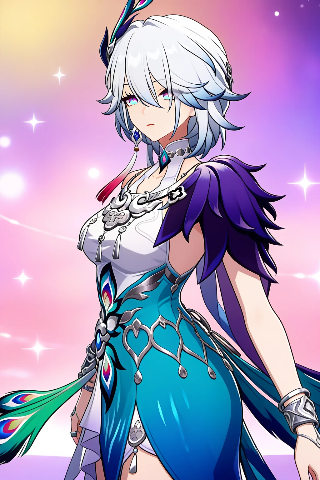 人物全身提示词:1girl, solo,white hair, light blue hair, gradient hair, short hair, bangs, purple eyes, blue eyes, gradient eyes, iridescent eyes, detailed eyes, long eyelashes, jewelry, earrings, necklace, bracelet, armlet, ring, hair ornament, peacock feather hair ornament, peacock print, dress, white dress, blue dress, halter dress, sleeveless dress, backless dress, high slit, purple shoulder armor