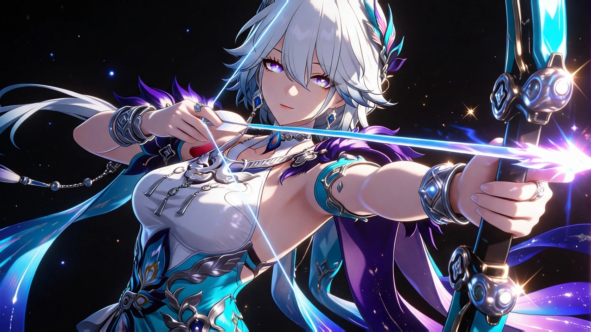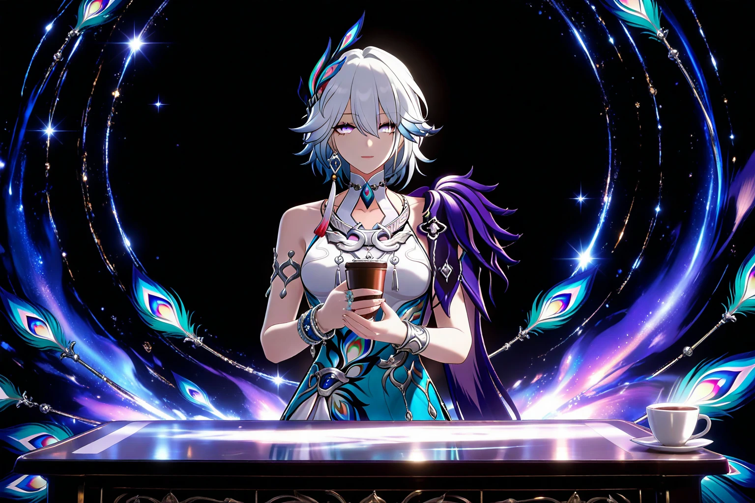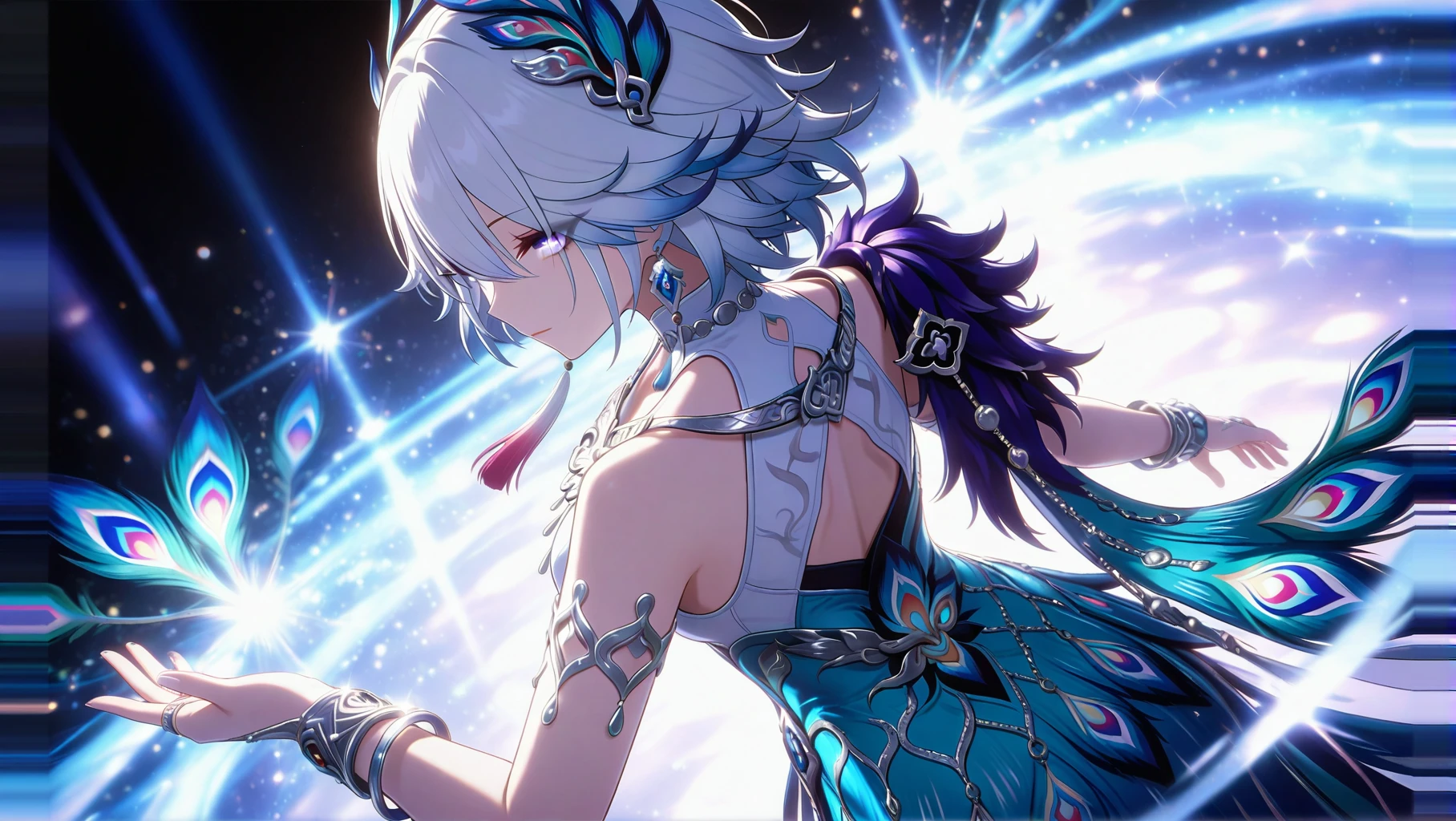 人物全身提示词:1girl, solo,white hair, light blue hair, gradient hair, short hair, bangs, purple eyes, blue eyes, gradient eyes, iridescent eyes, detailed eyes, long eyelashes, jewelry, earrings, necklace, bracelet, armlet, ring, hair ornament, peacock feather hair ornament, peacock print, dress, white dress, blue dress, halter dress, sleeveless dress, backless dress, high slit, purple shoulder armor