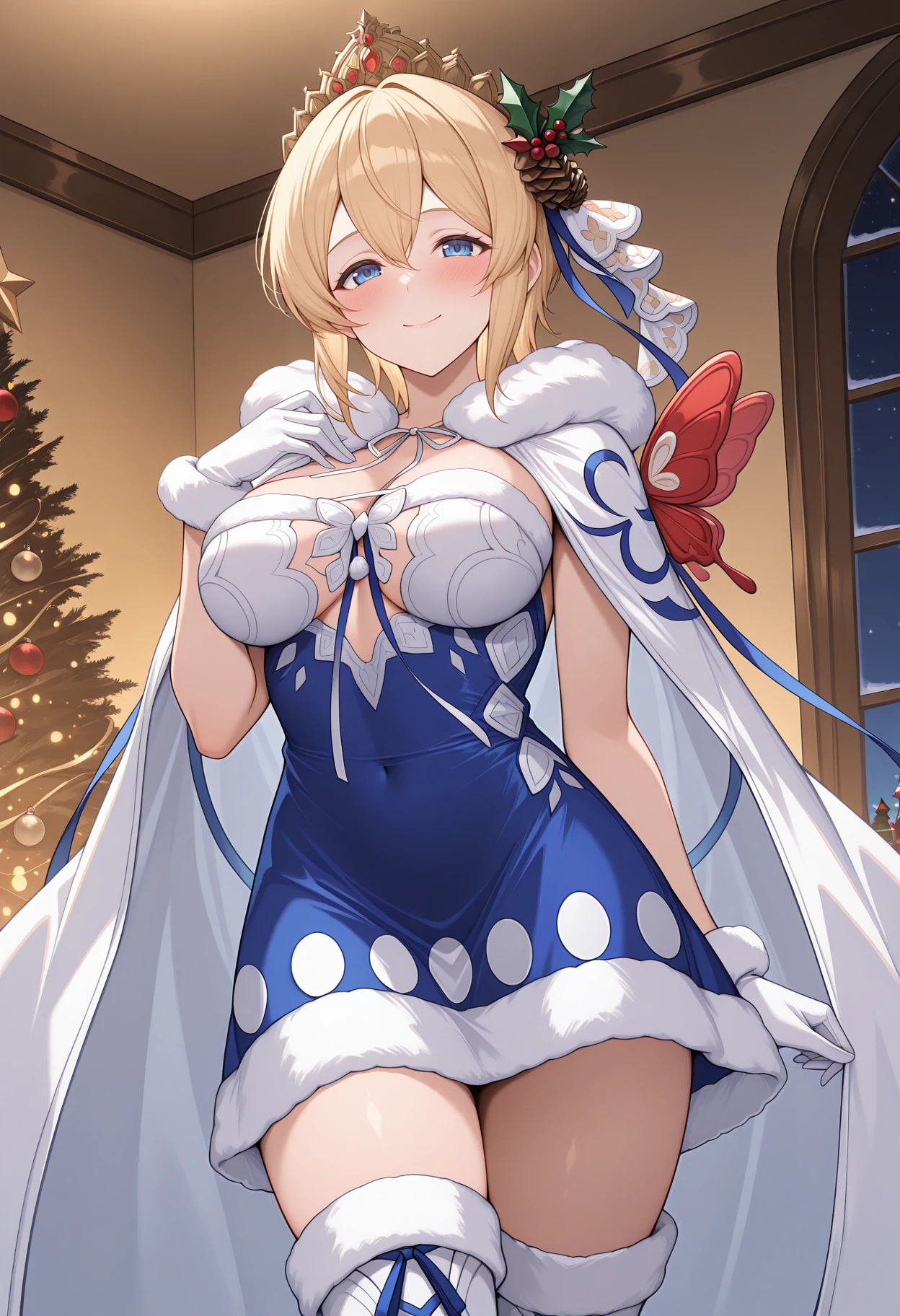 eurohol, hair flower, holly hair ornament, pinecone, blue dress, white dress, two-tone dress, white bandeau, white gloves, fur trim, white ribbon, blue ribbon, white cape, butterfly ornament, red butterfly, thigh boots,