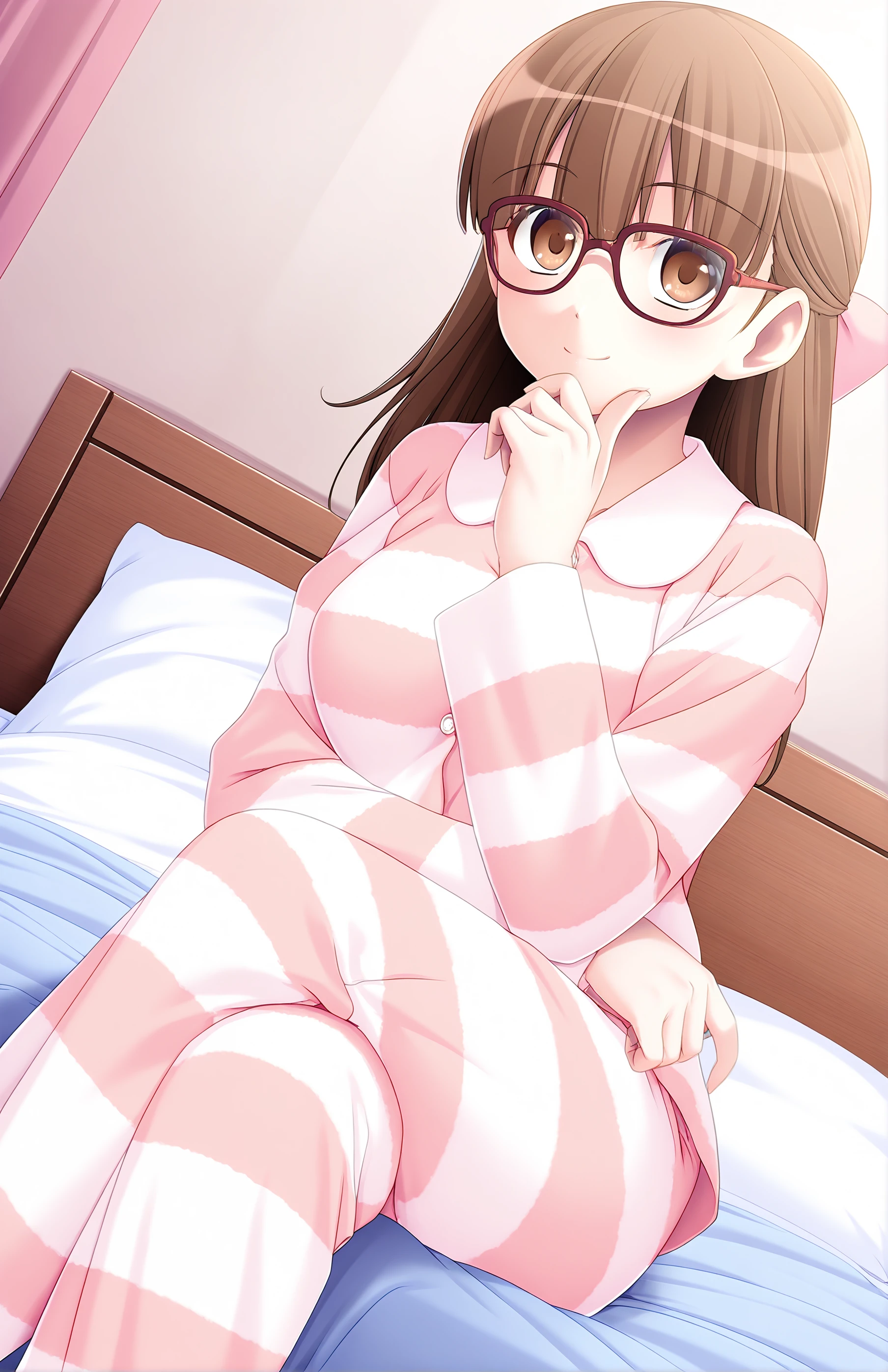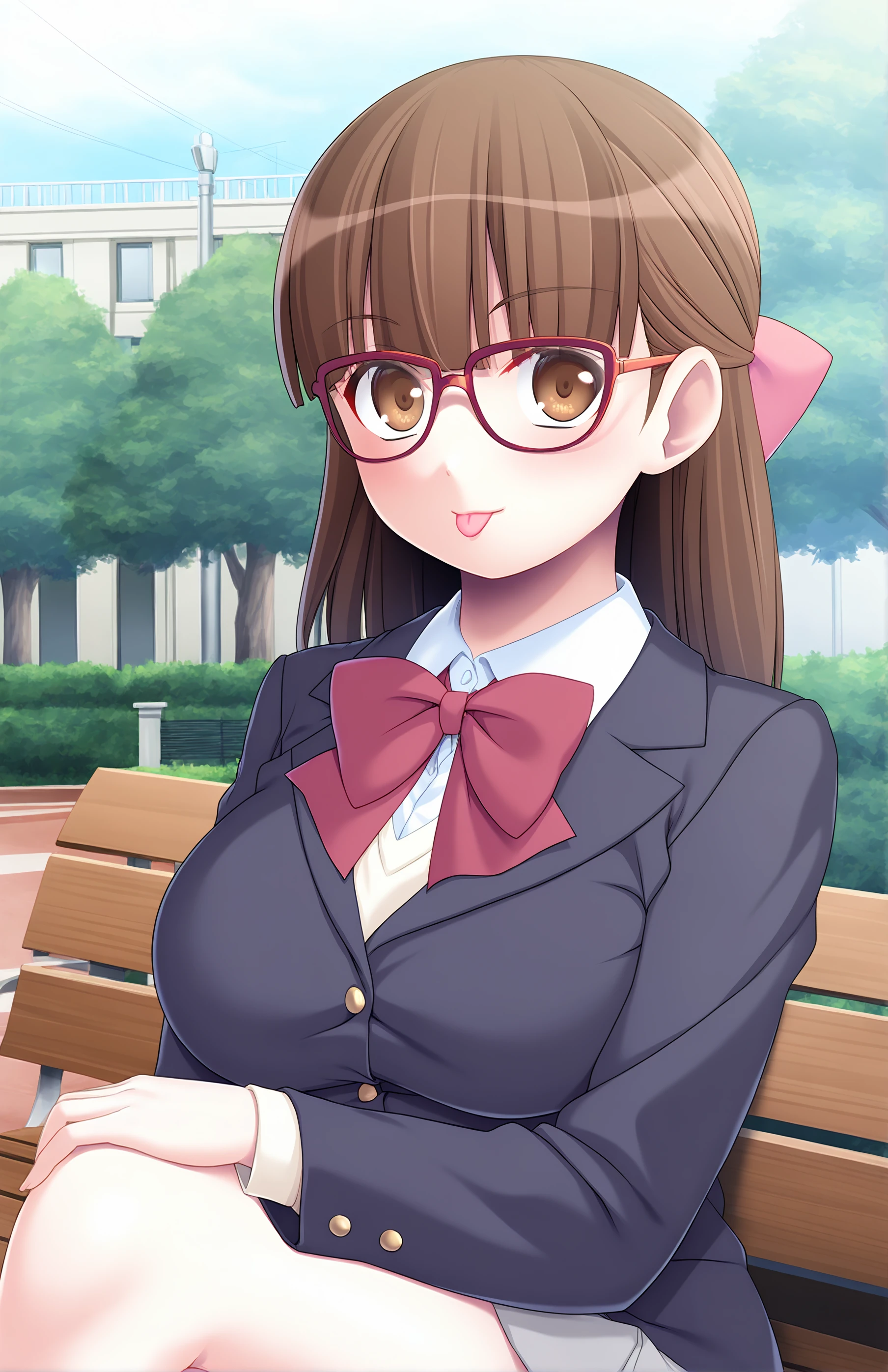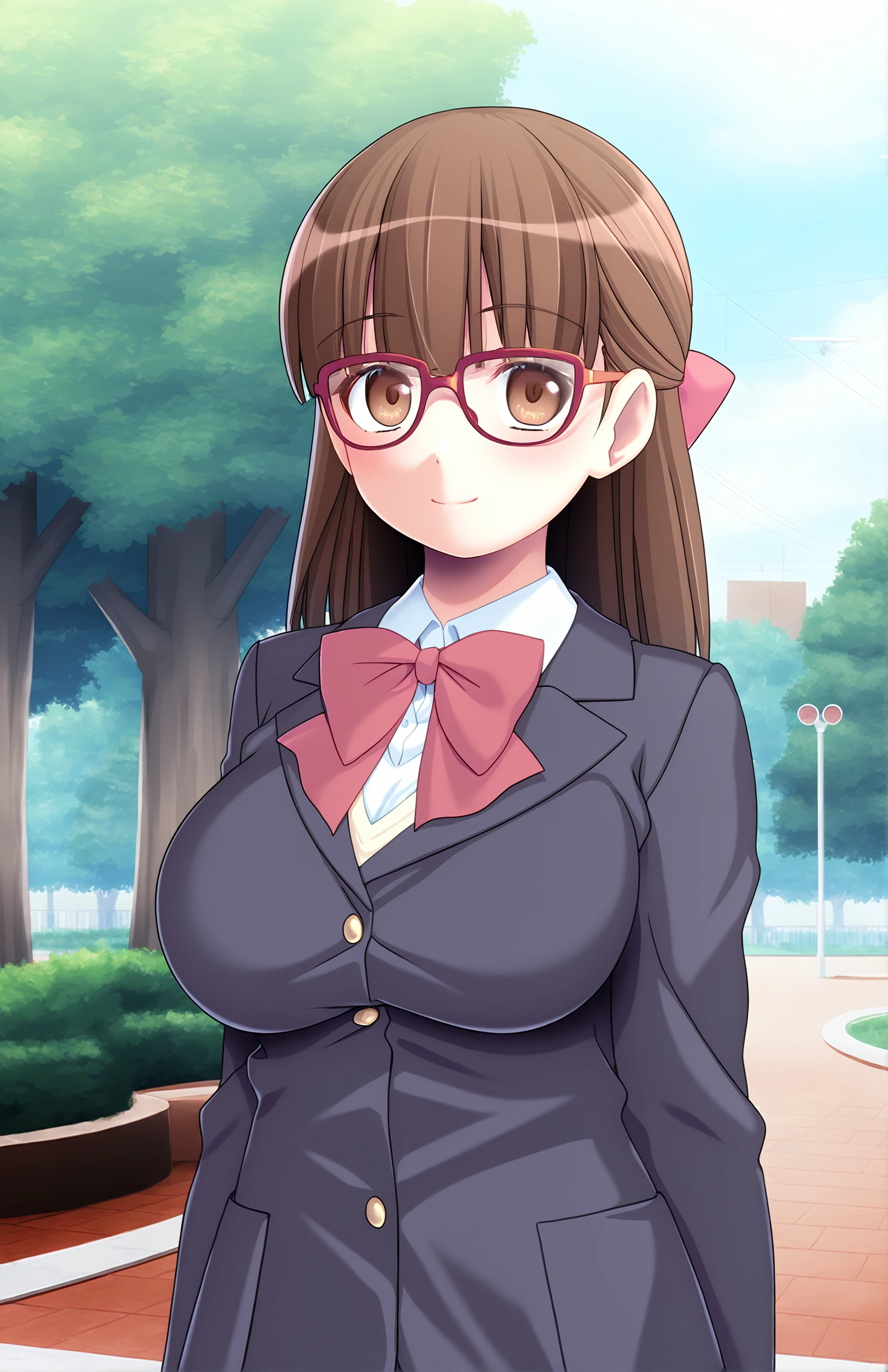 SaotomeKana, long hair, breasts, bangs, large breasts, brown hair, bow, brown eyes, white shirt, hair bow, glasses, red-framed eyewear