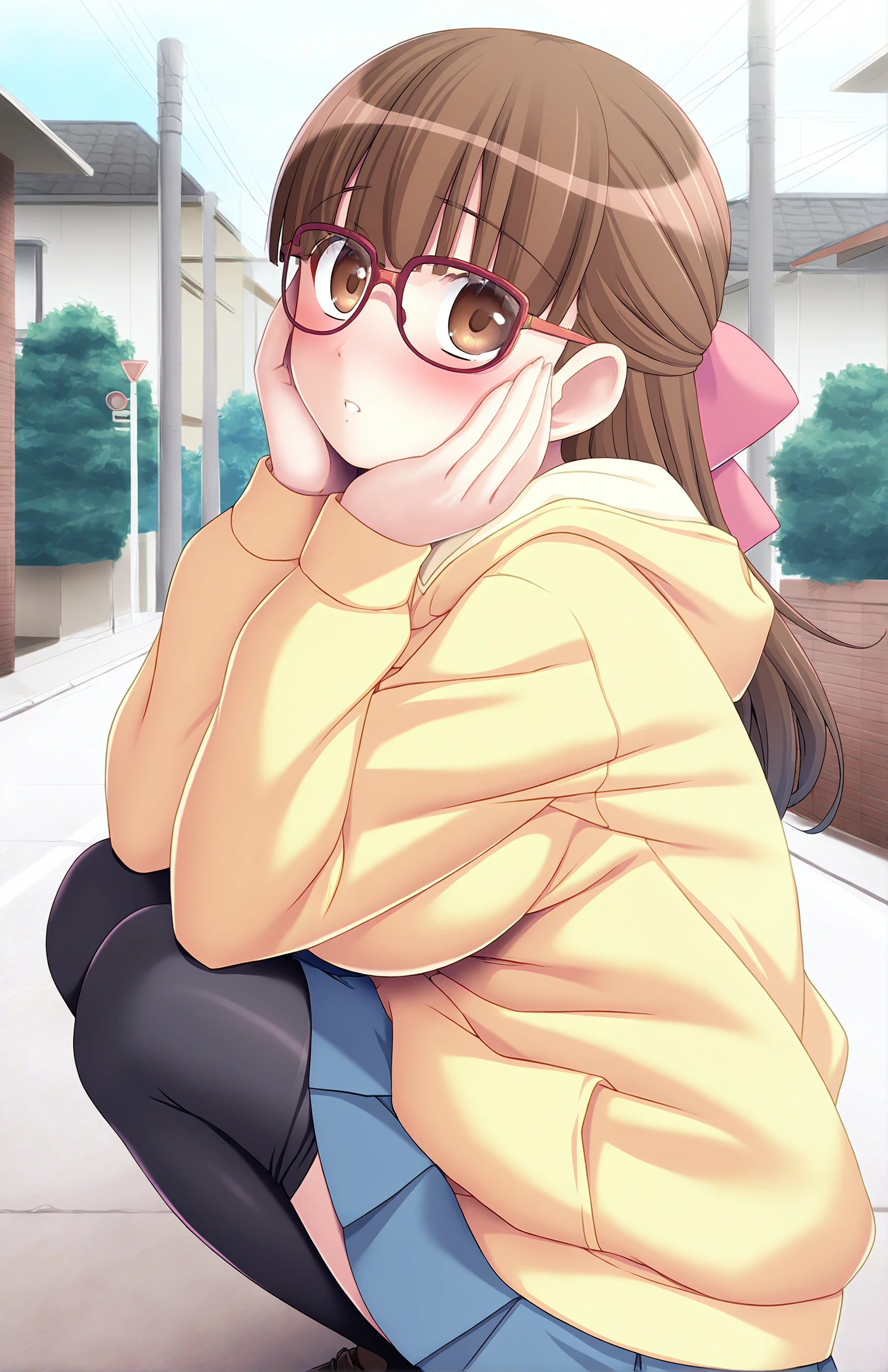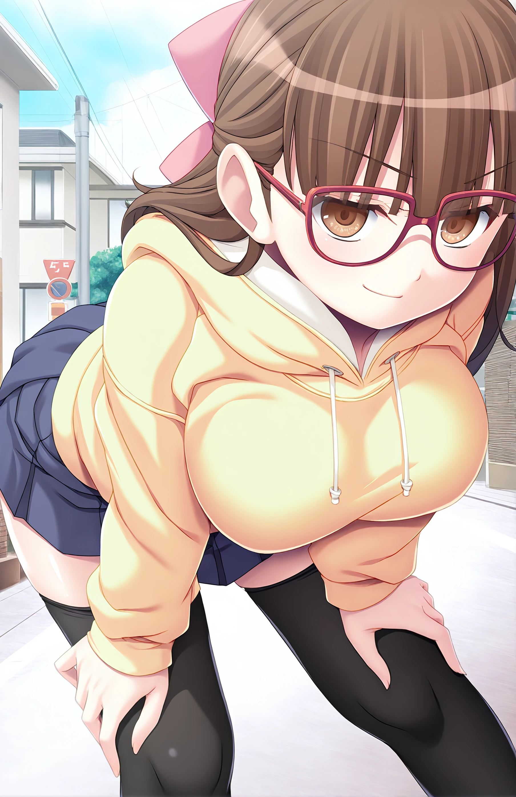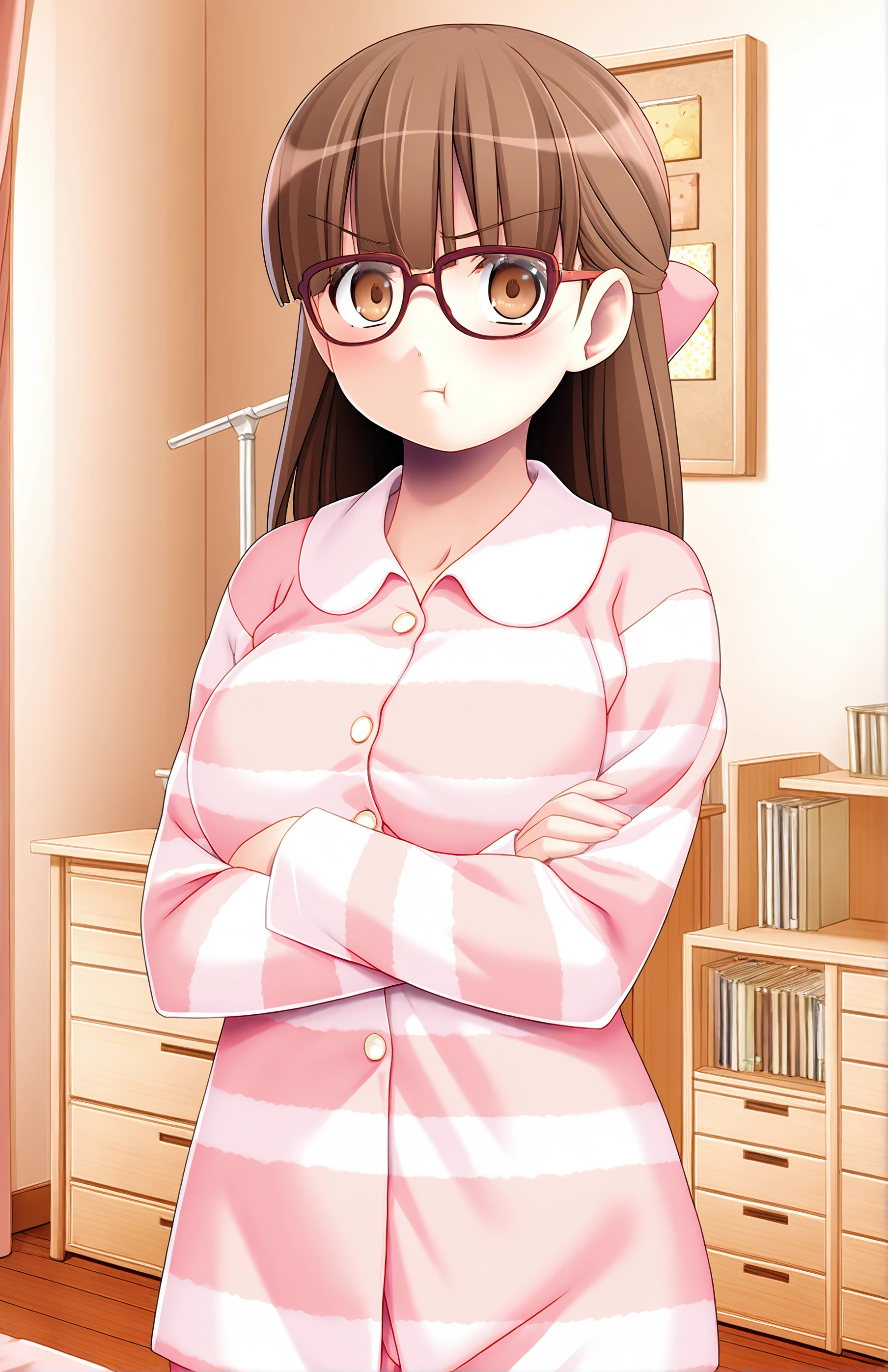 SaotomeKana, long hair, breasts, bangs, large breasts, brown hair, bow, brown eyes, white shirt, hair bow, glasses, red-framed eyewear