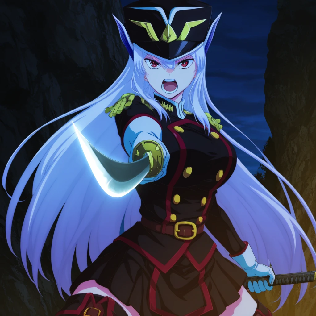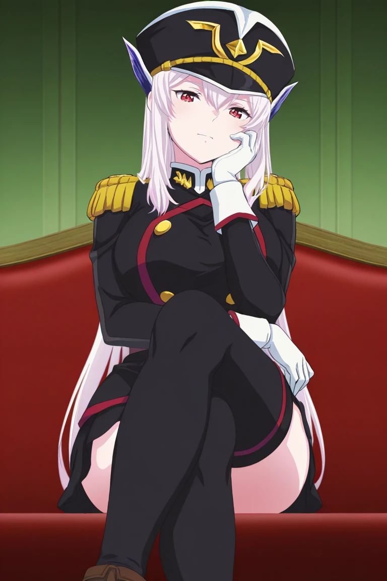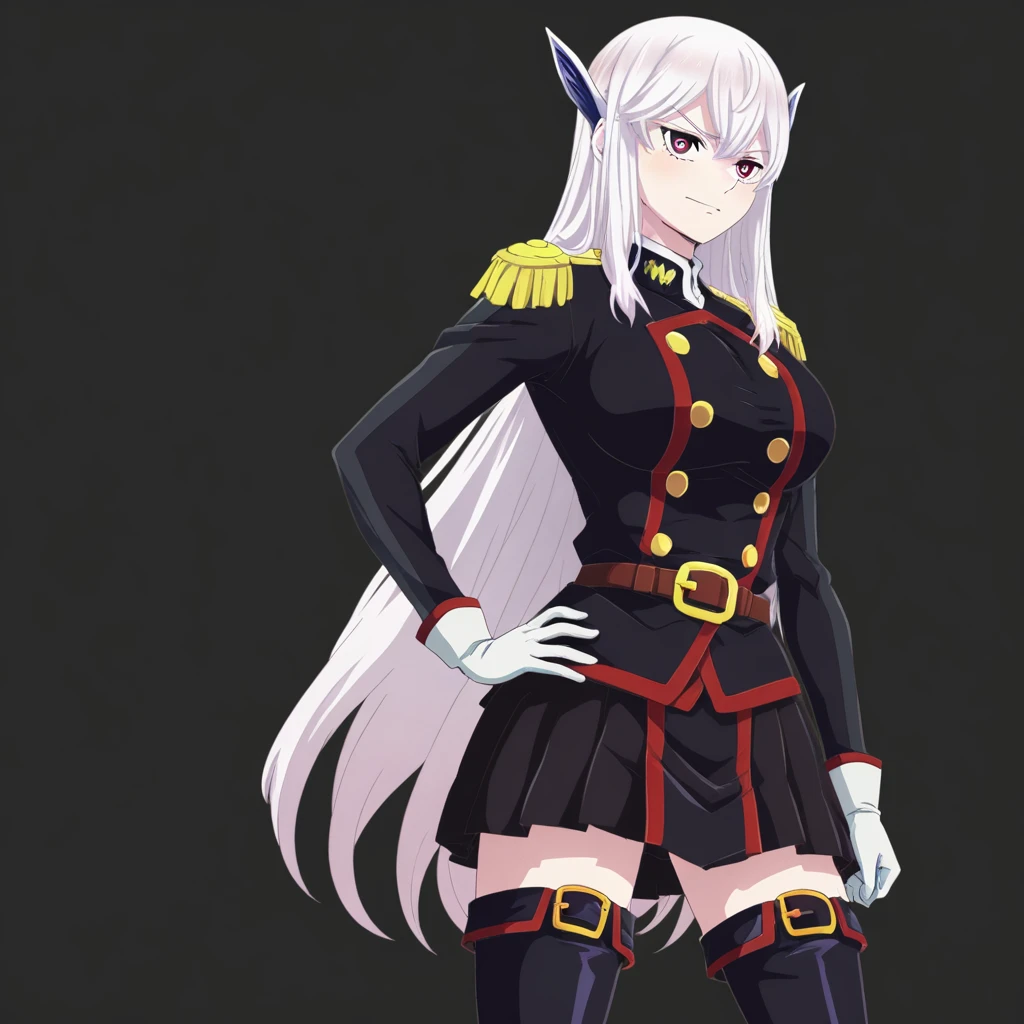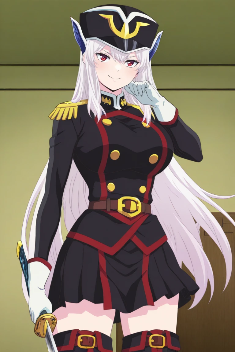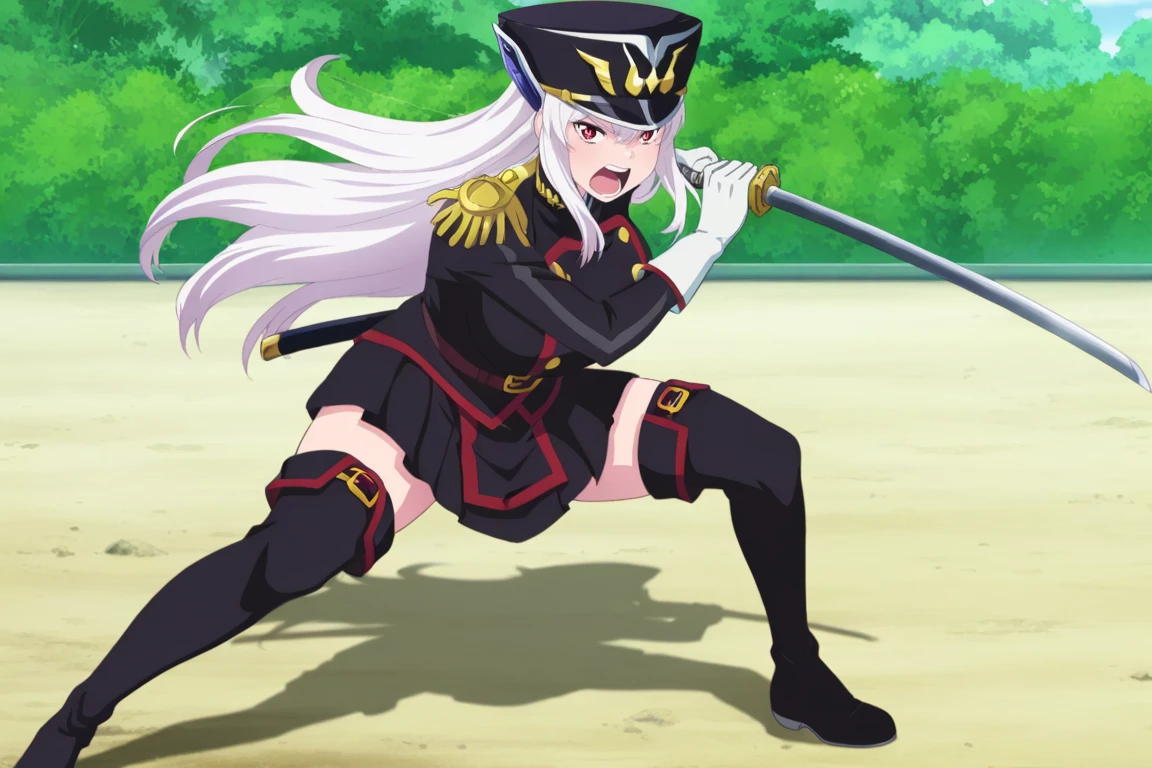 Outfit 1: military uniform, military cap, epaulettes, thighhighs, white gloves, boots, Katana,
