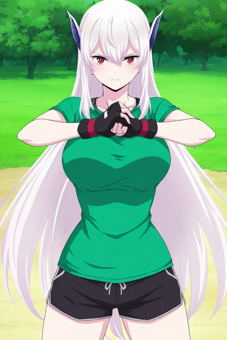 Outfit 2: Fingerless gloves, green tank top, shorts, sandles,