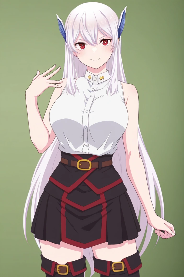 Outfit 4: sleeveless light green button-down shirt, black skirt, thighhighs, boots