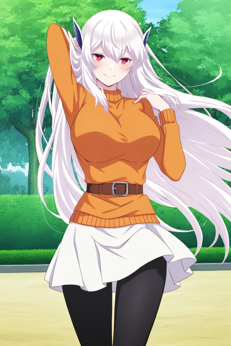 Outfit 3: Casual clothing, orange sweater, brown belt, white skirt, black leggings,