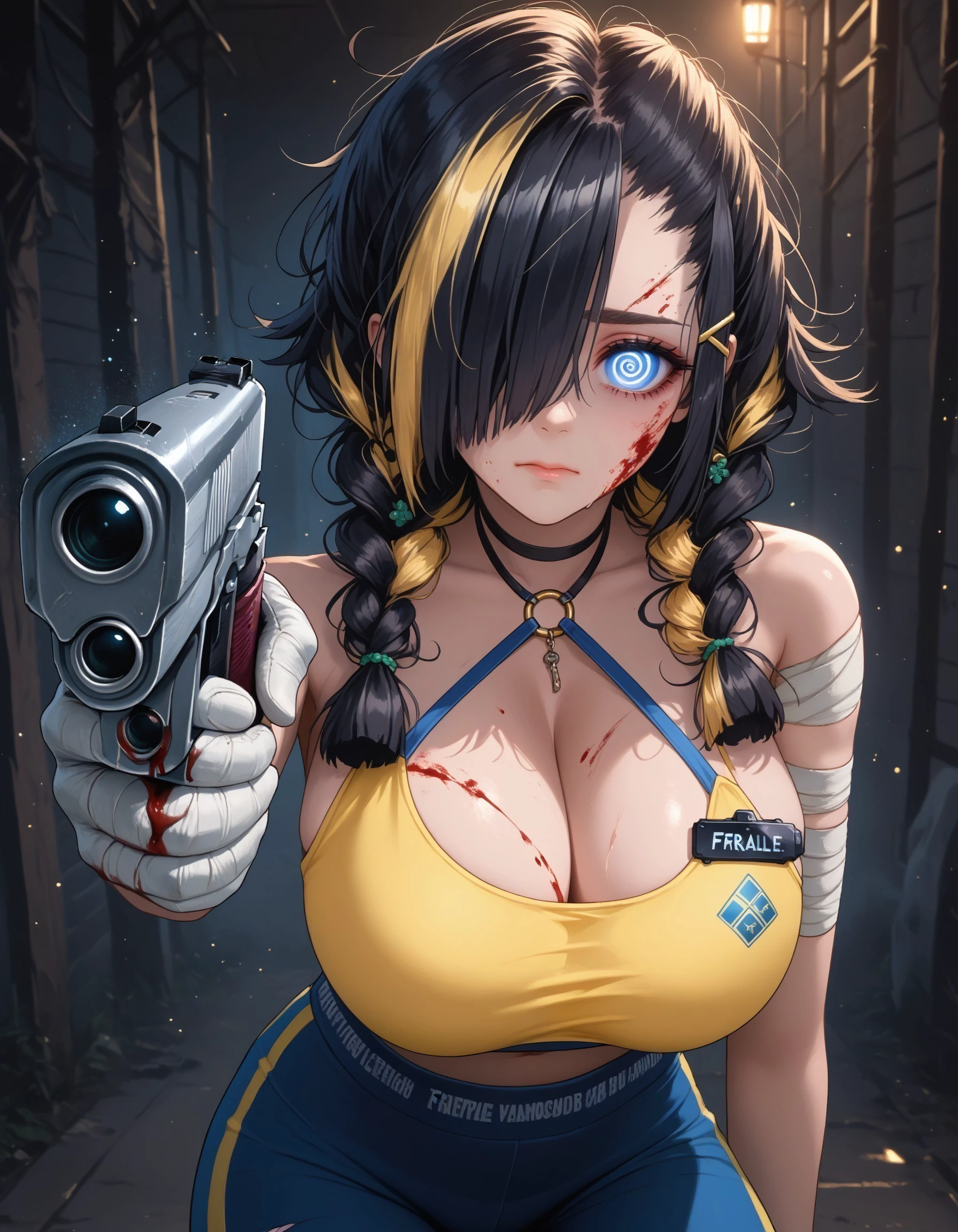 fragilenk, long hair, black hair, multicolored hair, hair ornament, hair over one eye, blue eyes, large breasts, yellow o-ring top, yoga pants, bandaged arm, helmet, white gloves