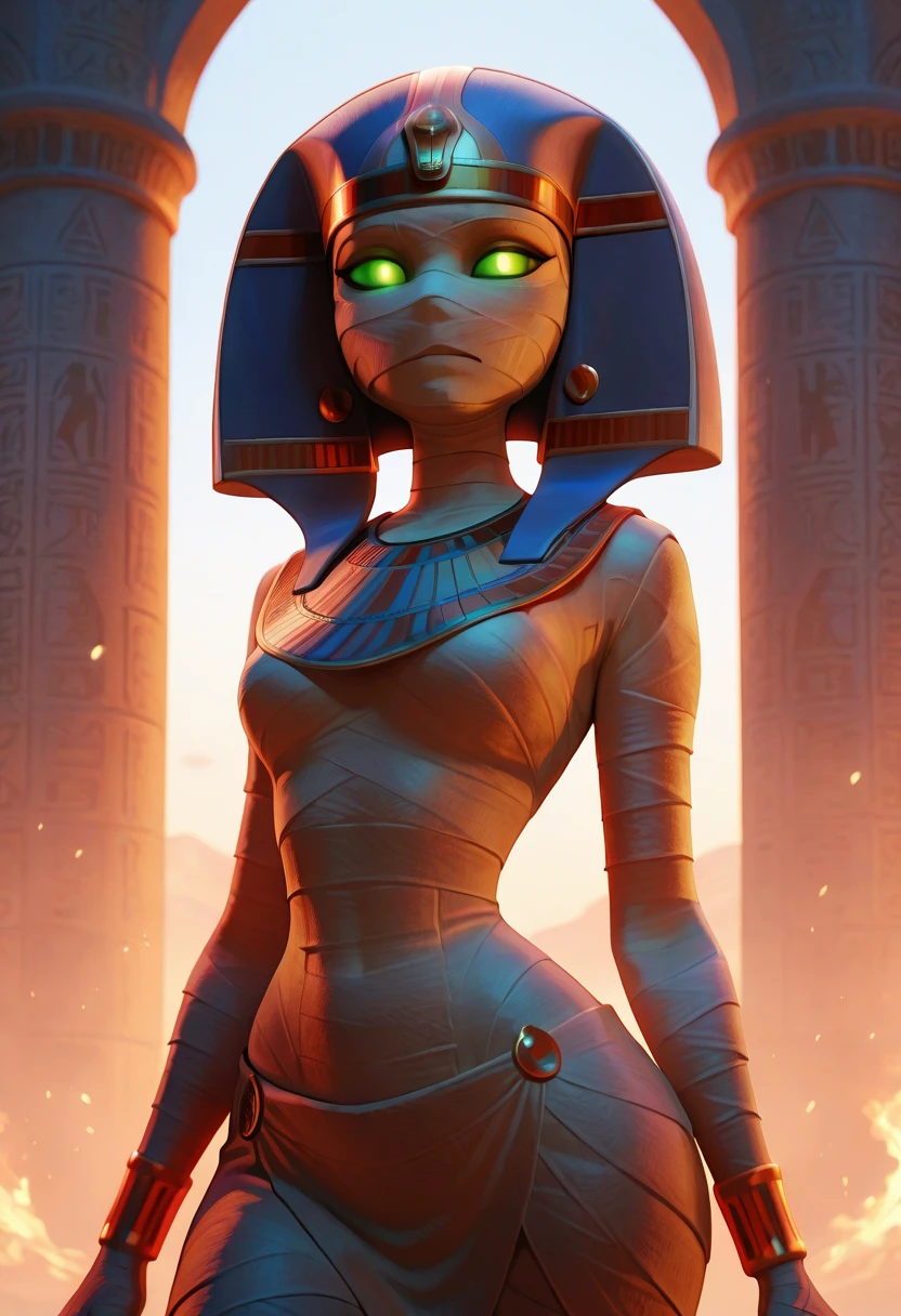 for illutrious:OGmummy, 1girl, medium_, solo, , bandages, wrapped_body, green_eyes, glowing_eyes, _clothing, ( clothing is just for all of her clothing accecory like her headgear etc ! )