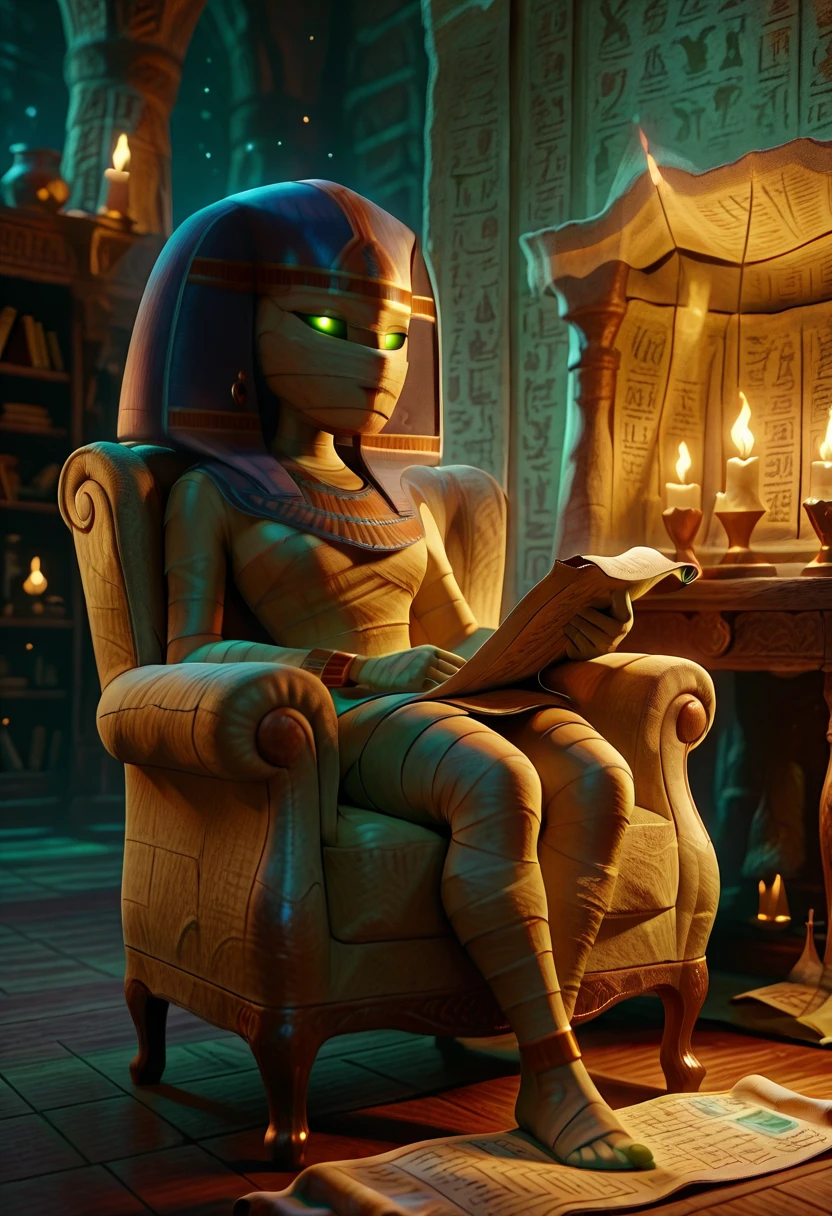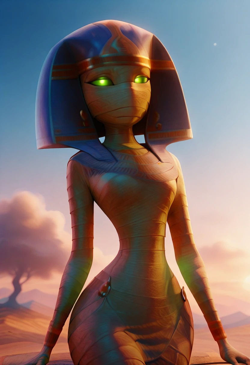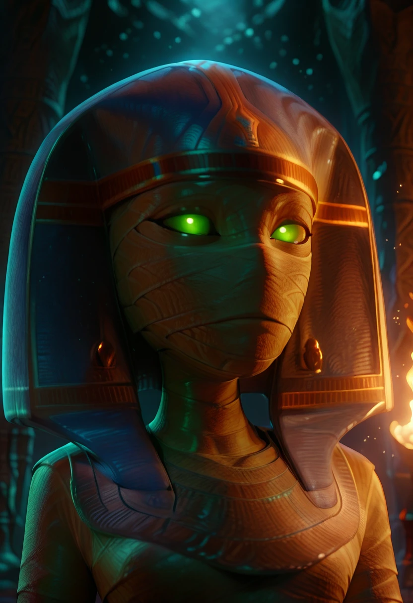 Complet exemple:A woman stands in a dark Egyptian temple. She is wrapped entirely in pale bandages that follow her slim figure. She has glowing green eyes visible through a slit in the bandages covering her face. She wears an Egyptian pharaoh nemes headdress in blue and gold. A wide ornate Egyptian collar necklace with blue and gold details sits around her neck and shoulders. Gold cuff bracelets on her wrists. Slim body wrapped in bandages. Dark ancient Egyptian temple interior with warm amber lighting. Cowboy shot. 3D CGI cartoon style.