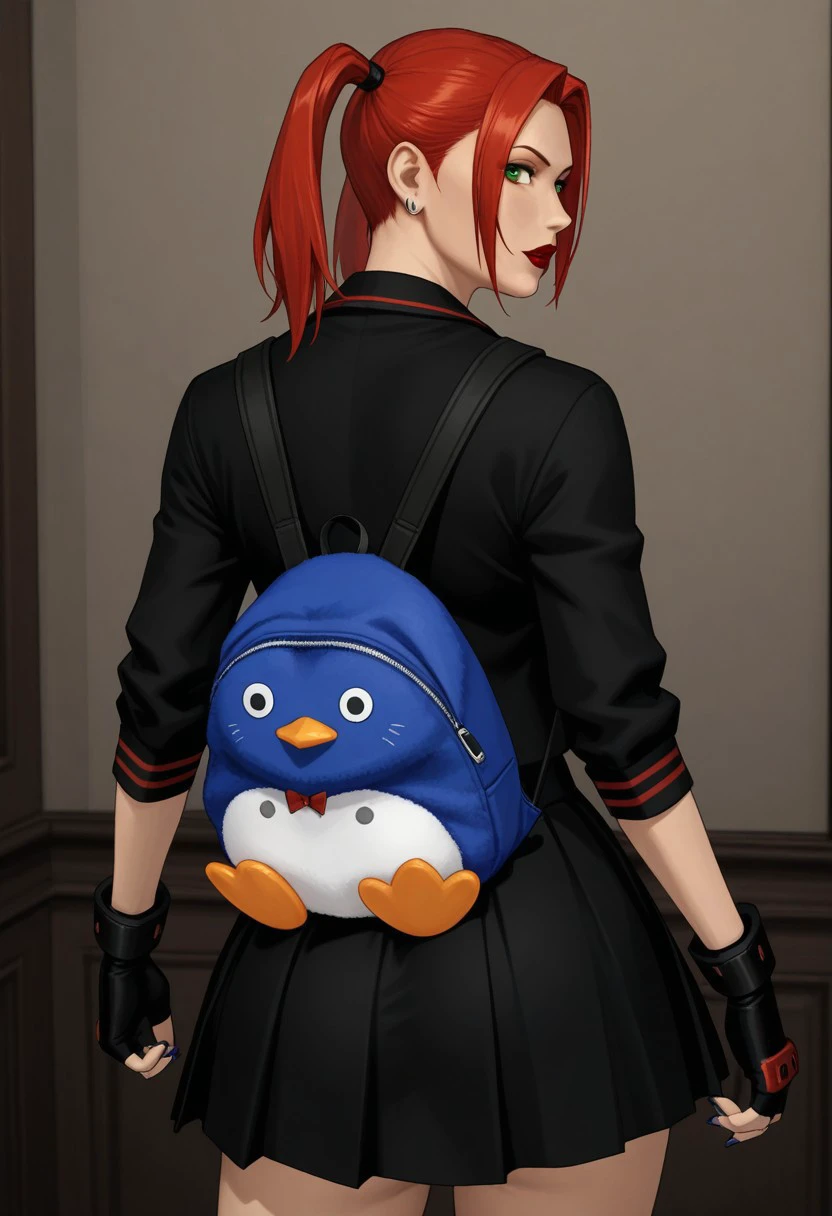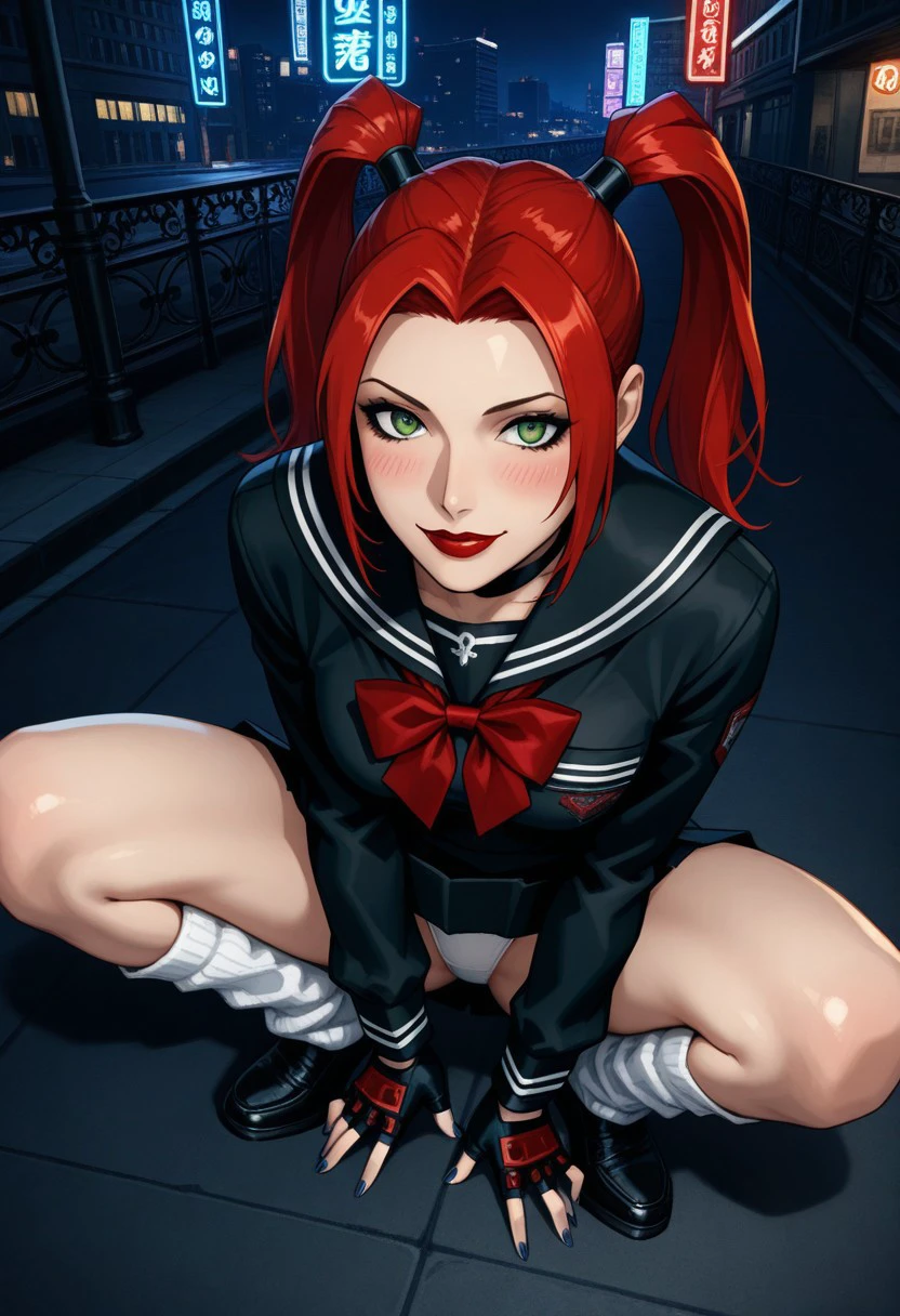 sgrayne, red hair, twintails, green eyes, red lipstick, red bowtie, fingerless gloves, black serafuku, long sleeve, black skirt, loose socks, black shoes