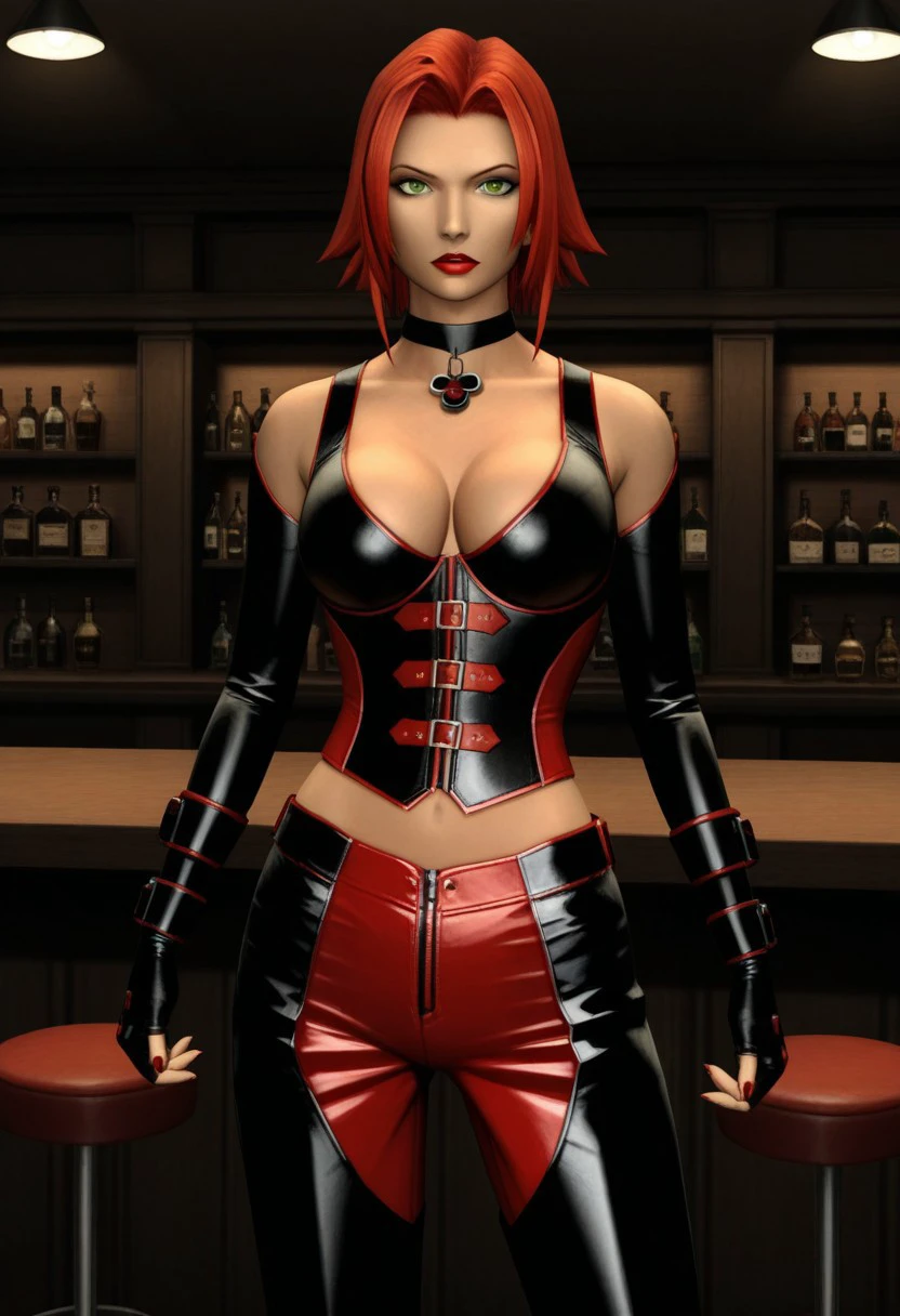 brayne, standard costume, green eyes, red lipstick, red hair, bob haircut, choker, two tone corset, elbow fingerless gloves, two tone pants, high heel boots