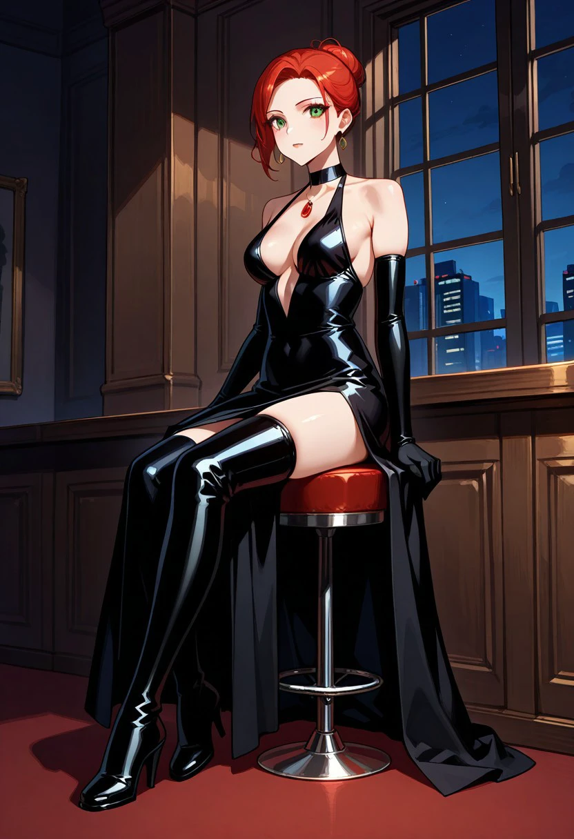 raynedress, red hair, hair bun, earrings, green eyes, evening gown, black dress, red pendant, elbow gloves, thigh boots