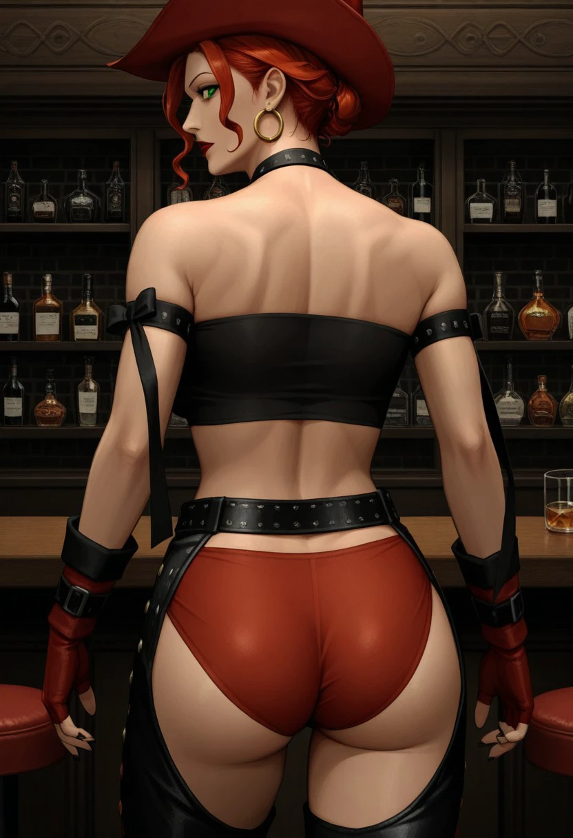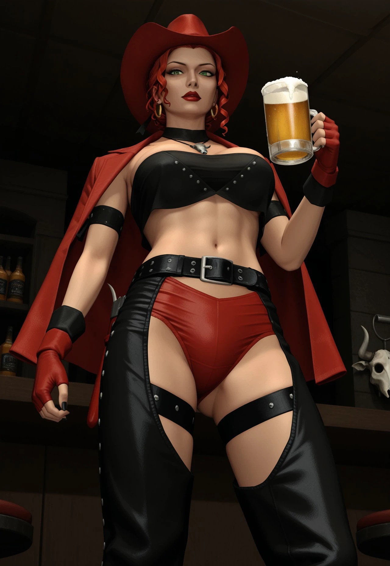 cgrayne, red hair, red curls, green eyes, red lipstick, cowgirl costume, necklace, cattle skull pendant, red cowboy hat, black tube top, red fingerless gloves with ribbons, midriff, belt, straps on shoulders, black chaps, red briefs, red cowboy boots