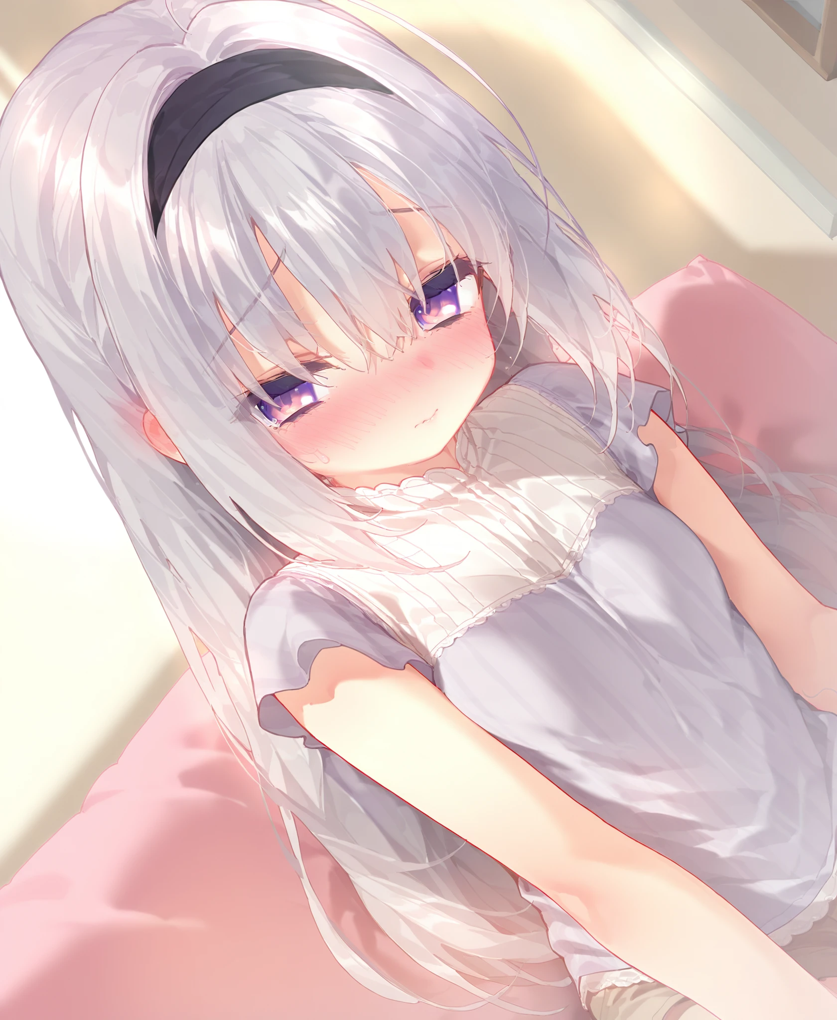 基础形象tag:manami, 1girl, solo, long hair, silver hair, purple eyes, blush