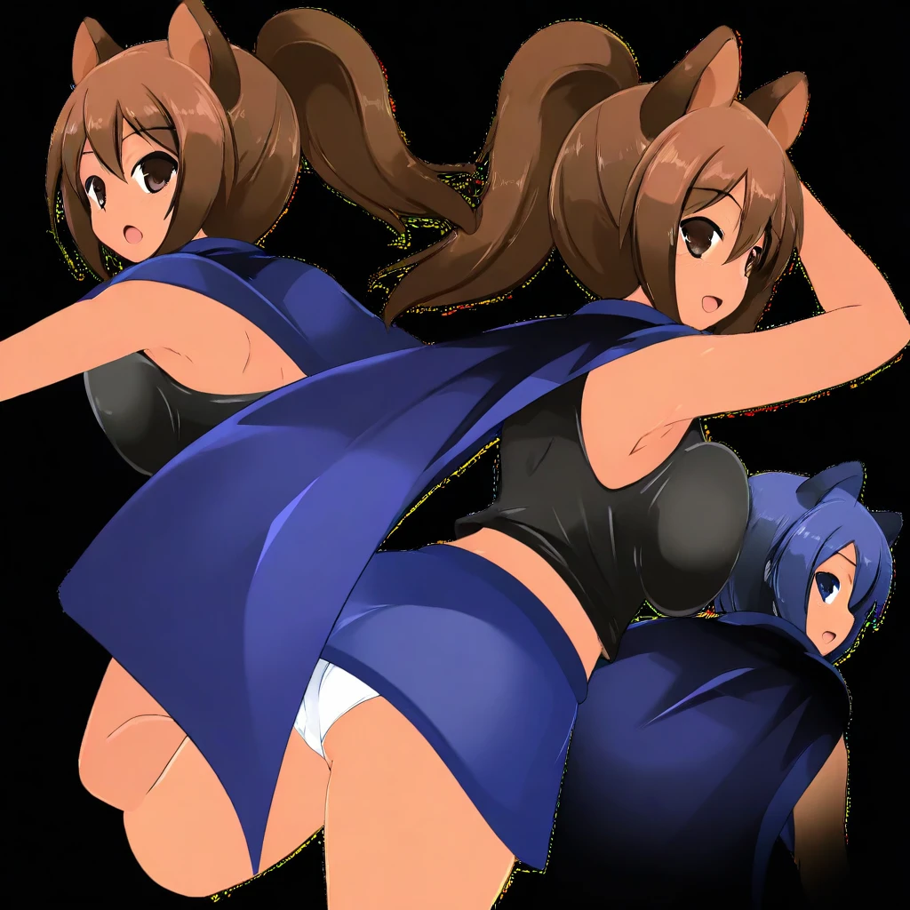 source_anime, Abigail, animal ears, horse ears, monster girl, taur, centaur,brown hair, blue top, midriff, armpits, full body, smile, bare shoulders, multiple girls