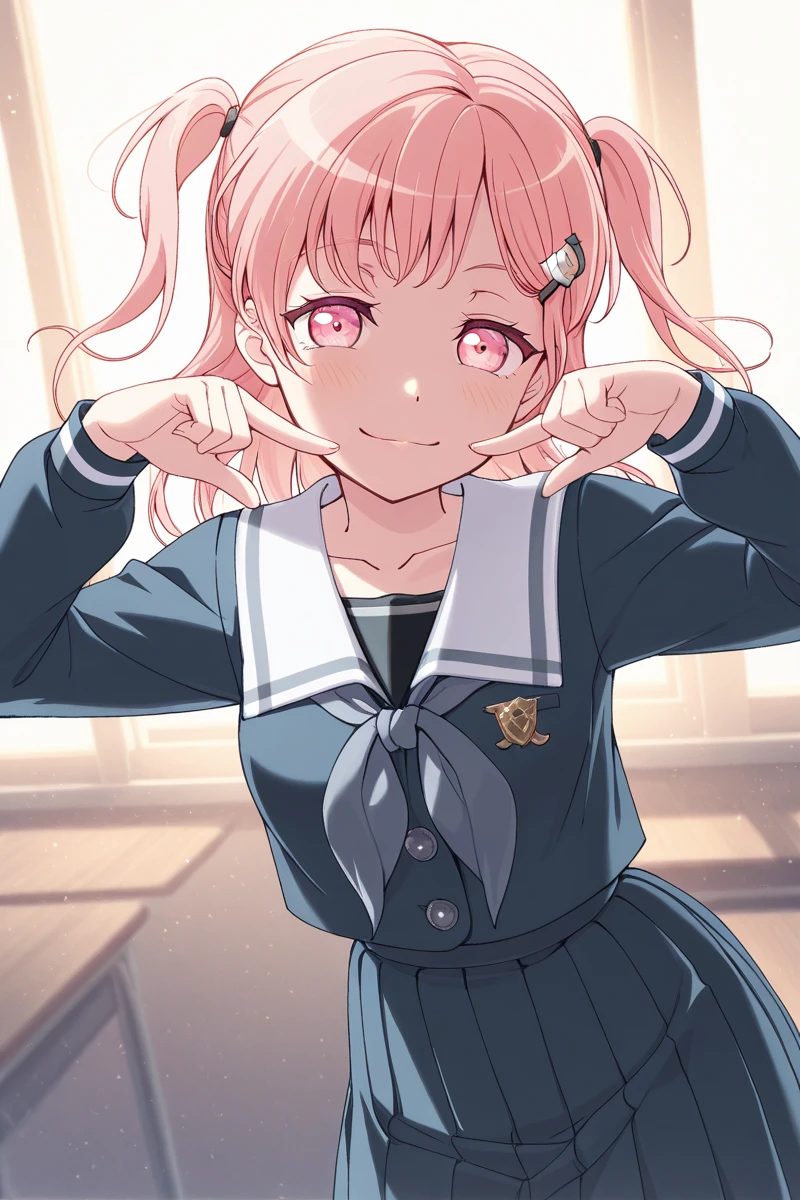 hiromachinanami, 1girl, solo, skirt, pleated skirt, smile, hair ornament, school uniform, neckerchief, looking at viewer, shirt, two side up, long sleeves, serafuku, bangs, collarbone, hairclip, sailor collar, tsukinomori school uniformDescription