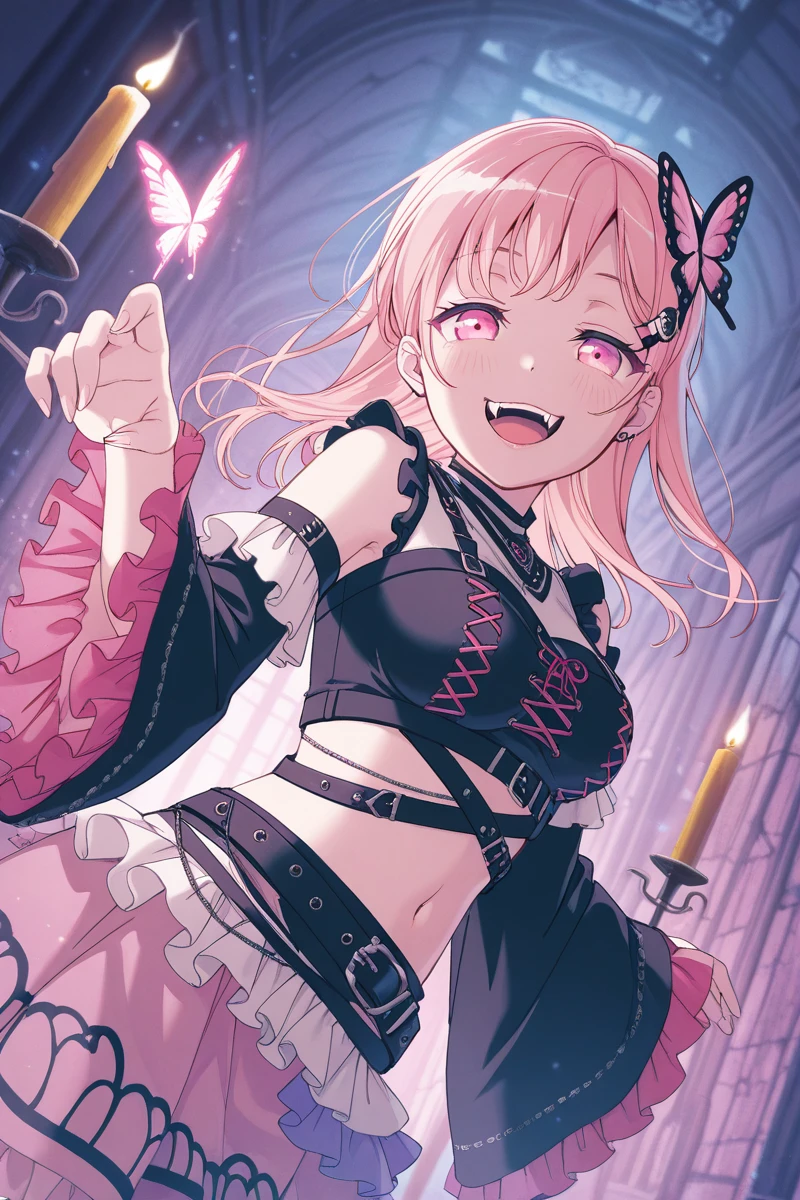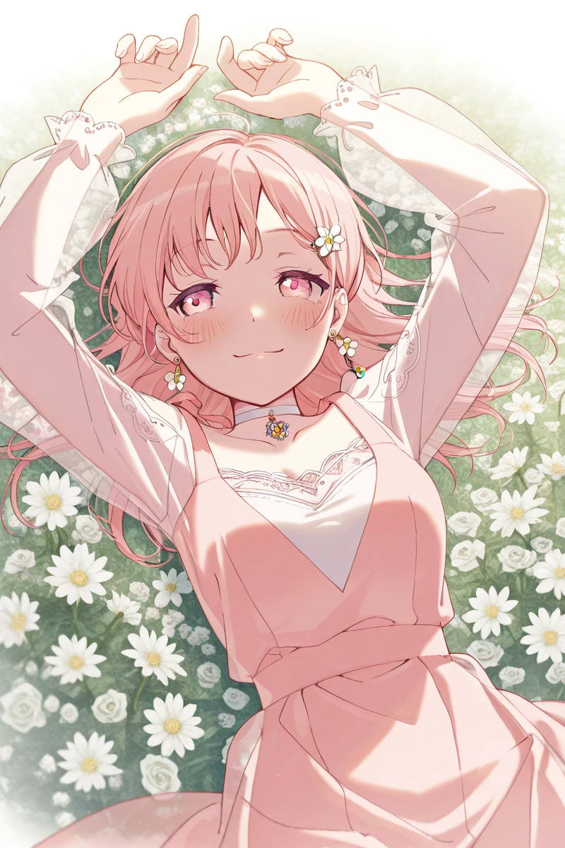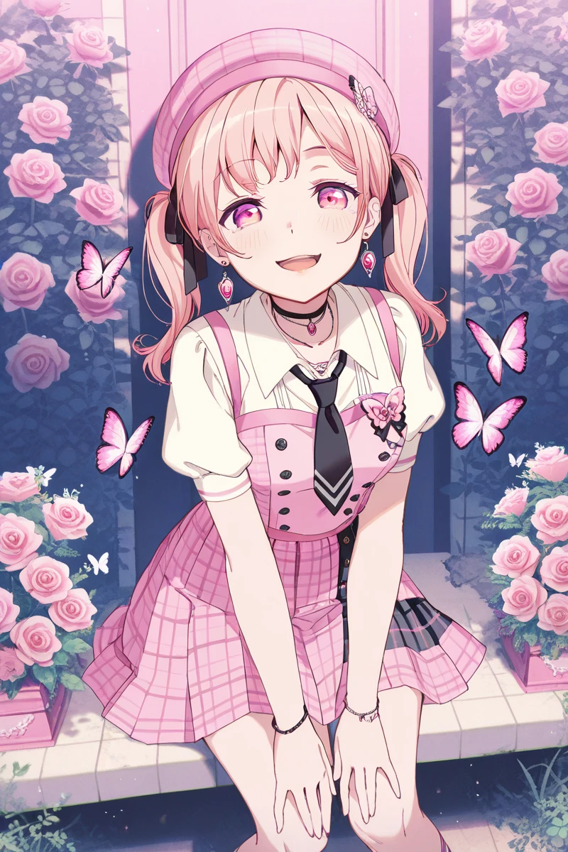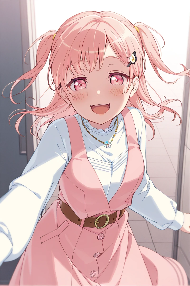 hiromachinanami, 1girl, solo, smile, dress, long sleeves, hair ornament, looking at viewer, jewelry, bangs, belt, two side up, blush, necklace, pink hair, pink dress, hairclip, shirt, medium hair, pink eyes, ribbon, white shirt, pinafore dress, cslskSchool uniform Nanami: