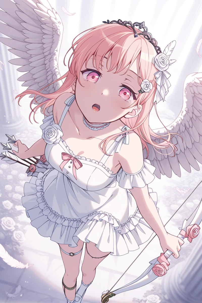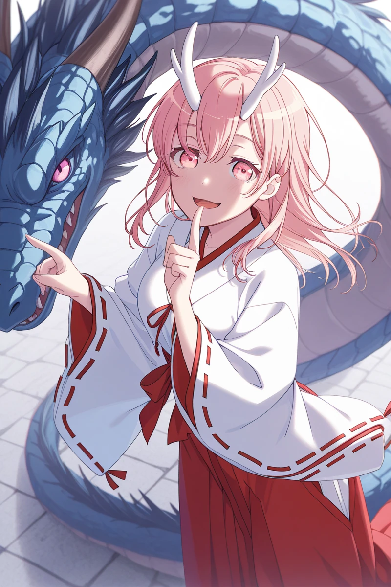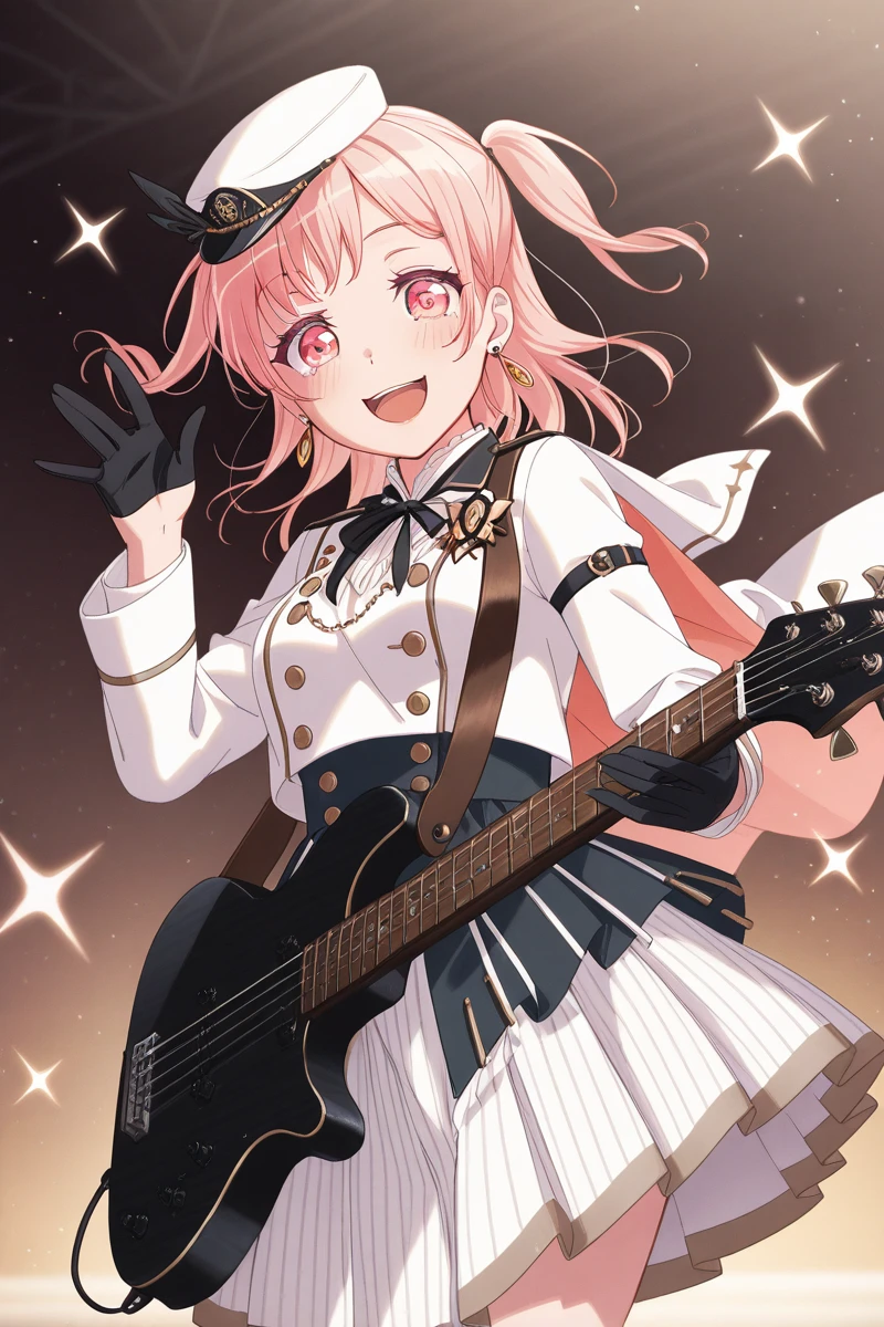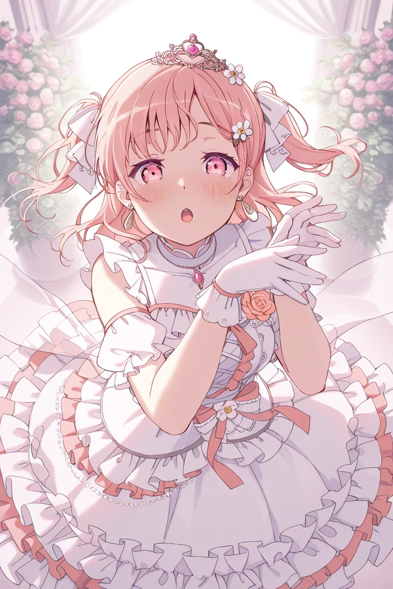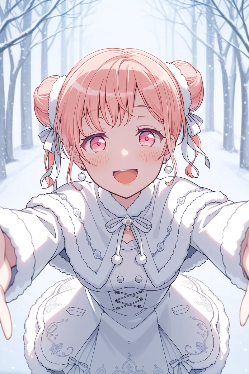 hiromachinanami, 1girl, solo, smile, dress, long sleeves, hair ornament, looking at viewer, jewelry, bangs, belt, two side up, blush, necklace, pink hair, pink dress, hairclip, shirt, medium hair, pink eyes, ribbon, white shirt, pinafore dress, cslskSchool uniform Nanami:
