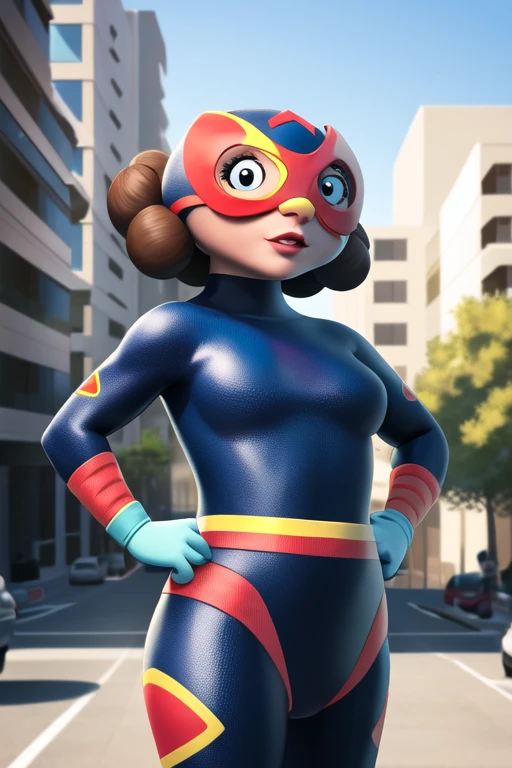 mamaLucha, disfraz, 1girl, solo, green bodysuit, mask, smileApoyame con un donativo en Ko-fi!