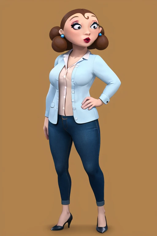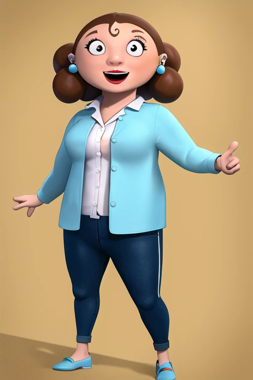 mamaLucha, 1girl, solo, short hair, brown hair, smile, jeans, collared shirtTraje Mamá Lucha