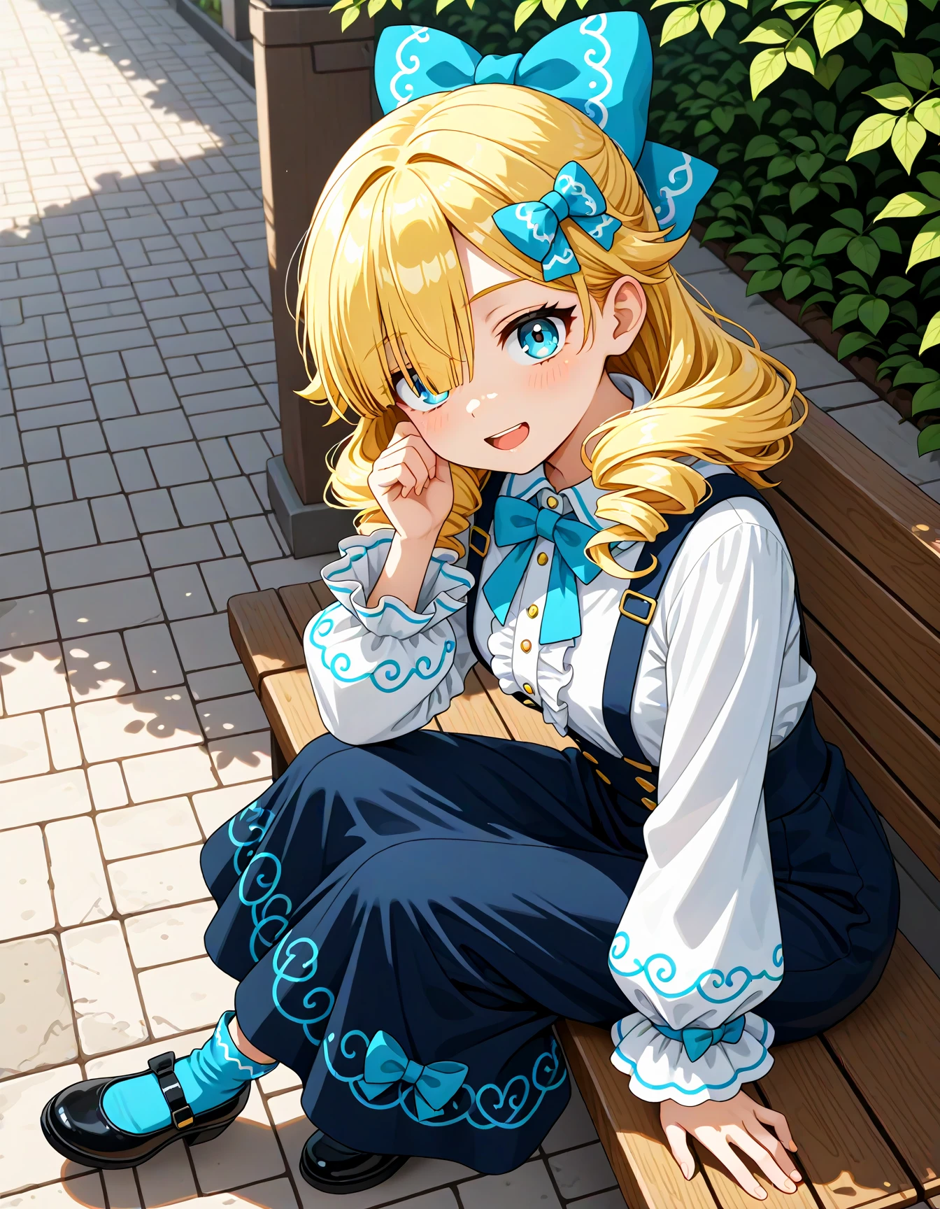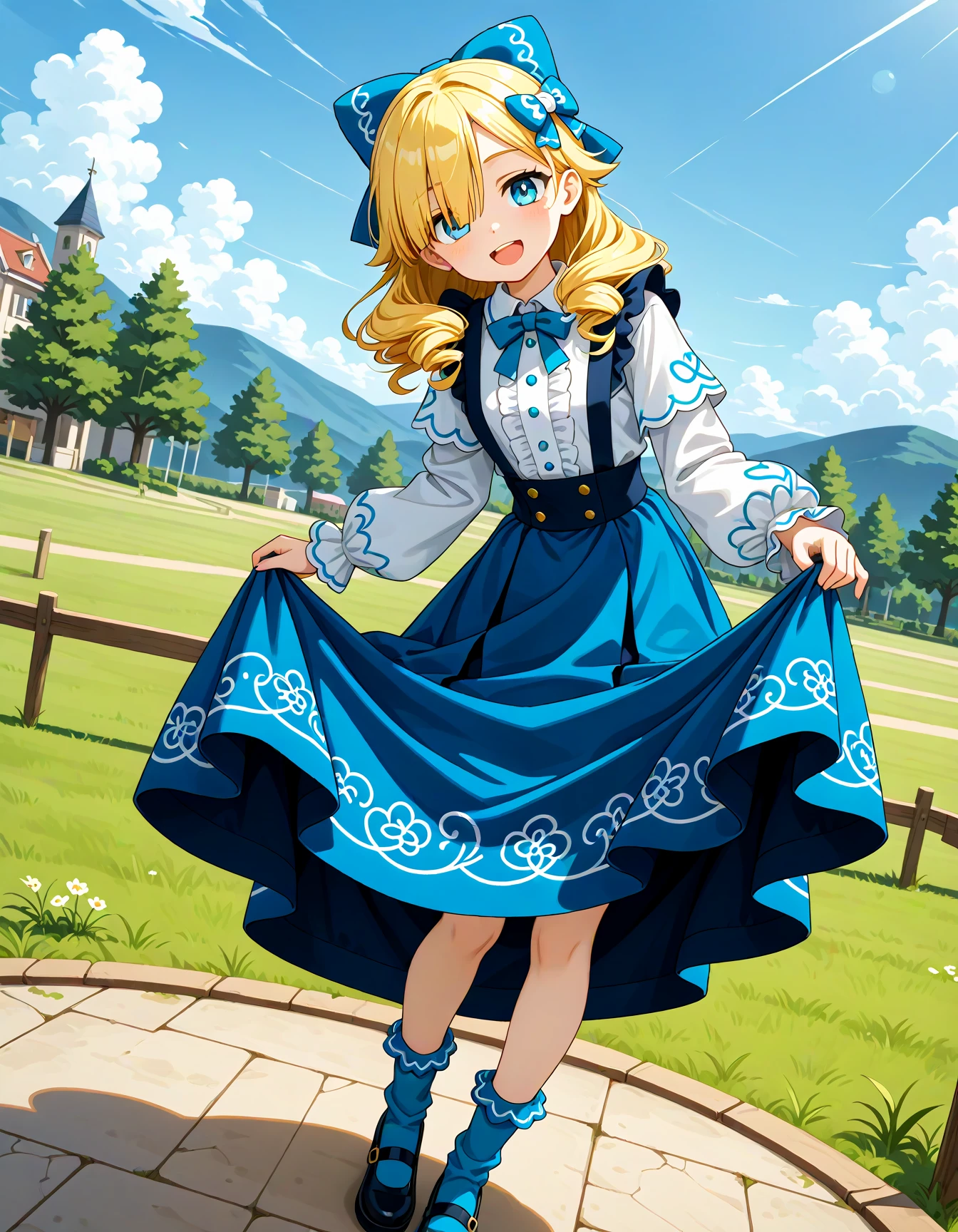 feemadel, sommadel, blue eyes, blonde hair, long hair, drill hair, hair over one eye, hair bow, blue bow, hair ornament, dress, center frills, long skirt, blue skirt, suspenders, suspender skirt, white shirt, frills, long sleeves, puffy sleeves, black footwear, shoes, blue socks,
