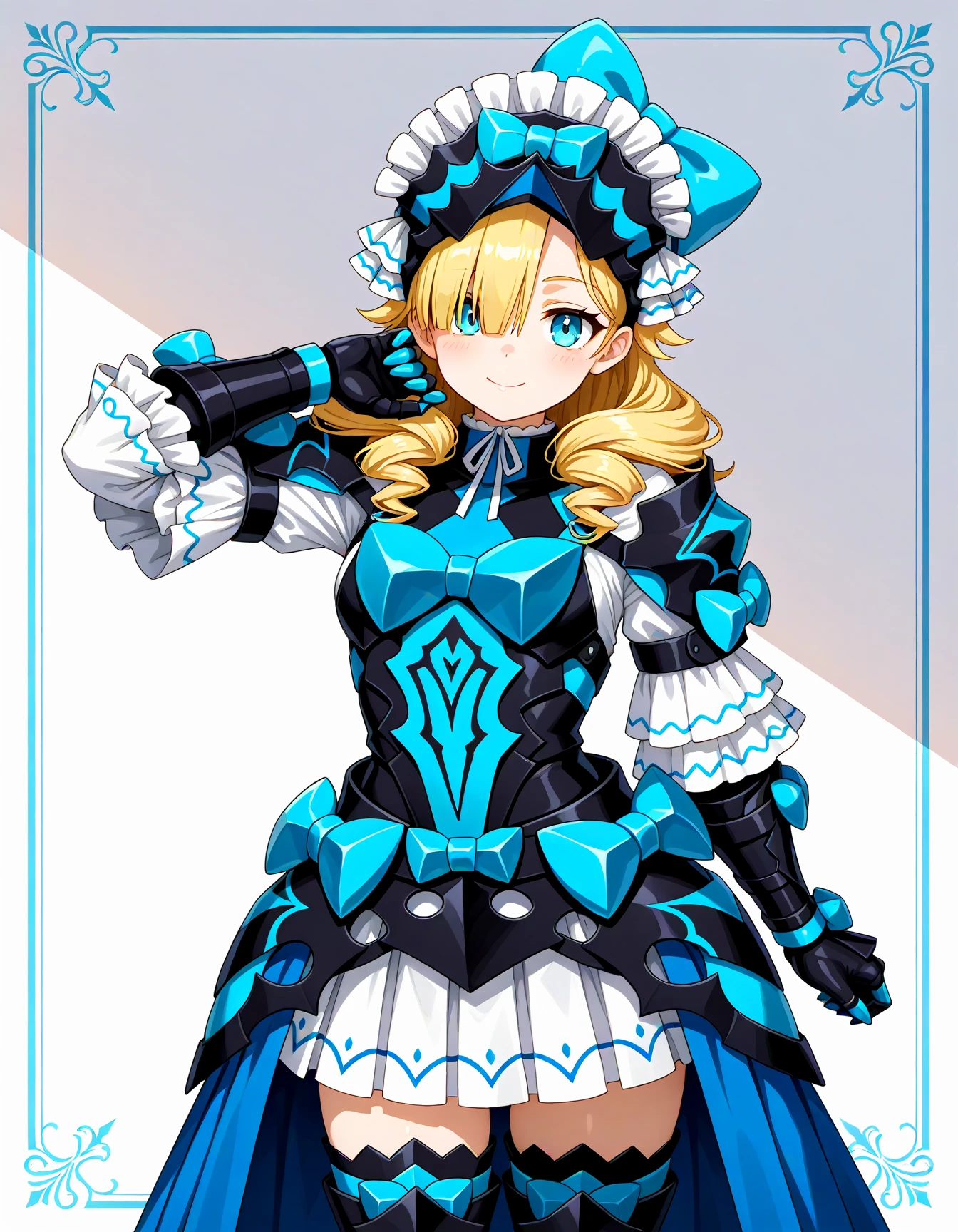 feemadel, defmadel, blue eyes, blonde hair, long hair, drill hair, hair over one eye, blue armored dress, armored dress, blue bow, frilled headwear, blue footwear, armored boots, blue boots, bow, frills, dress,