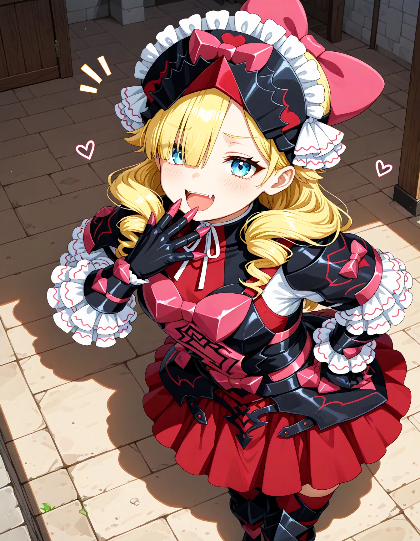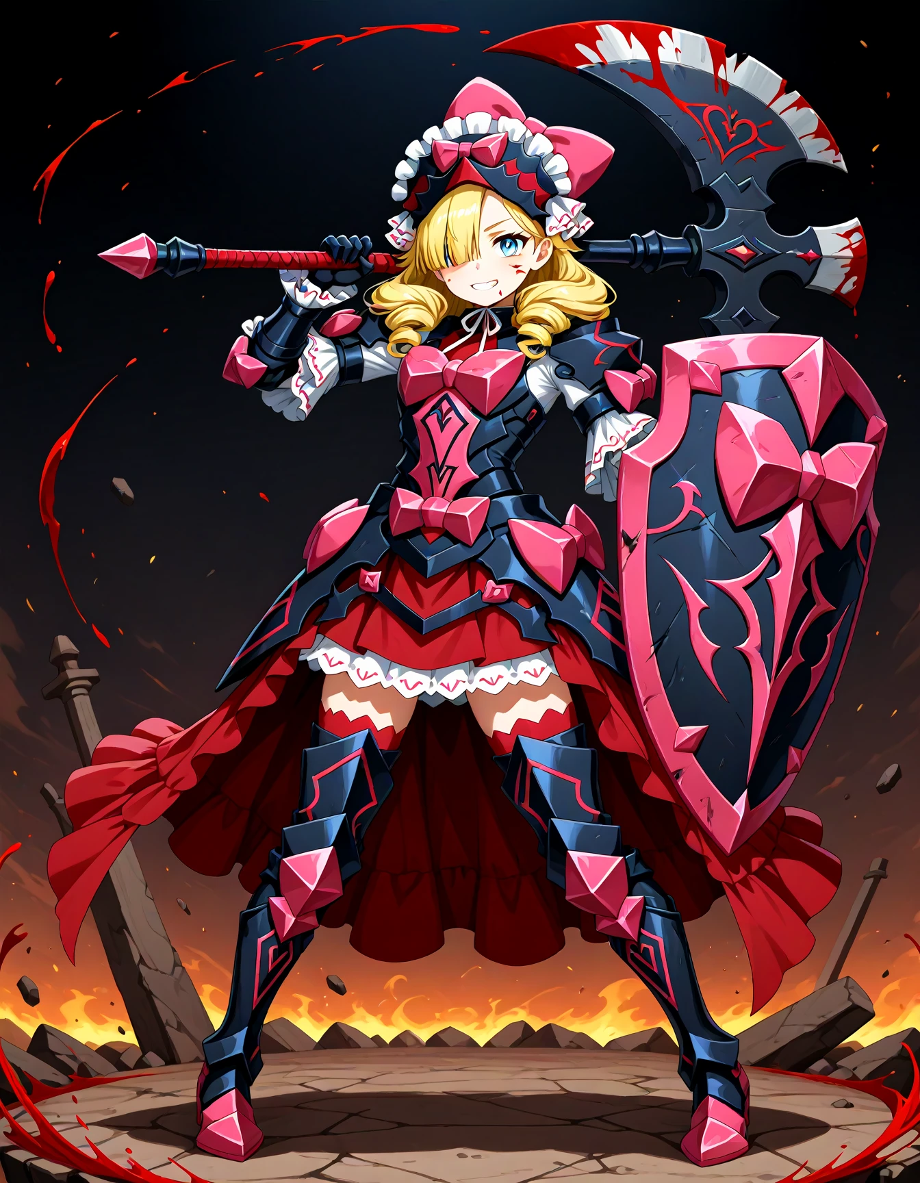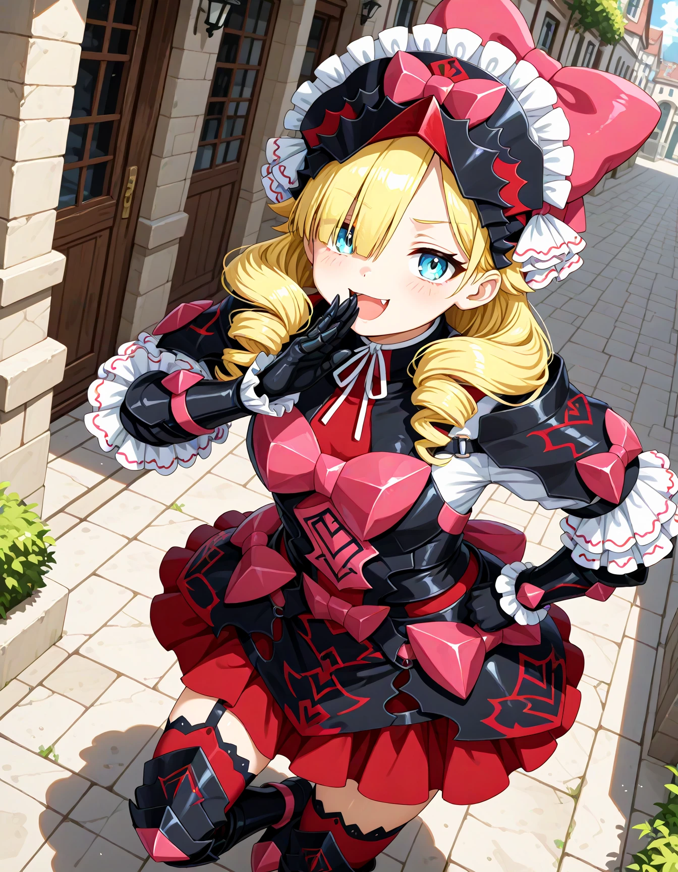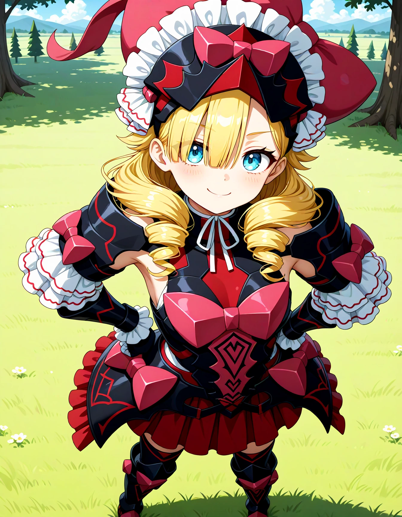 defmarni, blue eyes, blonde hair, long hair, drill hair, hair over one eye,red armored dress, armored dress, pink bow, frilled headwear, red footwear, armored boots, bow, frills, dress,